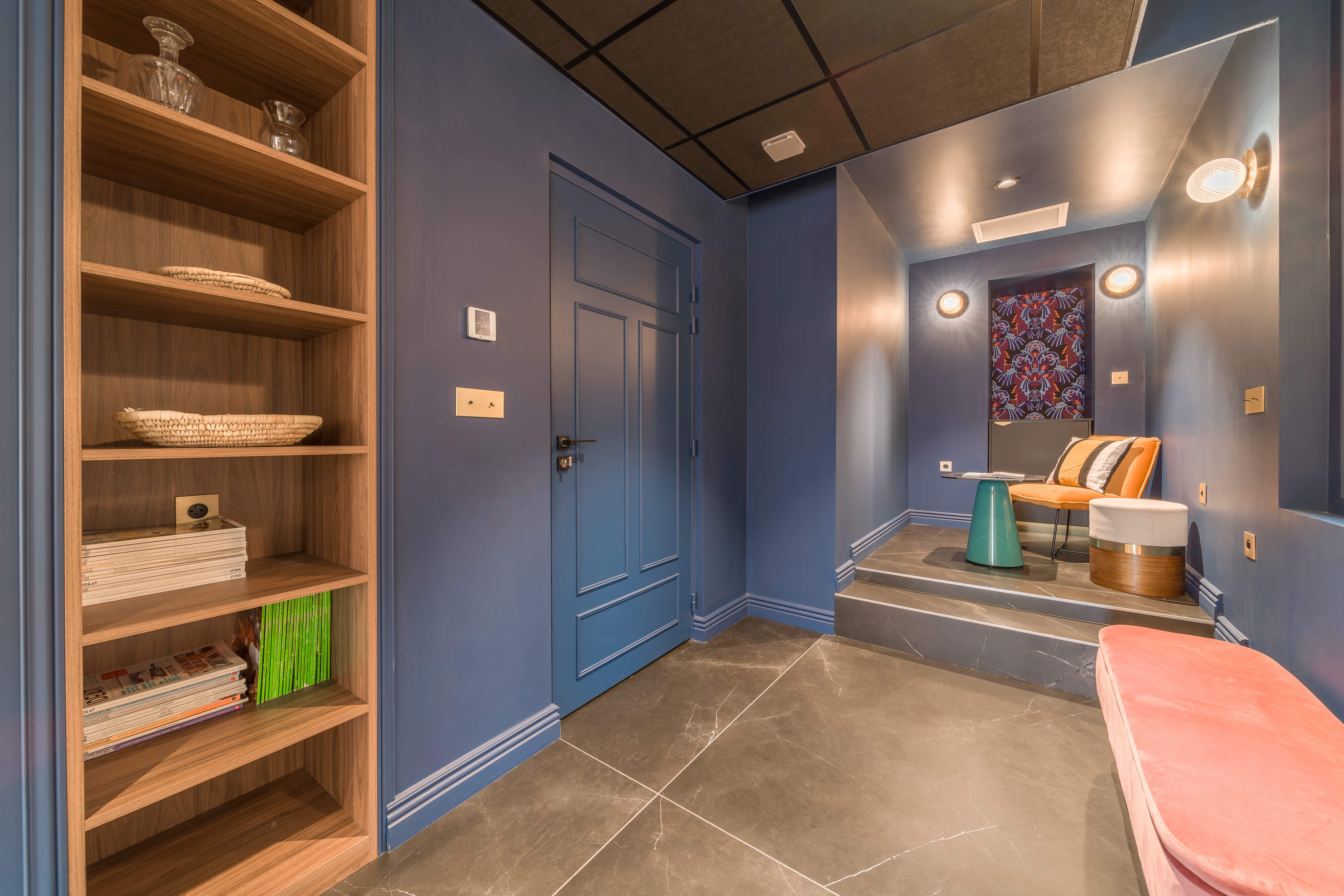 - ENTREE/COIN LECTURE (sol : carrelage / murs : peinture) : table, étagère et canapé.