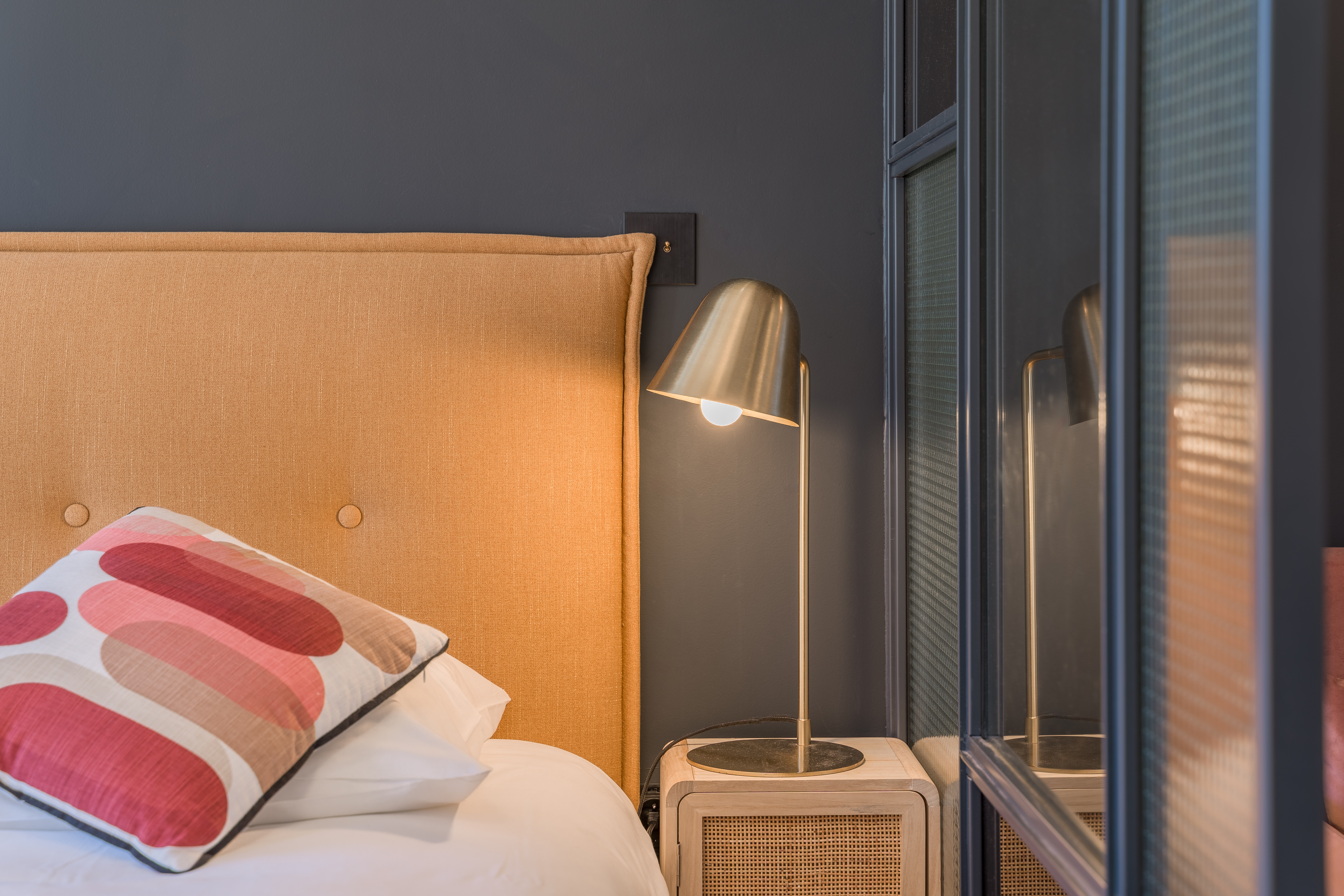 *Espace séjour : TV/TNT écran plat fixé au mur, canapé d'angle, table basse, lampe sur pied, table à manger 6 places avec 1 banquette et 3 chaises, coussins décoratifs, miroir, éléments de décoration.