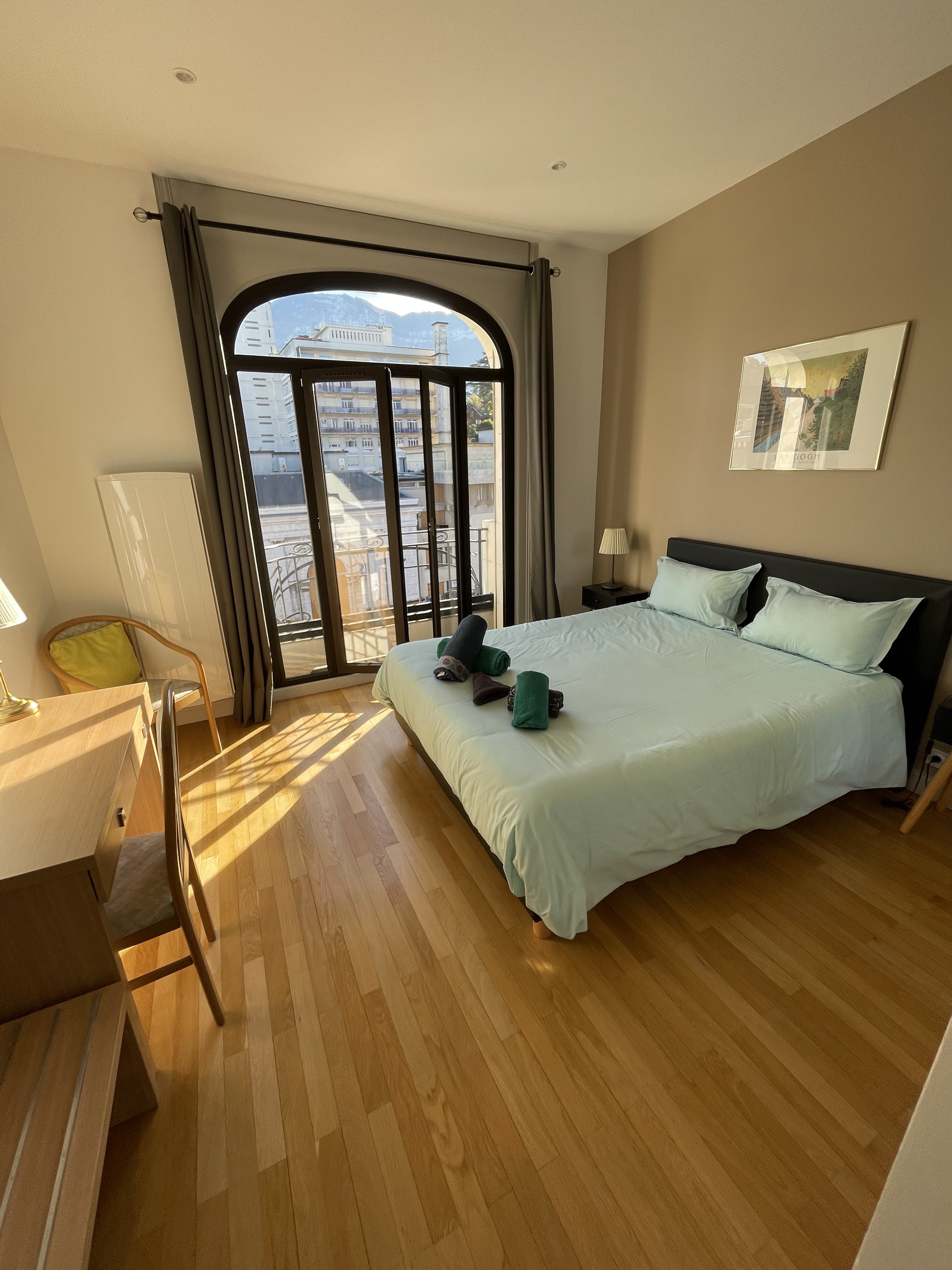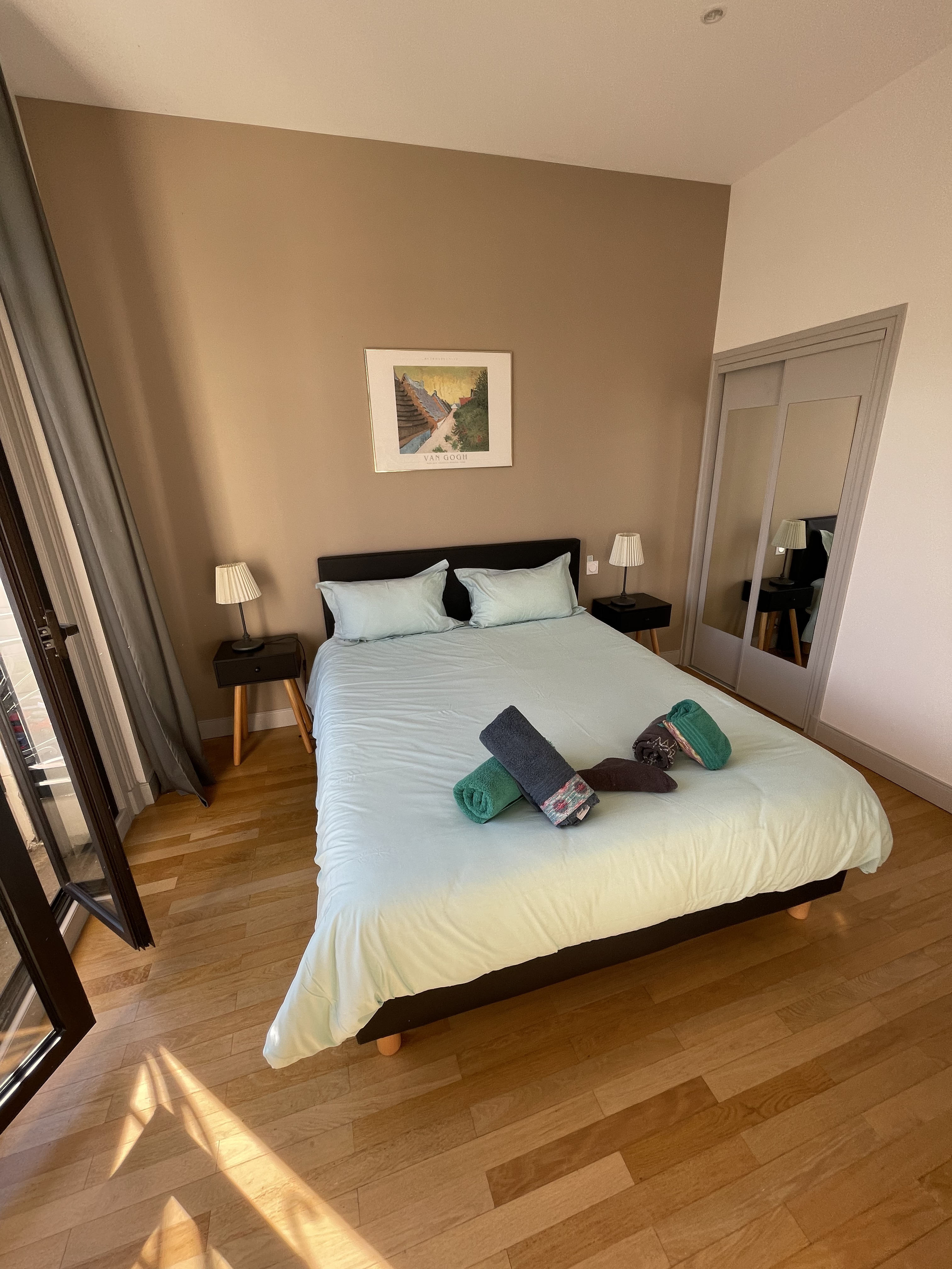 *CHAMBRE (Sol : parquet / Murs : peinture) lit 160/200 cm, 2 chevets et lampes, bureau et lampe de bureau, porte-valise, placard mural.