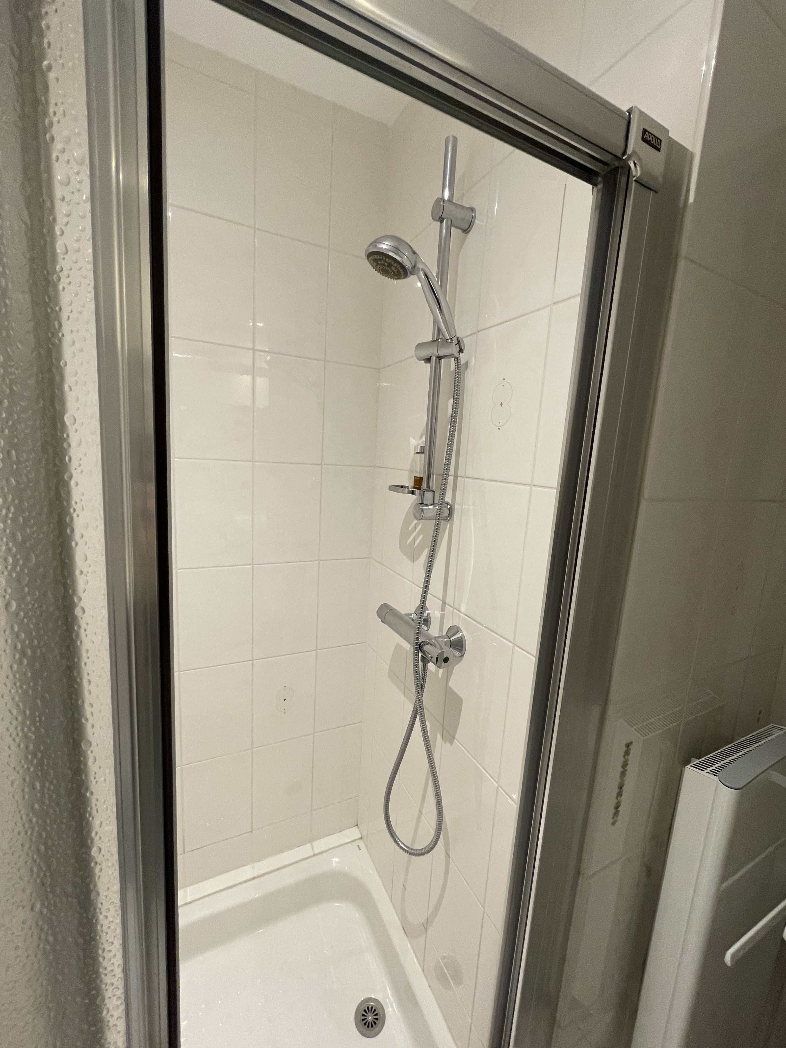 *SALLE D'EAU/WC (Sol : carrelage / Murs : faïence) cabine de douche avec paroi coulissante, WC, vasque avec meuble sous vasque, radiateur sèche-serviettes.