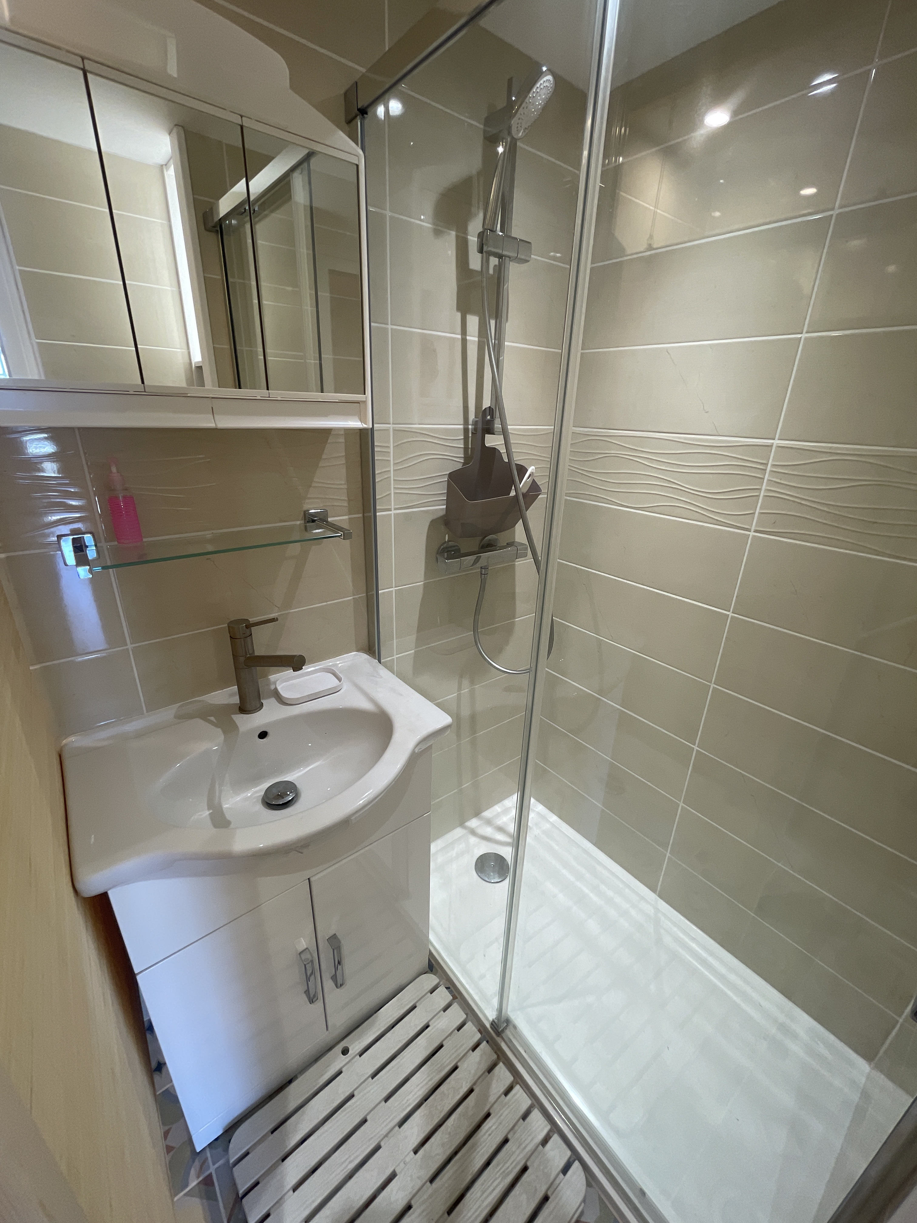 -Salle d'eau : vasque et meuble sous vasque, douche avec paroi,