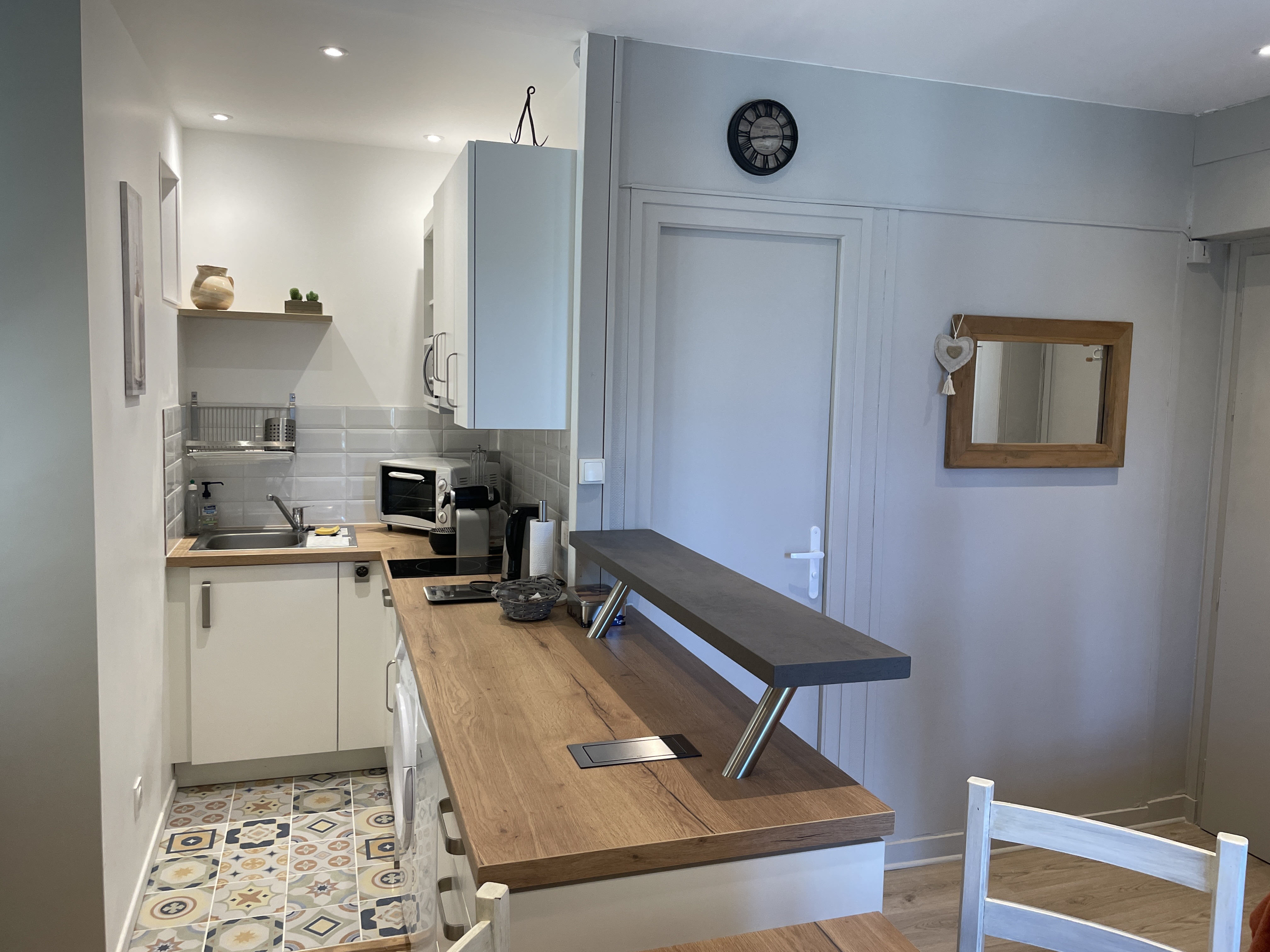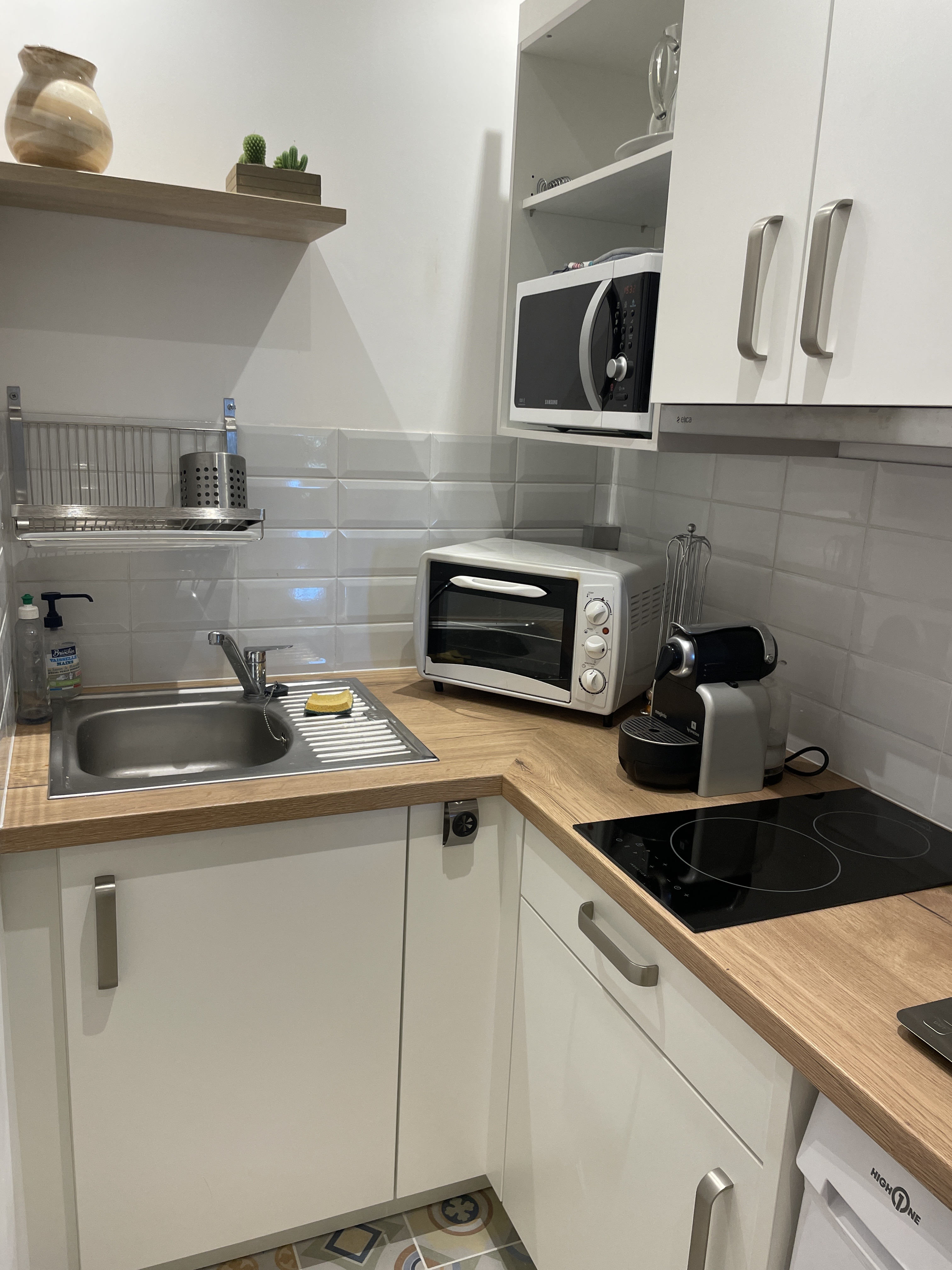- CUISINE (Sol : carrelage/Murs : crédence et peinture): évier, égouttoir, meubles haut et bas, réfrigérateur table-top, micro-ondes, mini-four et plaque de cuisson 2 feux, hotte, cafetière, bouilloire, grille-pain, couverts, ustensiles de cuisine et de cuisson, lave-linge.
