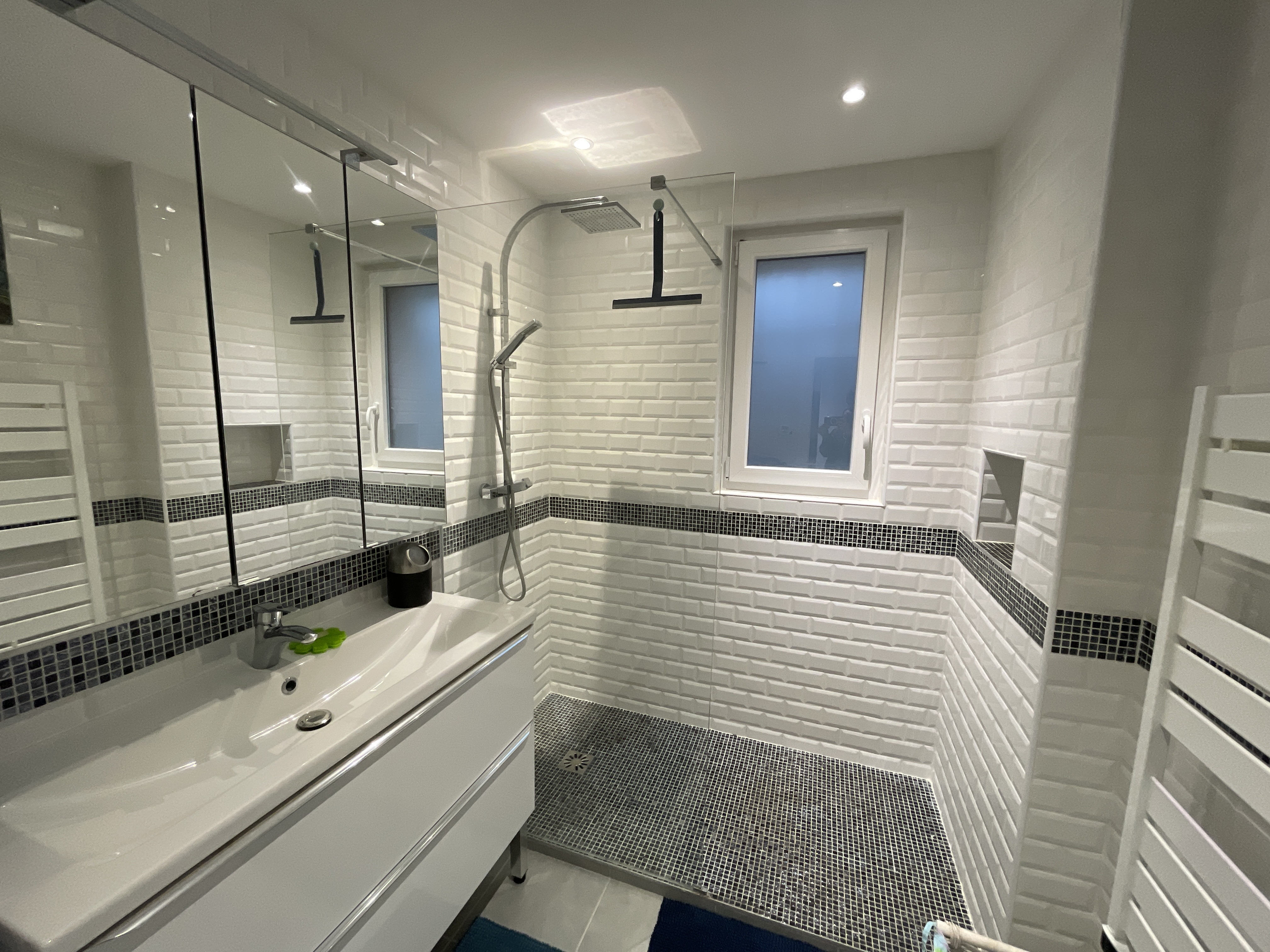 *SALLE D'EAU (Sol : carrelage / Murs : faïence et peinture) douche à l'italienne, vasque et meuble sous vasque, sèche-serviettes.