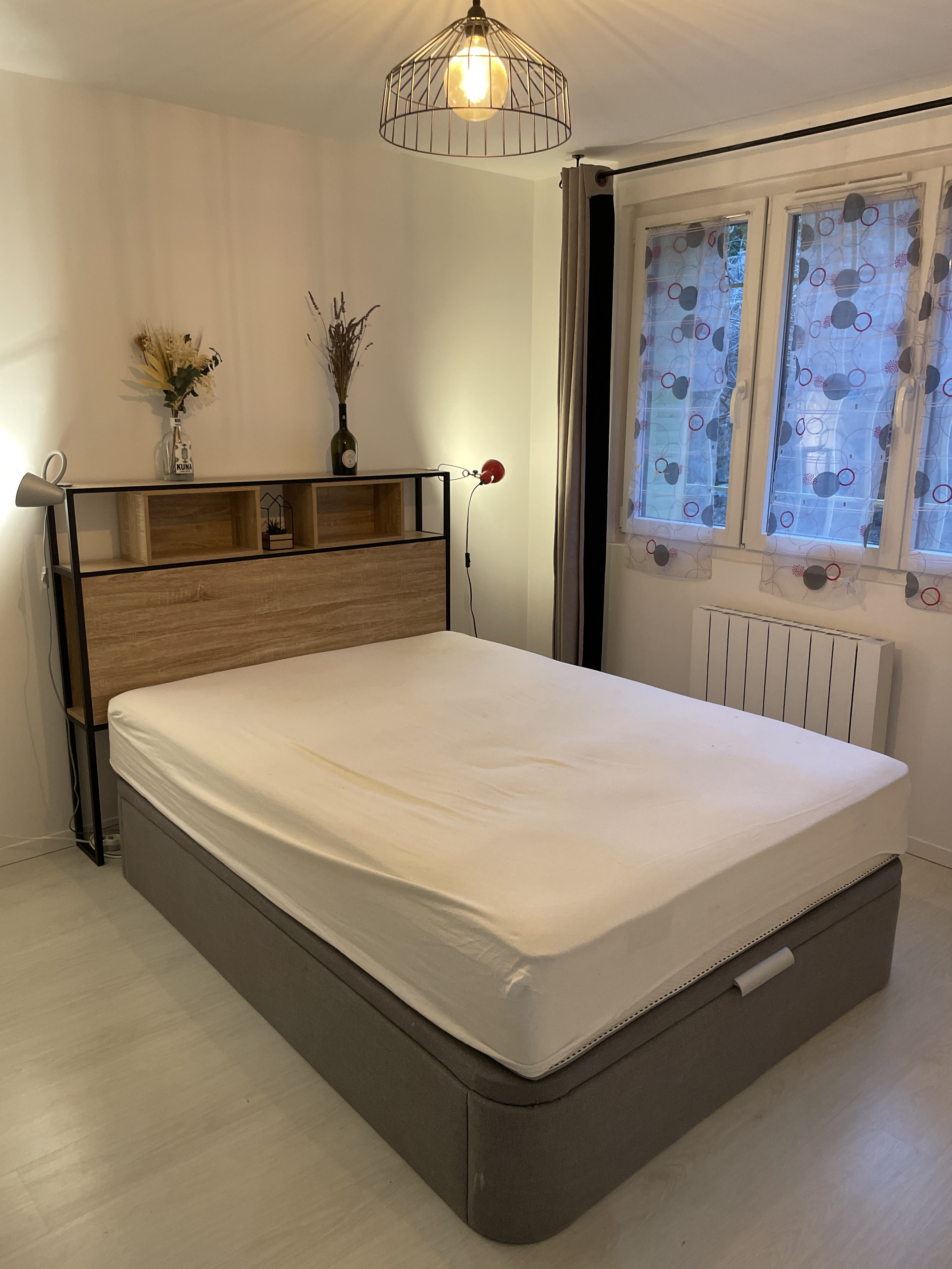 *CHAMBRE (Sol : parquet / Murs : peinture) : lit 2 places 140cm x 200 cm, 2 oreillers carrés, 1 couette, 2 lampes de chevet.