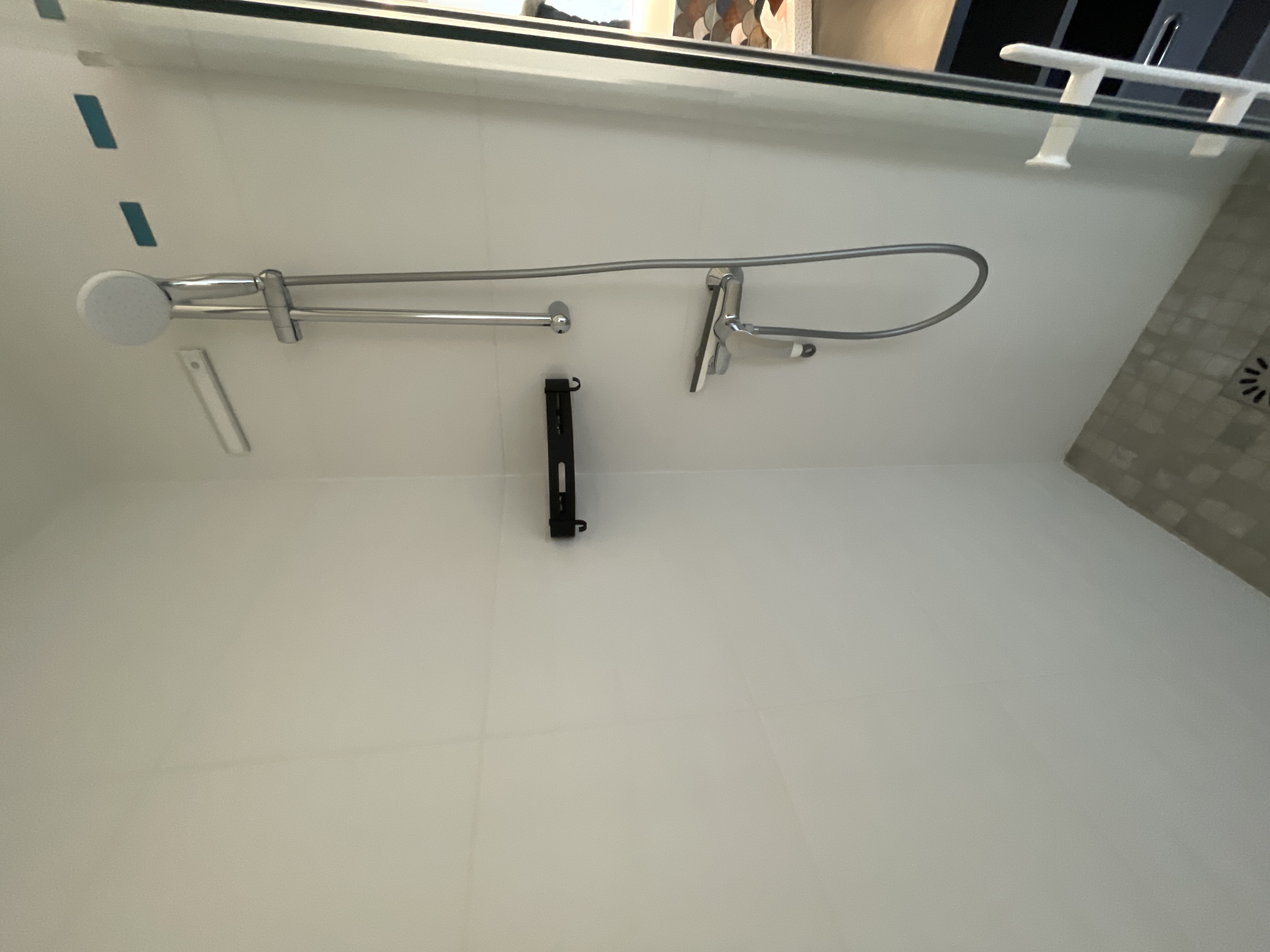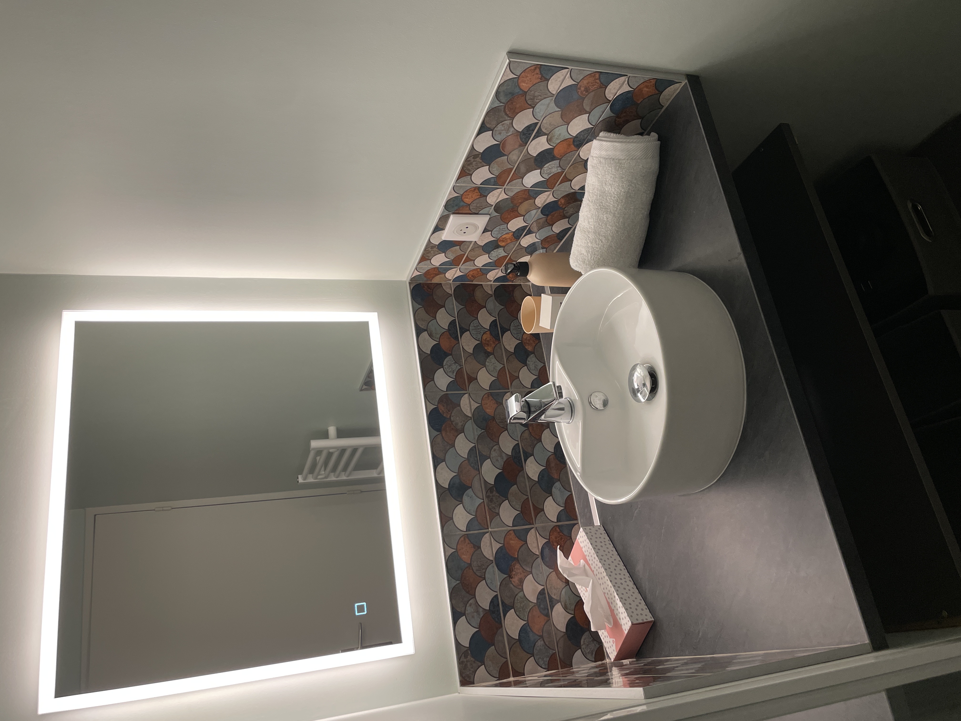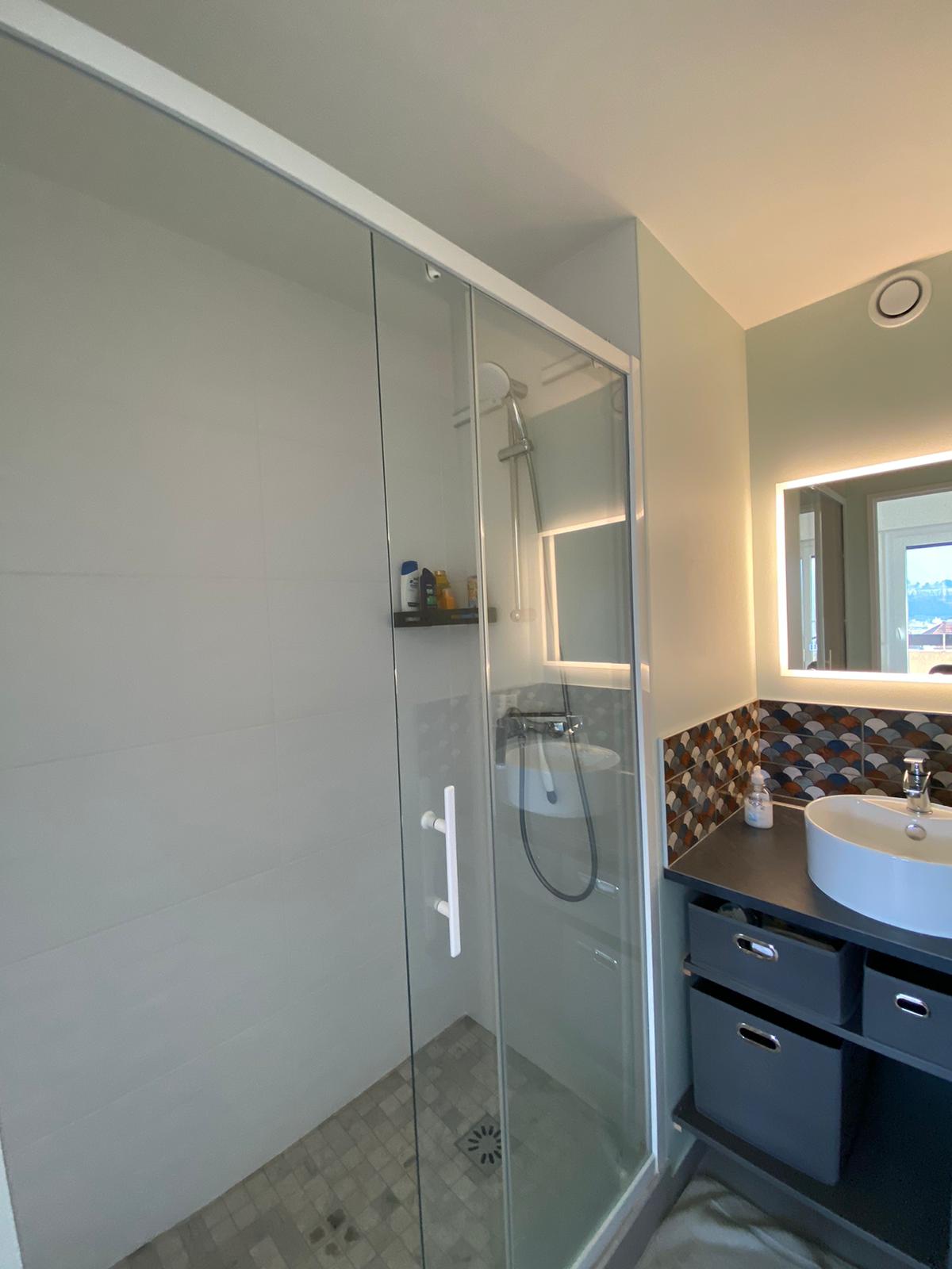 *SALLE D'EAU (Sol : carrelage/Murs : faïence et peinture) vasque et meuble sous vasque avec paniers de rangements, sèche cheveux, cabine de douche (avec parois vitrées coulissantes), beau miroir, radiateur sèche-serviettes.