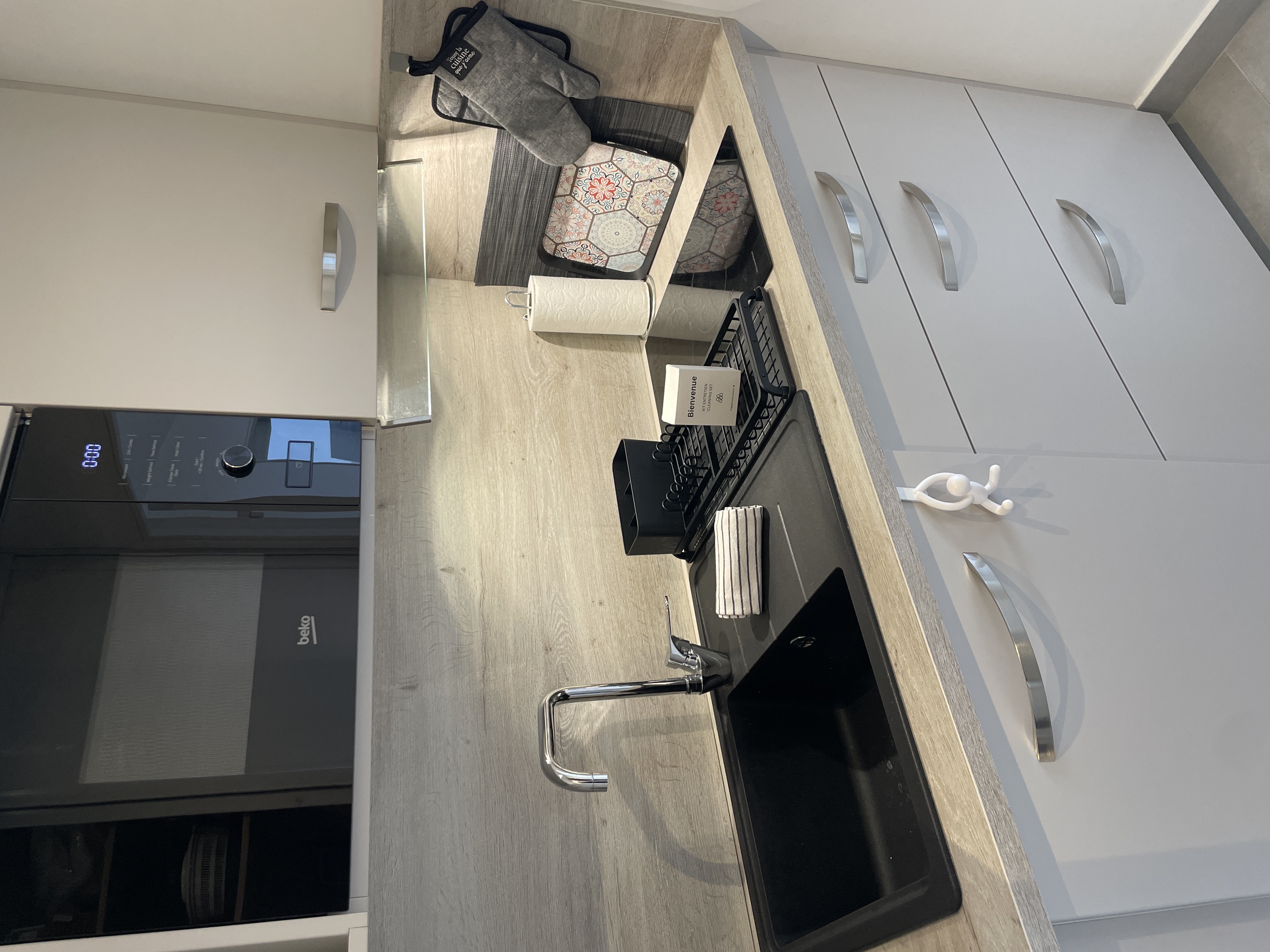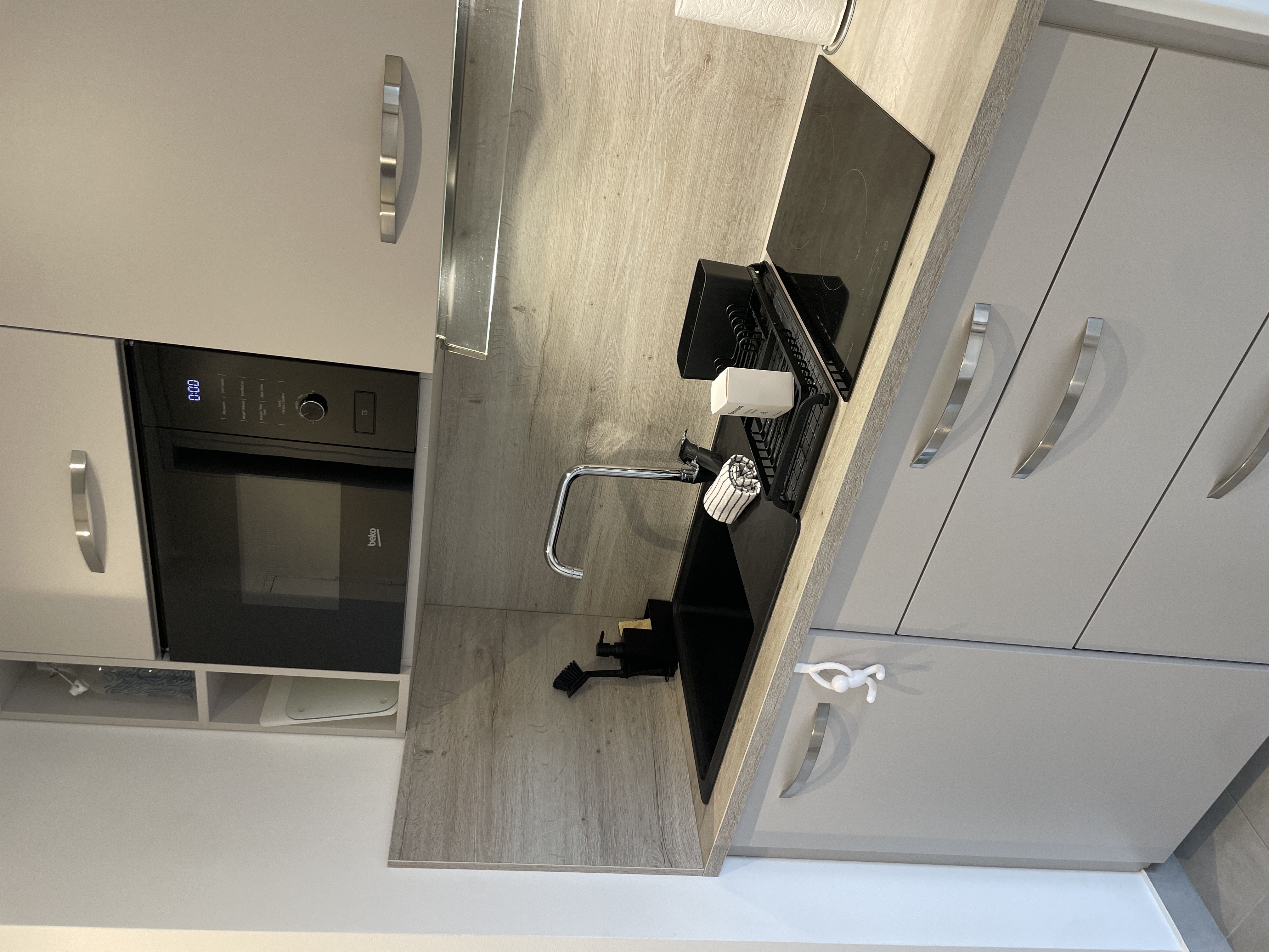* ENTREE DANS KITCHENETTE (Sol : carrelage/Murs : crédence et peinture) : évier, égouttoir, meubles haut et bas, réfrigérateur table-top, micro-ondes/combiné grill, plaque de cuisson 2 foyers vitrocéramique, hotte, cafetière Nespresso classique, cafetière à piston, appareil à croque-monsieur, bouilloire, grille-pain, couverts, ustensiles de cuisine et de cuisson, appareil à raclette duo, petit airfryer, partie penderie aménagé dans placard