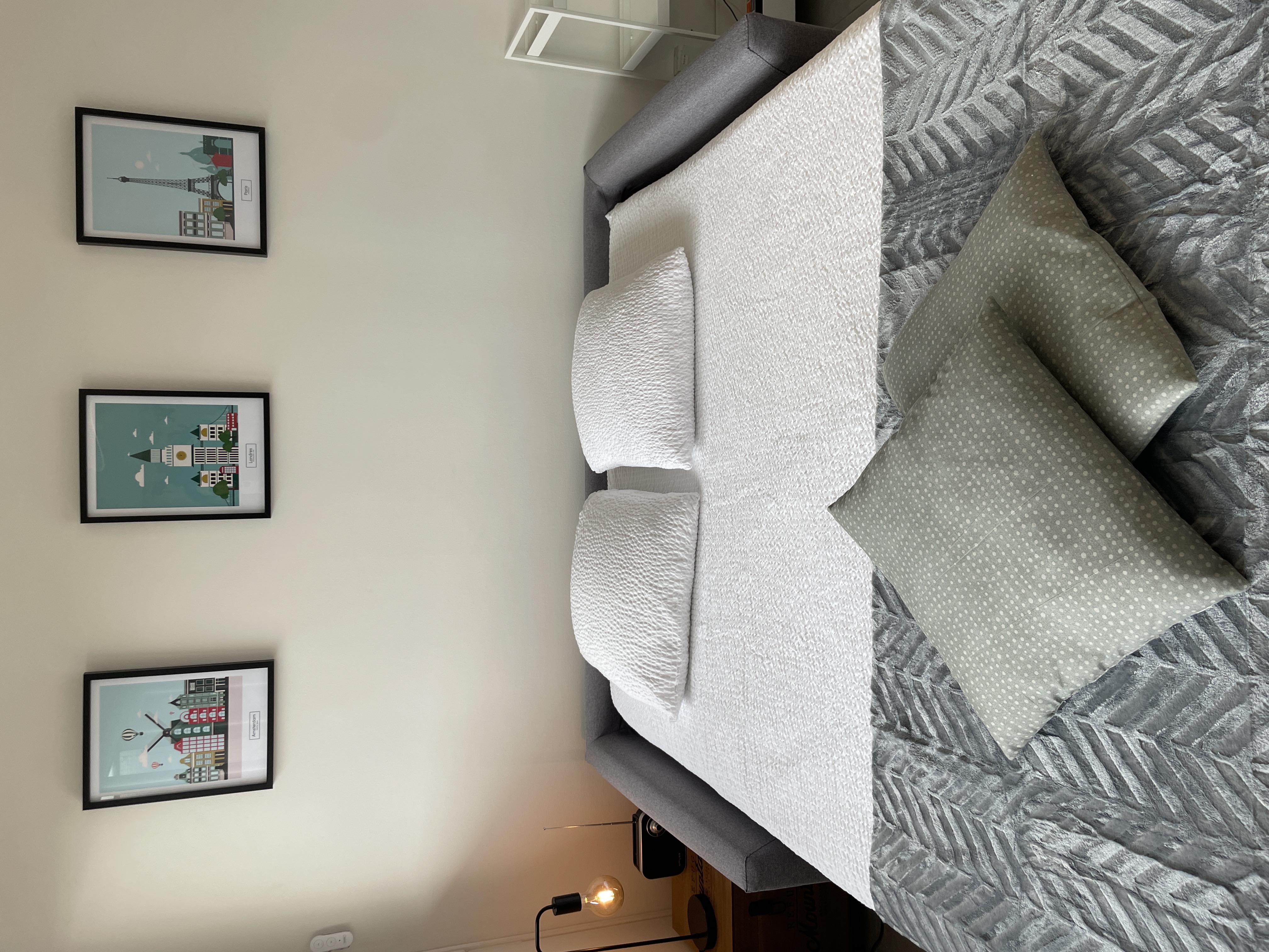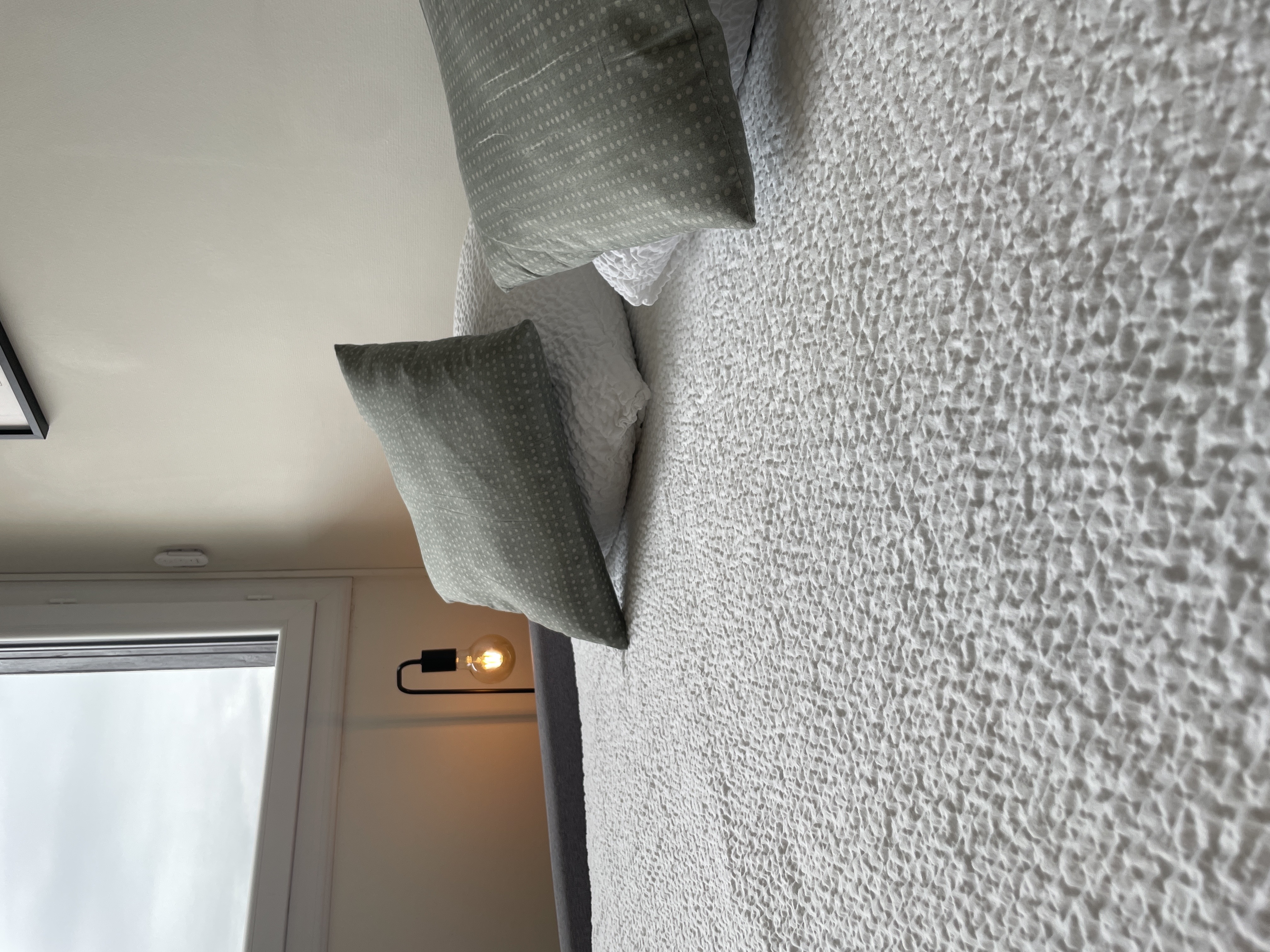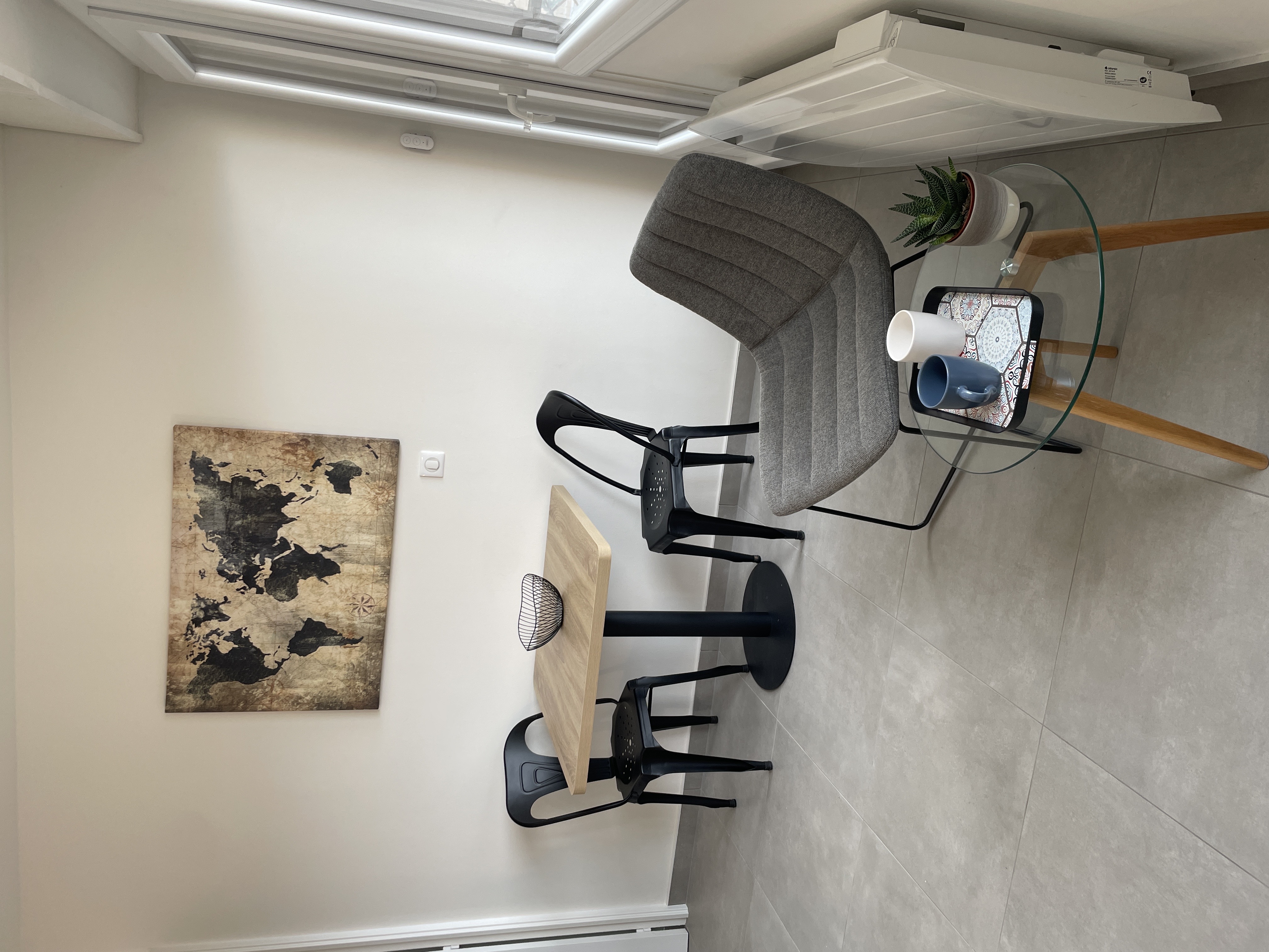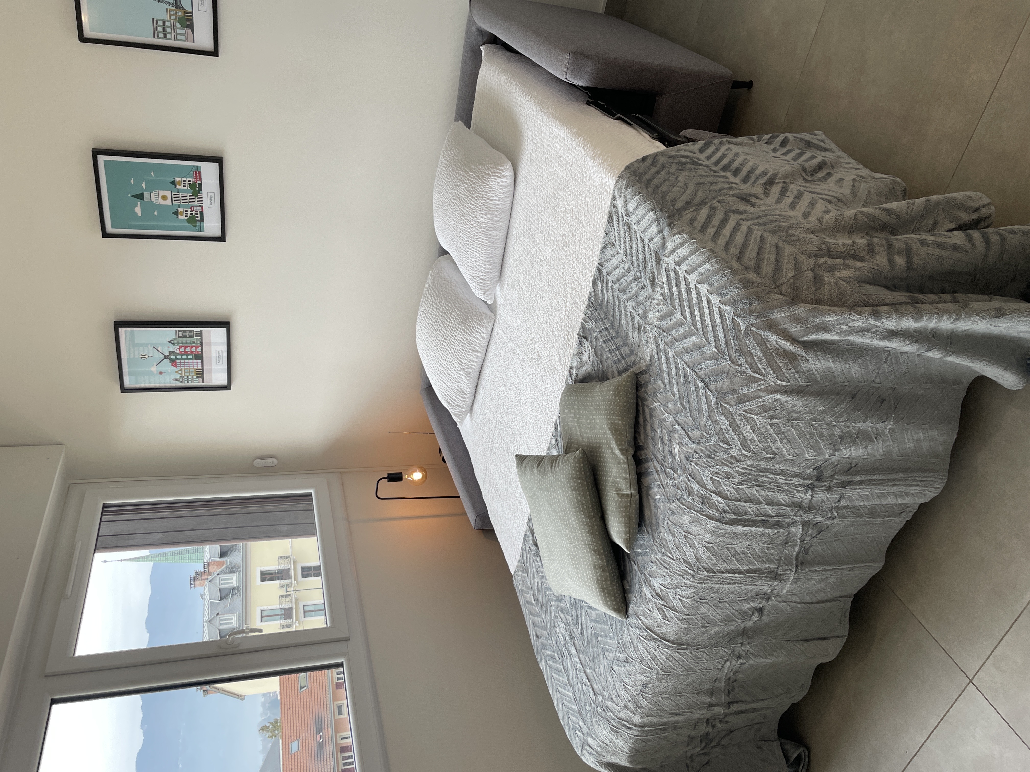* PIECE PRINCIPALE avec COIN NUIT et COIN REPAS (Sol : carrelage/Murs : peinture) : table et 2 chaises, petite table basse, fauteuil, canapé/lit convertible neuf et bonne qualité permettant un couchage confortable x 140 cm, couette et 2 oreillers, chevet et lampe, TV/TNT fixée au mur.