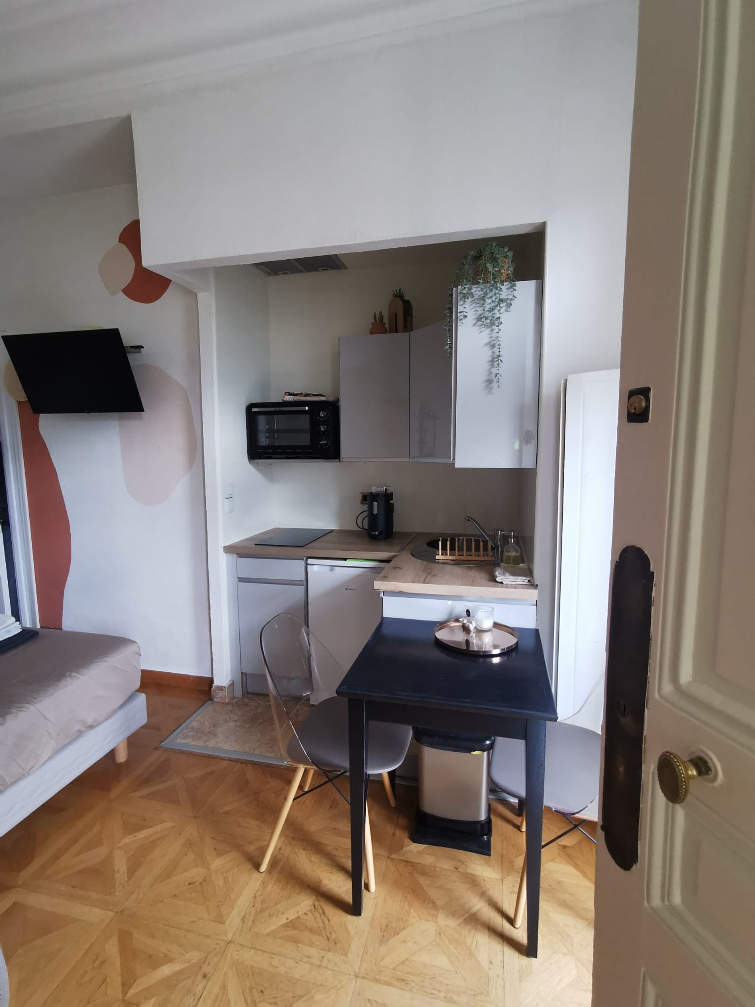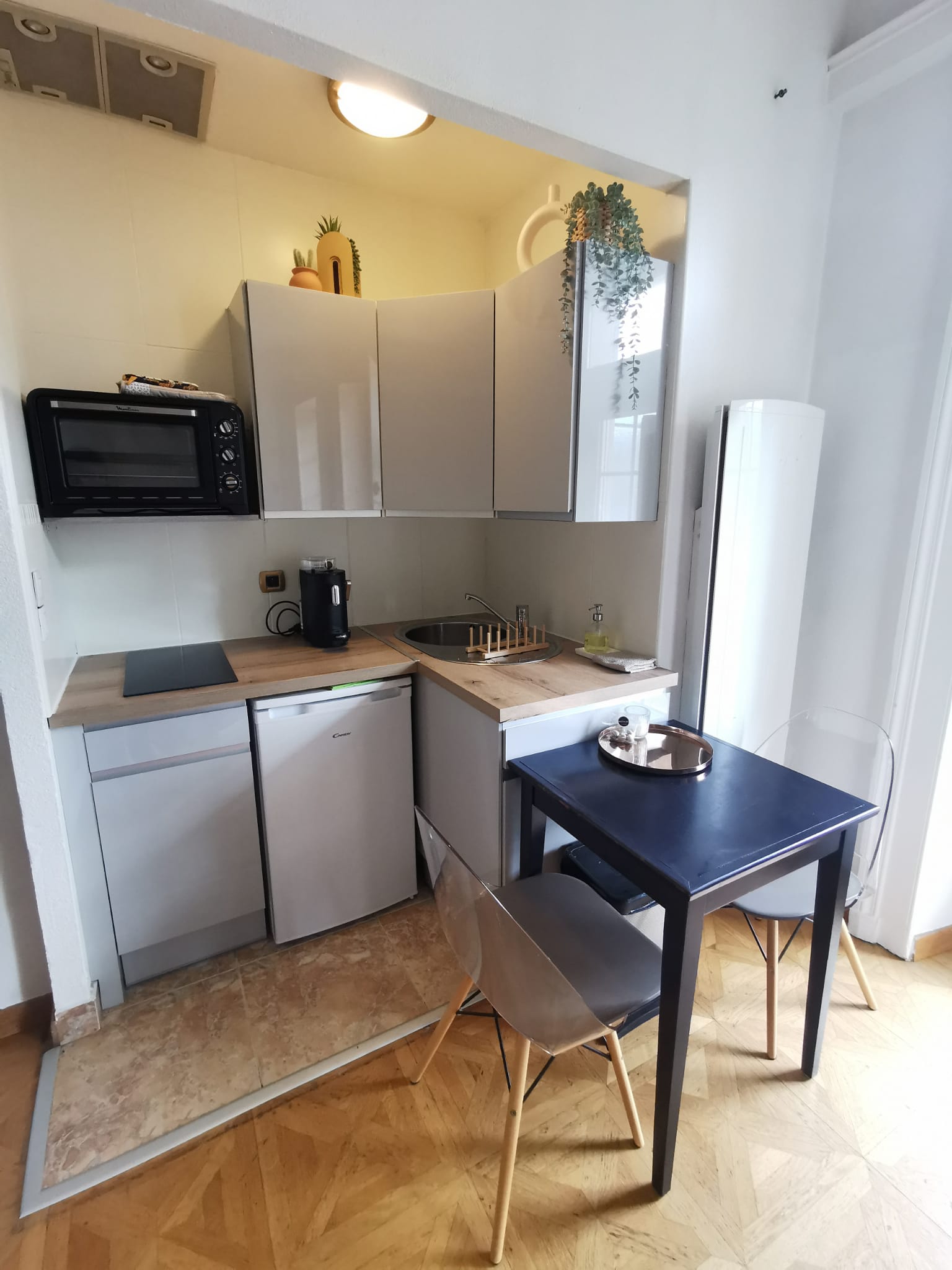 *coin cuisine : réfrigérateur table-top, plaque de cuisson électrique 2 foyers, mini-four, bouilloire, cafetière filtre traditionnelle, cafetière capsule BCOFFEE, table et 2 chaises.
