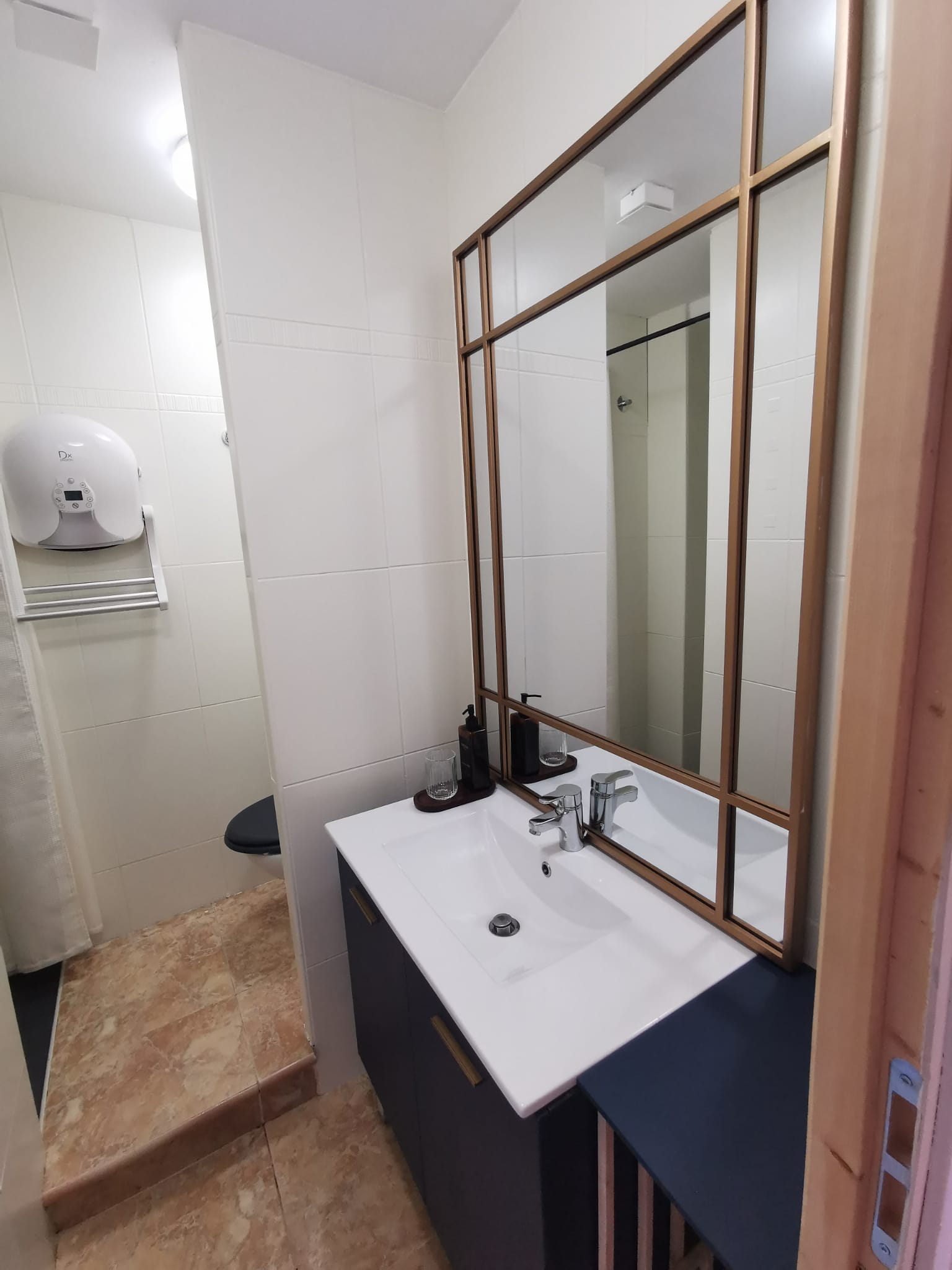 -Salle d'eau/WC (Sol : carrelage / Murs : faïence) douche (1 marche), radiateur sèche-serviettes, lavabo avec meuble sous vasque, miroir, WC.