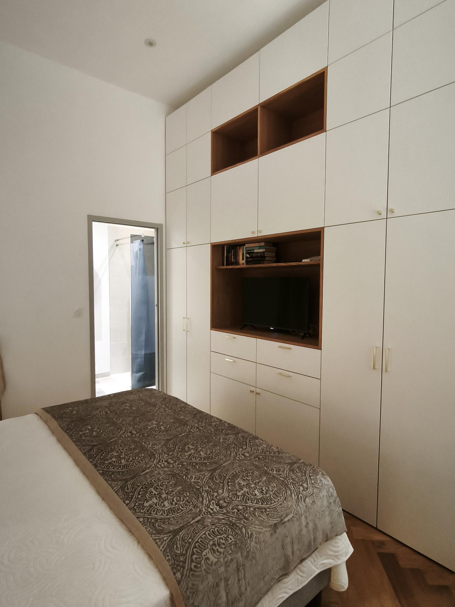 *Chambre(sol : parquet/murs : peinture) : lit 160/200, 2 chevets et lampes de chevet, 2 oreillers carrés et 2 rectangulaires, TV, dressing, coin bureau.