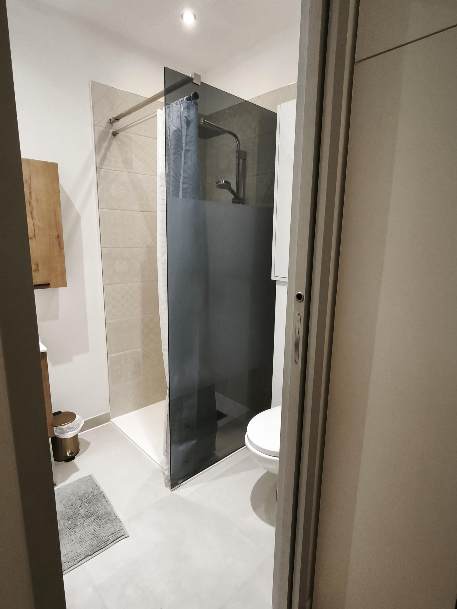 *Salle d'eau et WC (sol : carrelage/murs : peinture et faïence) WC suspendu, vasque et meuble sous vasque, douche italienne, rangement, lave-linge, sèche-linge.