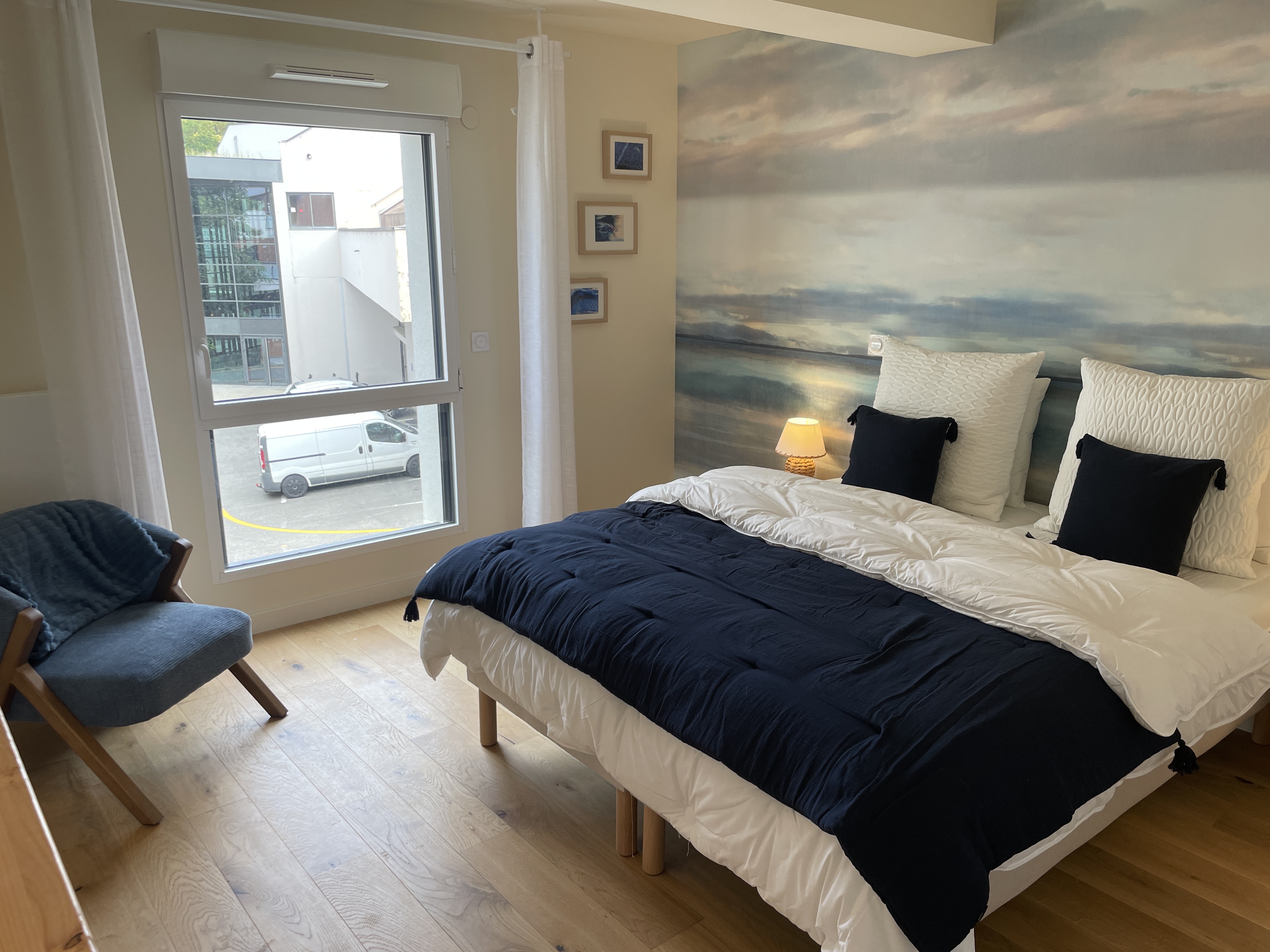 *CHAMBRE 1 (Sol : carrelage/Murs : peinture) lit 160x200cm (literie neuve), 2 tables et lampes de chevet, commode. La chambre dispose d'un balcon dont la vue donne sur l'immeuble d'en face, présence de vis-à-vis.