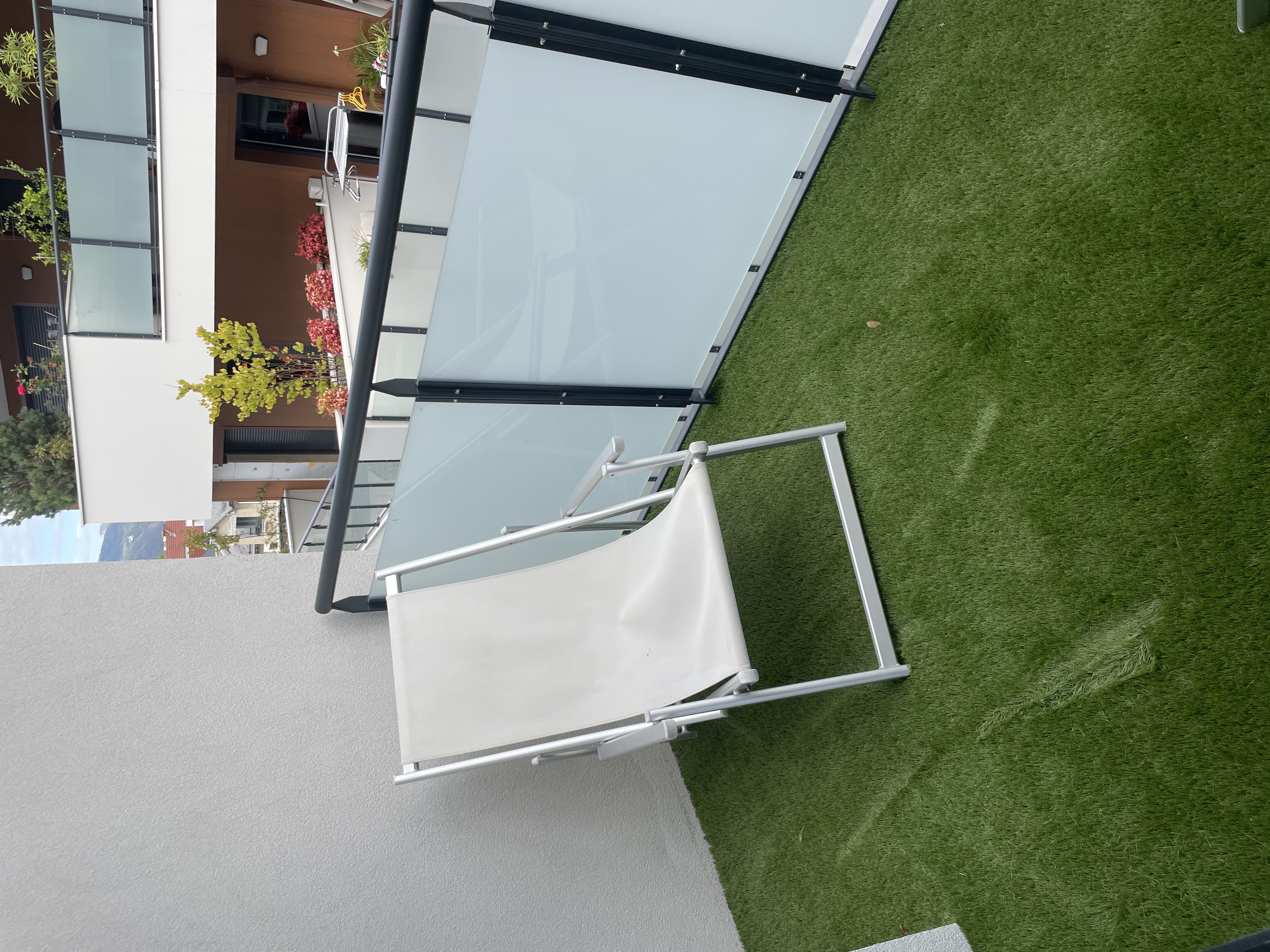 *TERRASSE expo SUD avec table, chaises d'extérieur et bains de soleil.