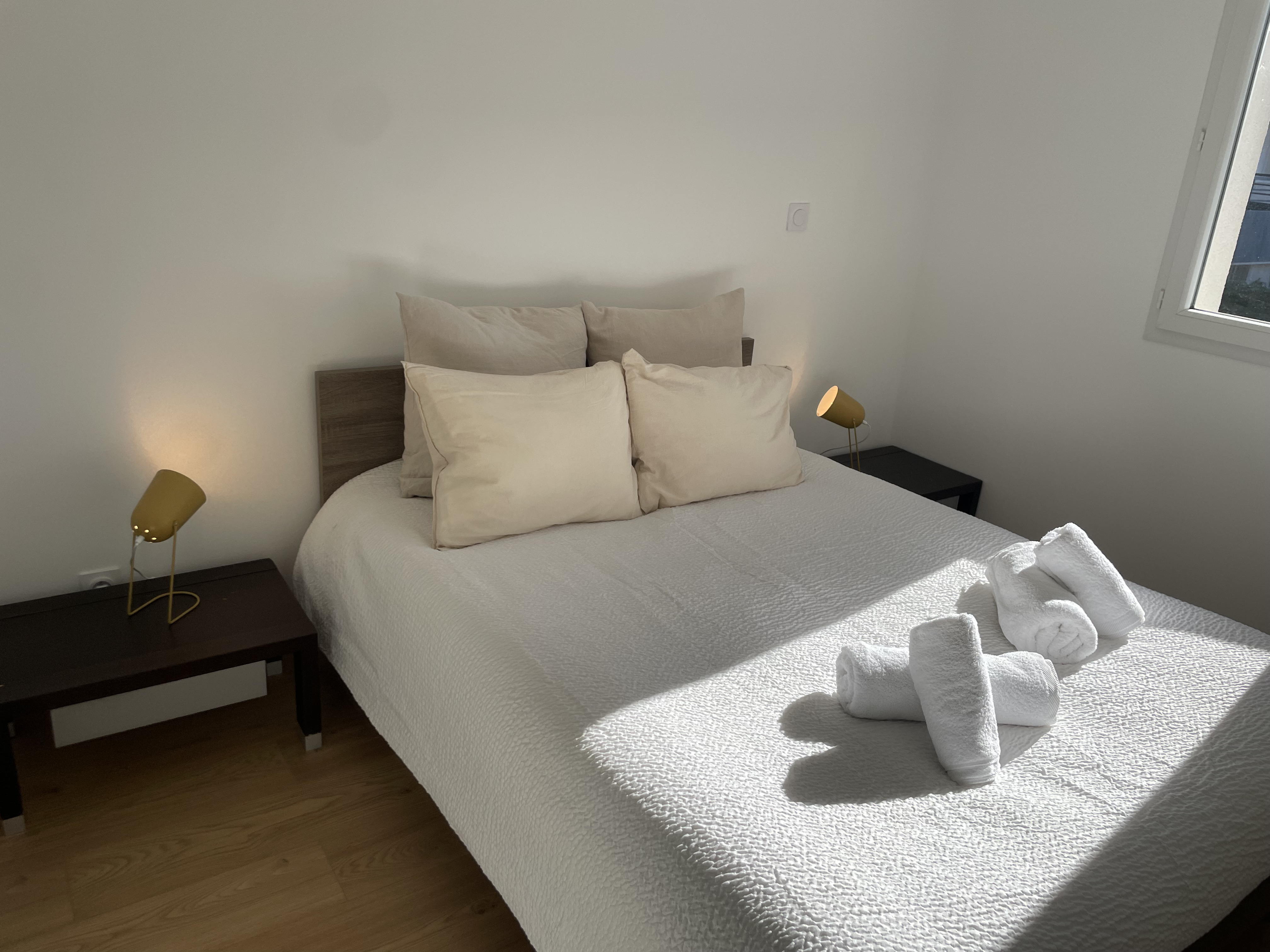 *CHAMBRE 1 (Sol: parquet / Murs:peinture) : lit 160cm, 2 oreillers rectangles, 1 couette, 2 chevets et lampes de chevet, dressing mural et commode.