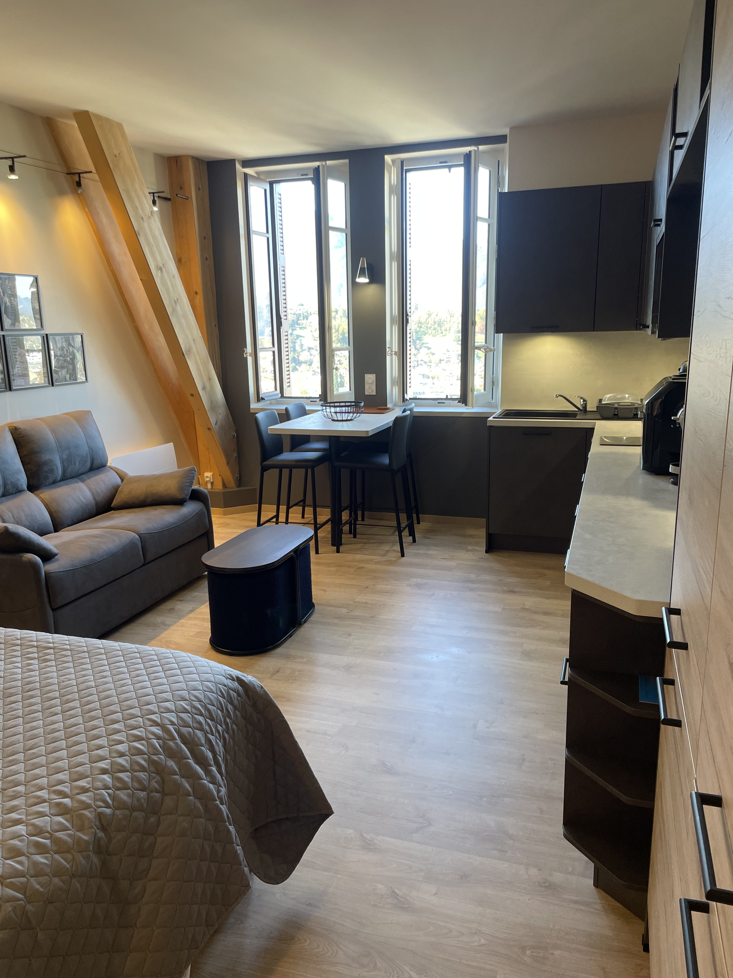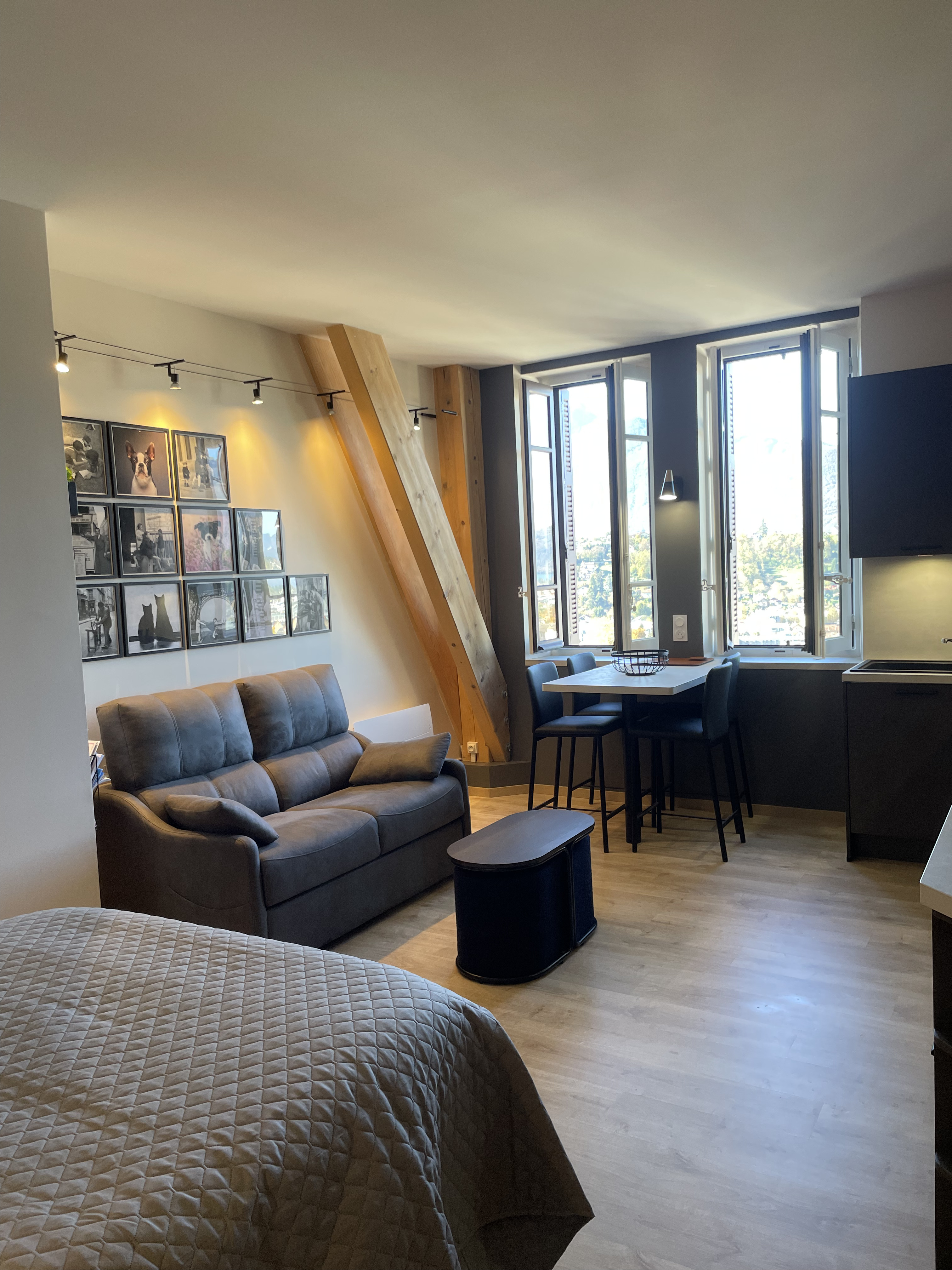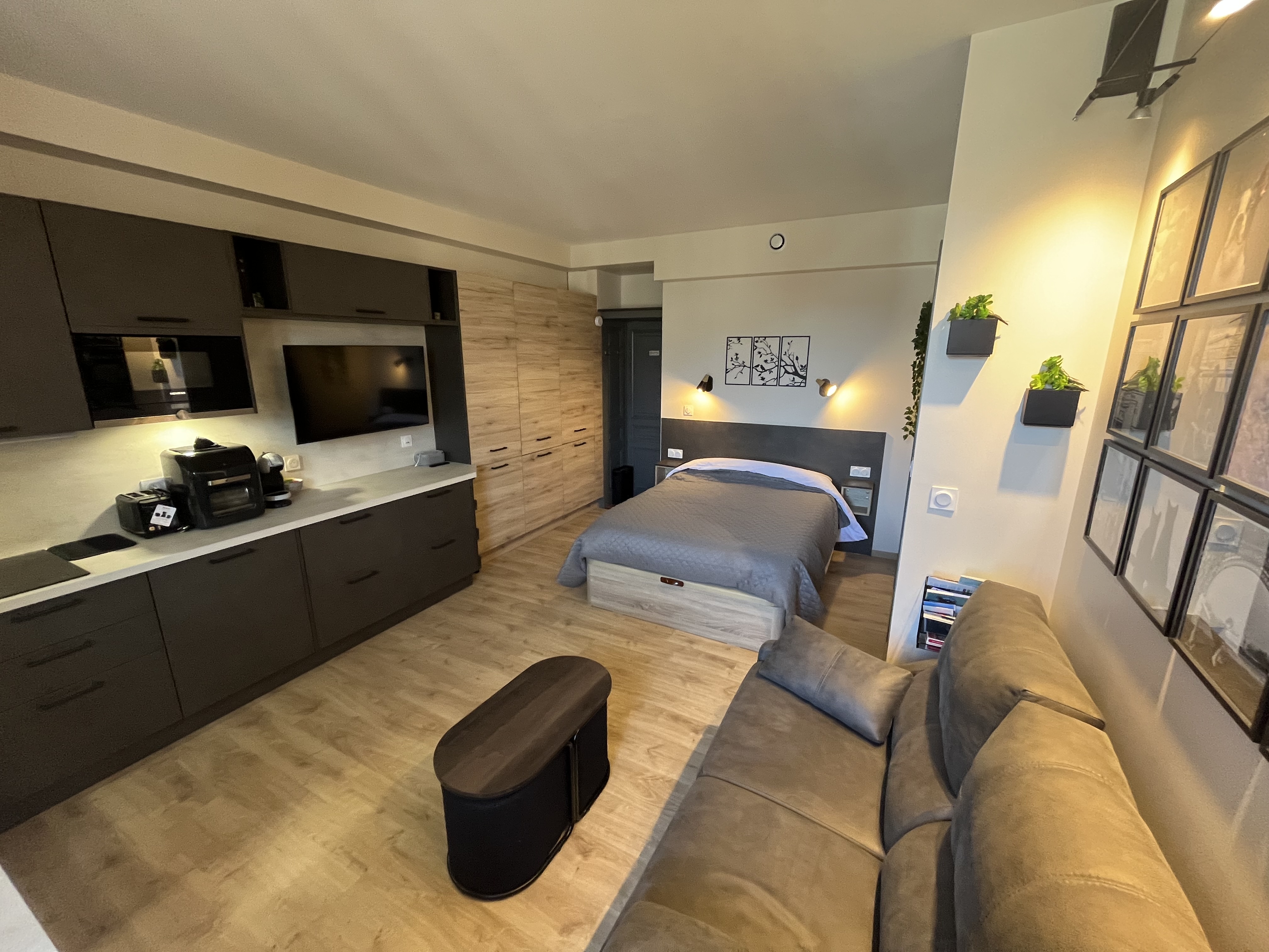 *Espace séjour/coin nuit : TV/TNT écran plat fixé au mur, canapé, table basse, table à manger haute et 4 chaises, lit 140/200, 2 éclairages têtes de lits, 2 oreillers carrés et 2 oreillers rectangulaires.