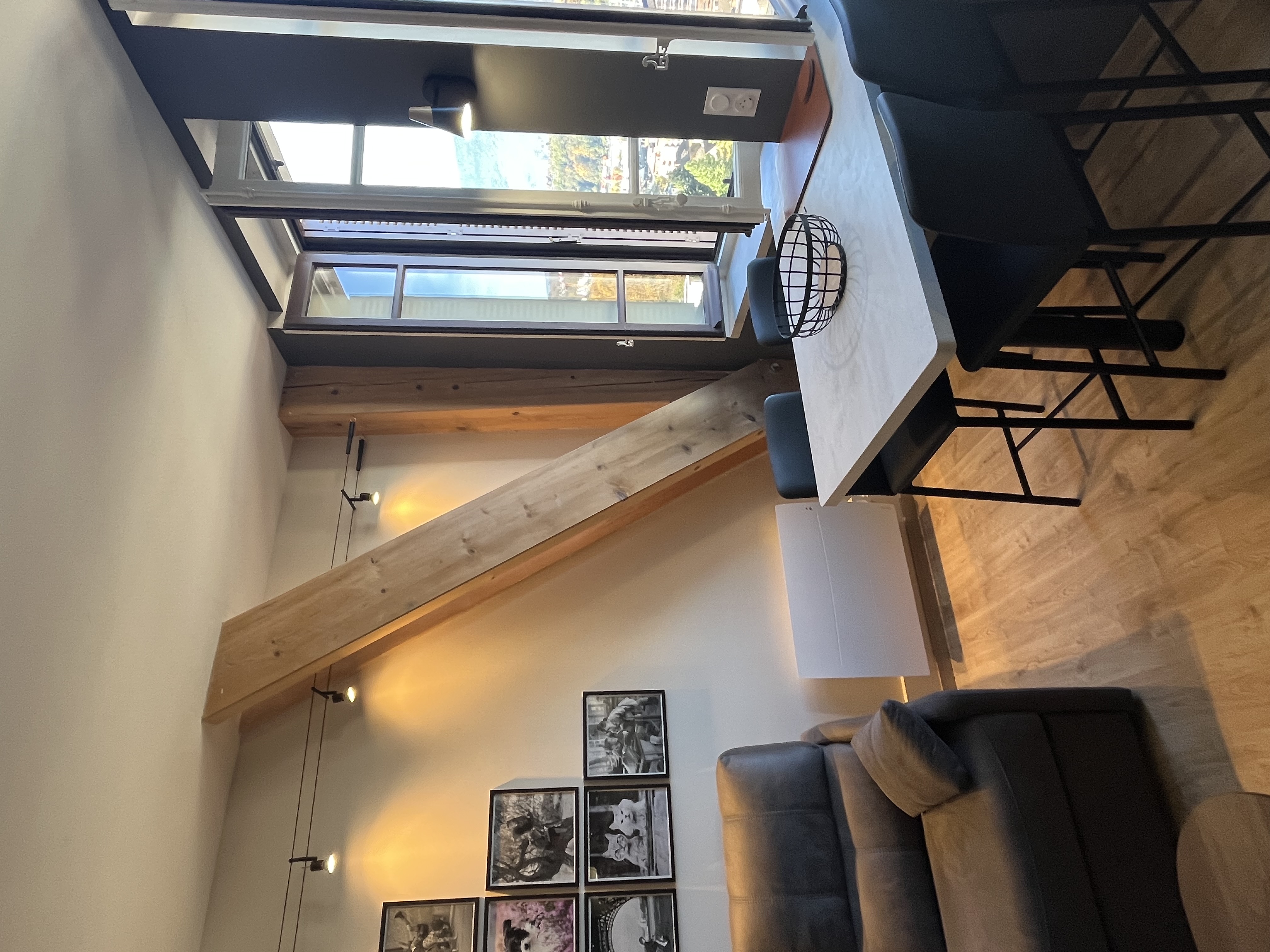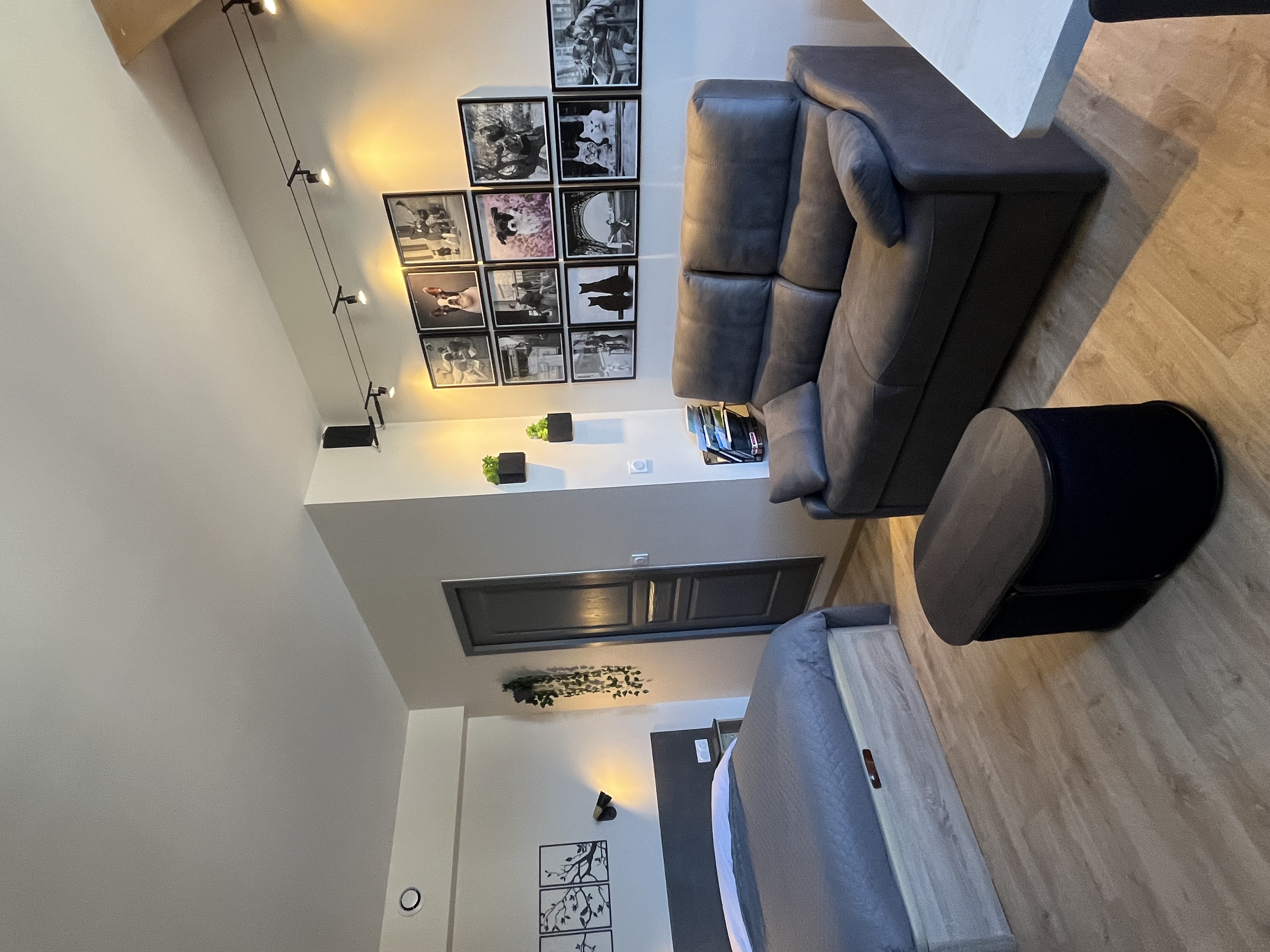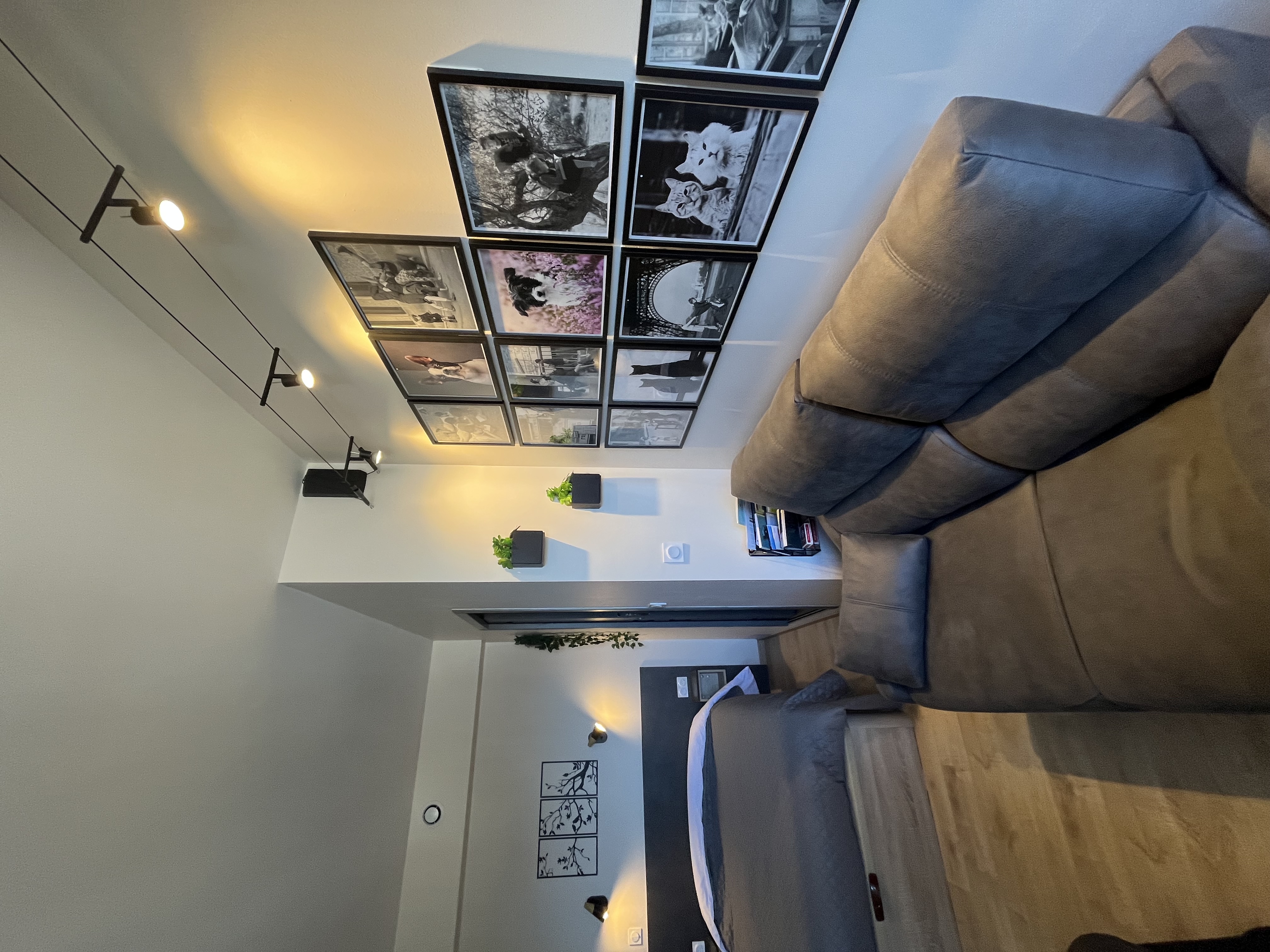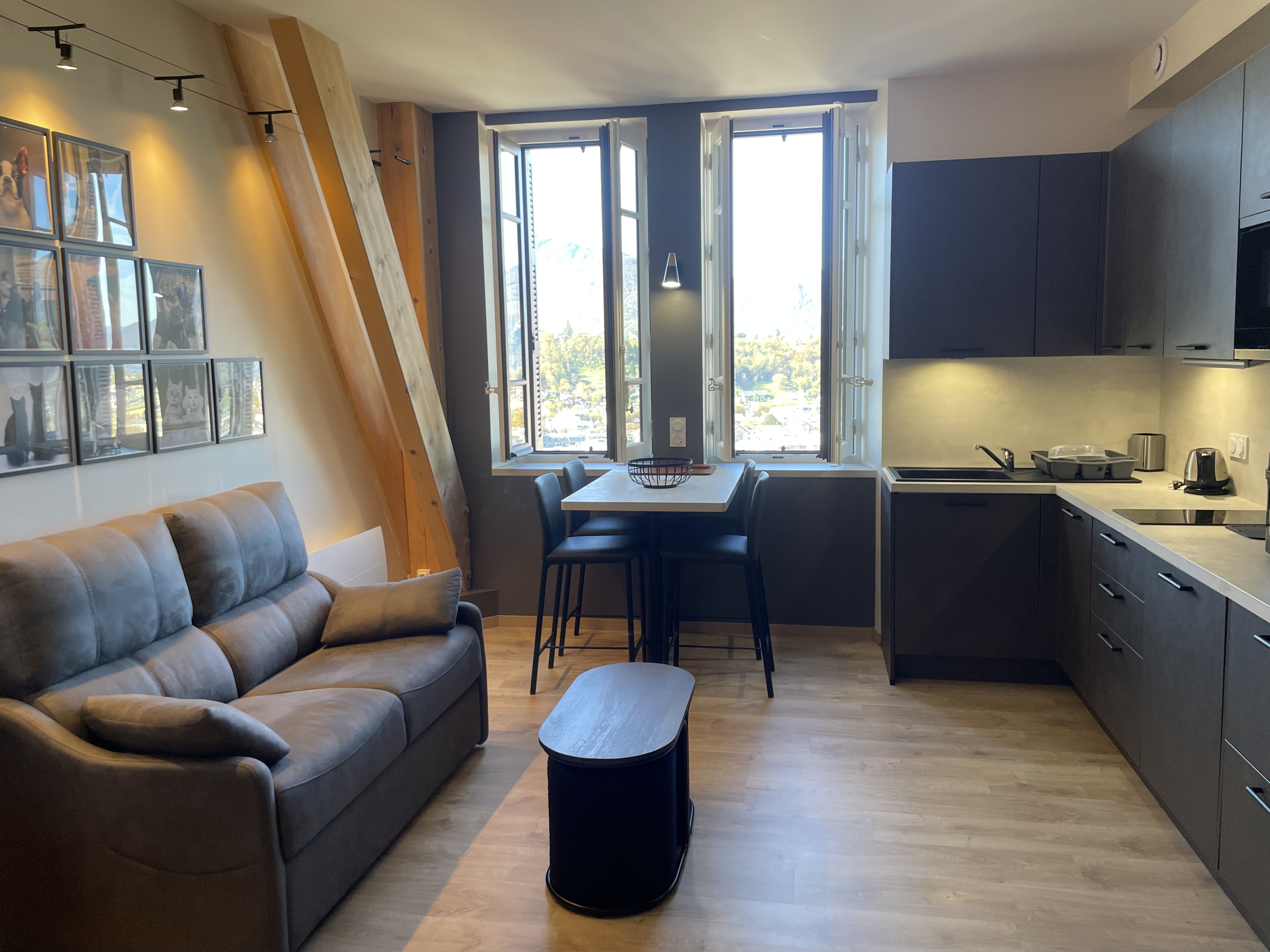 *Espace séjour/coin nuit : TV/TNT écran plat fixé au mur, canapé, table basse, table à manger haute et 4 chaises, lit 140/200, 2 éclairages têtes de lits, 2 oreillers carrés et 2 oreillers rectangulaires.