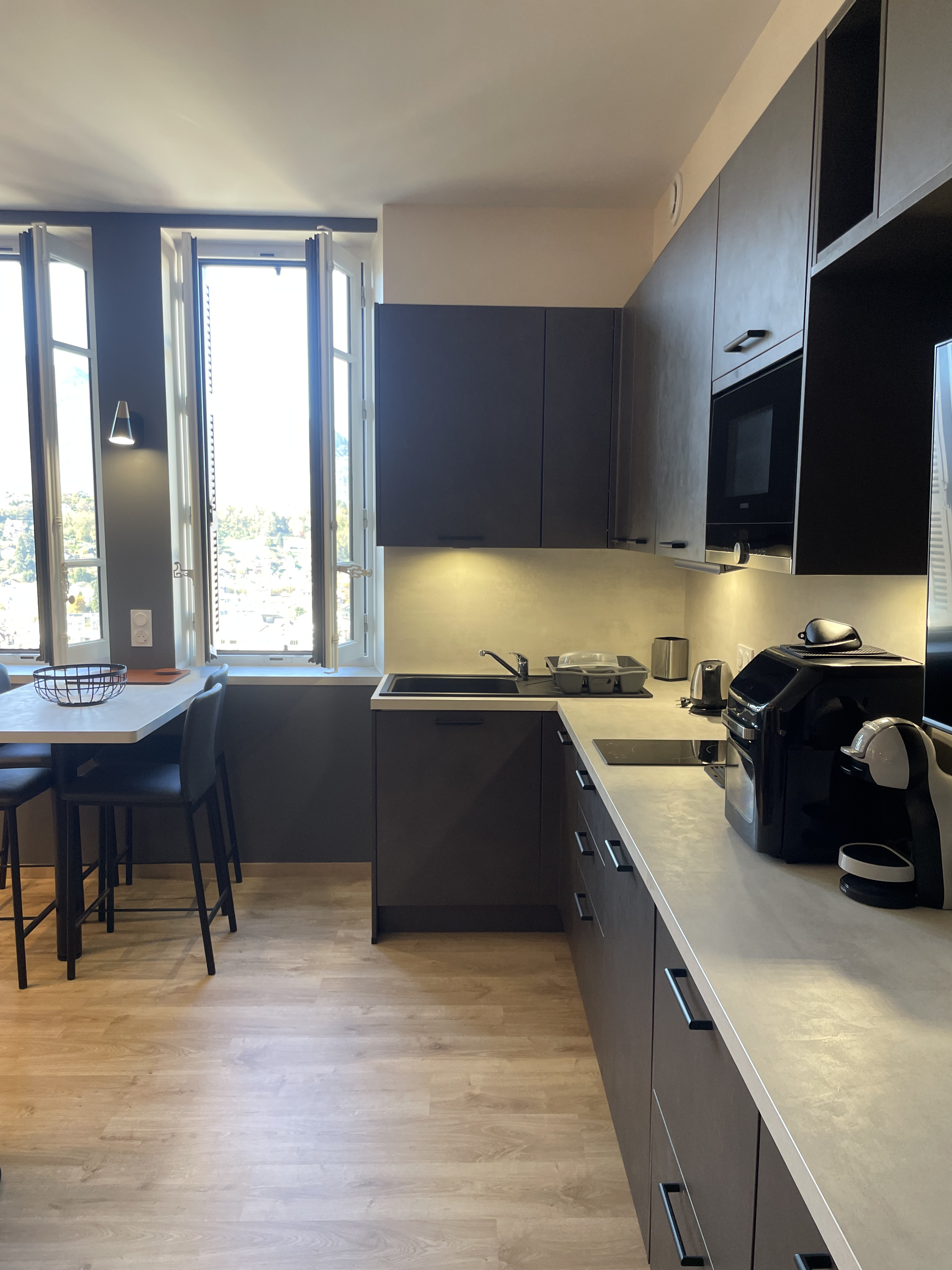*Espace cuisine : éléments de cuisine haut et bas, lave-vaisselle, évier, micro-ondes combiné four, plaque de cuisson, hotte aspirante, air fryer, cafetière dolce gusto, réfrigérateur table-top, congélateur table-top, bouilloire, grille-pain, vaisselles et ustensiles de cuisine et de cuisson.