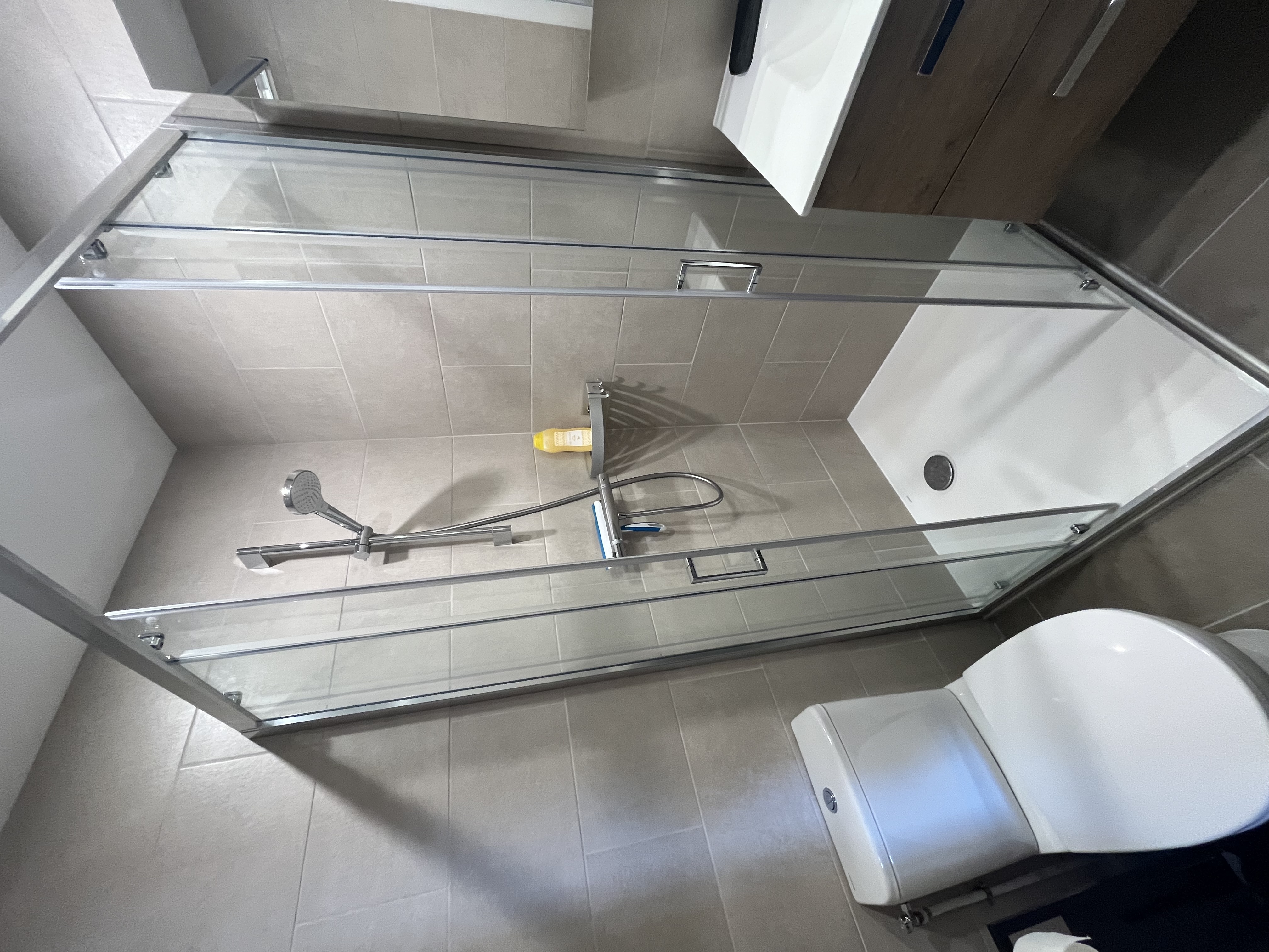 -SALLE D'EAU / WC (sol : carrelage/murs : peinture et faïence) WC, vasque et meuble sous vasque, cabine de douche parois coulissantes, lave-linge, radiateur sèche serviettes.