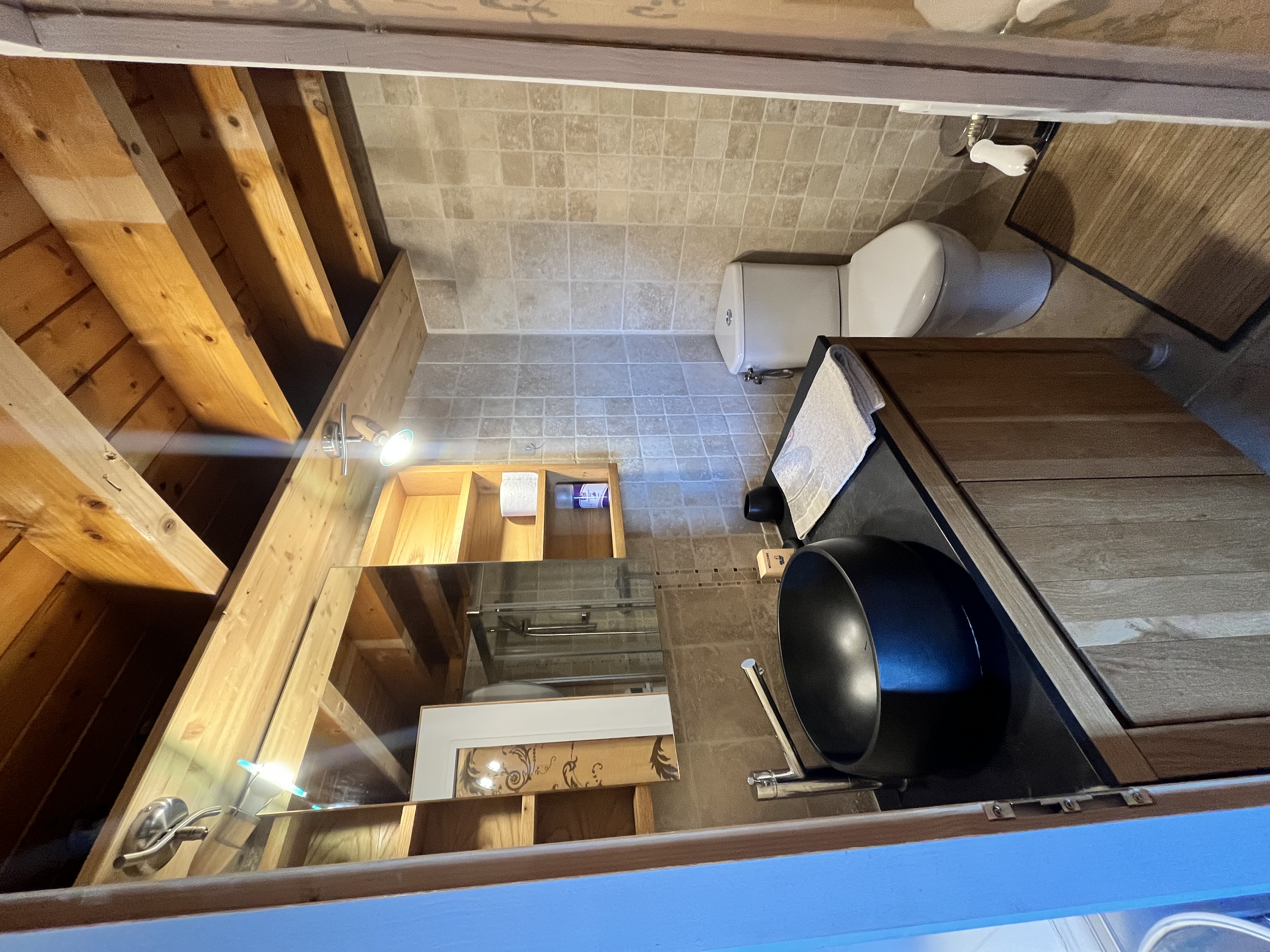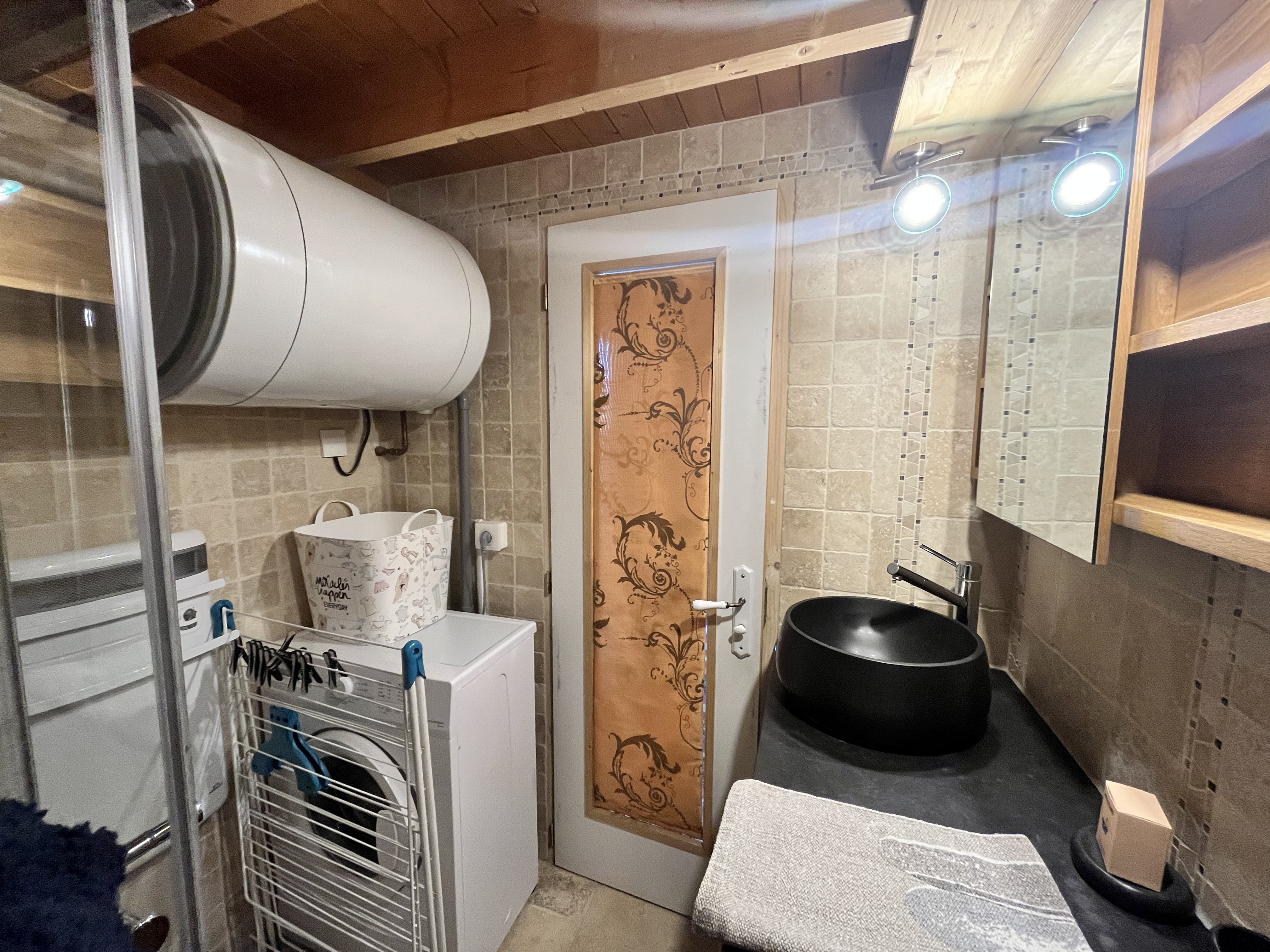 - SALLE DE BAINS/WC (sol : lino / murs : carrelage et peinture) : WC, cabine de douche d'angle, vasque et meuble sous vasque, sèche-cheveux, machine à laver, WC.
