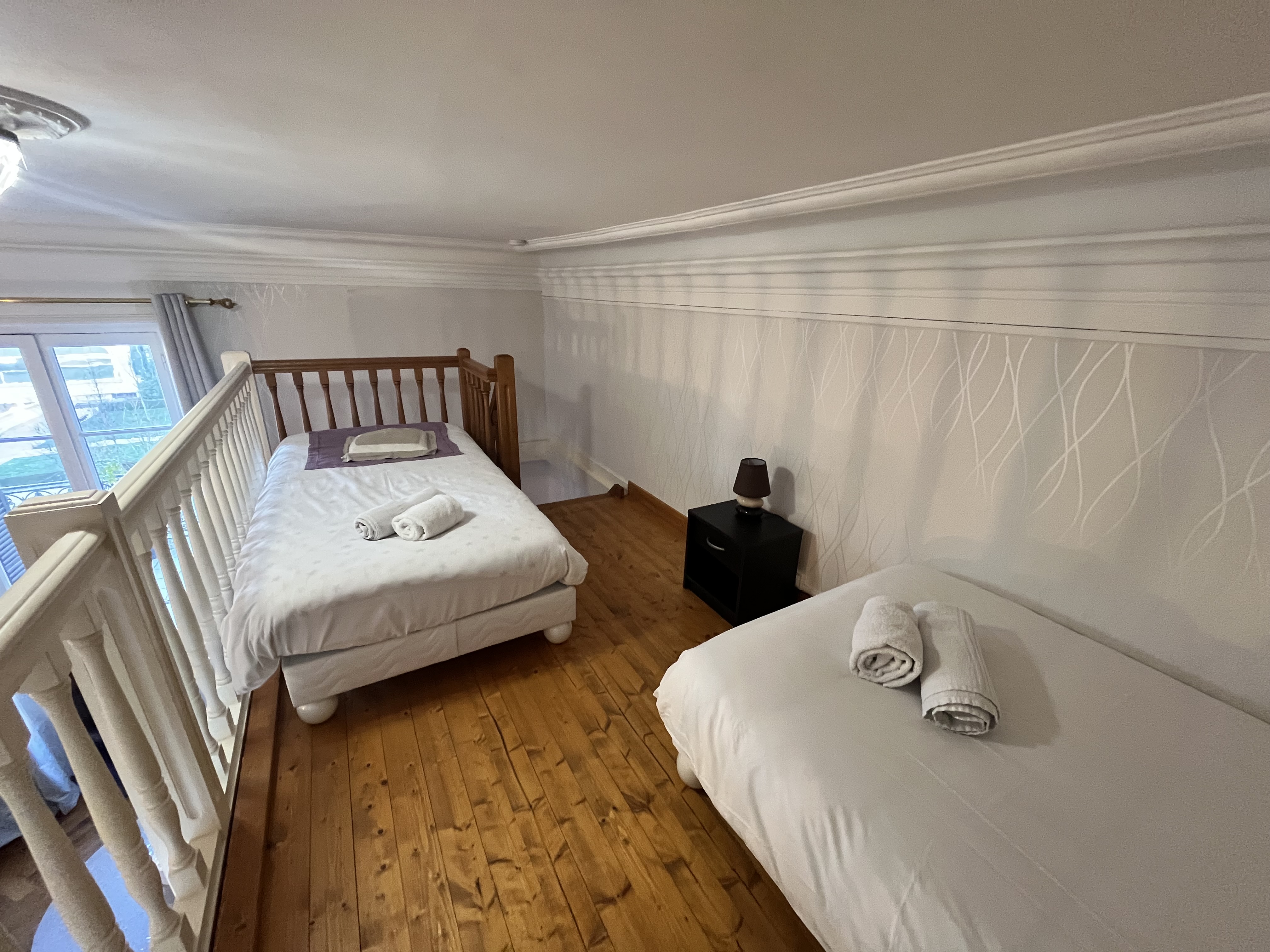 *Coin nuit en MEZZANINE 13 marches : 2 lits confortables en 140/190 cm, 2 oreillers et 2 couettes, lampes de chevet.