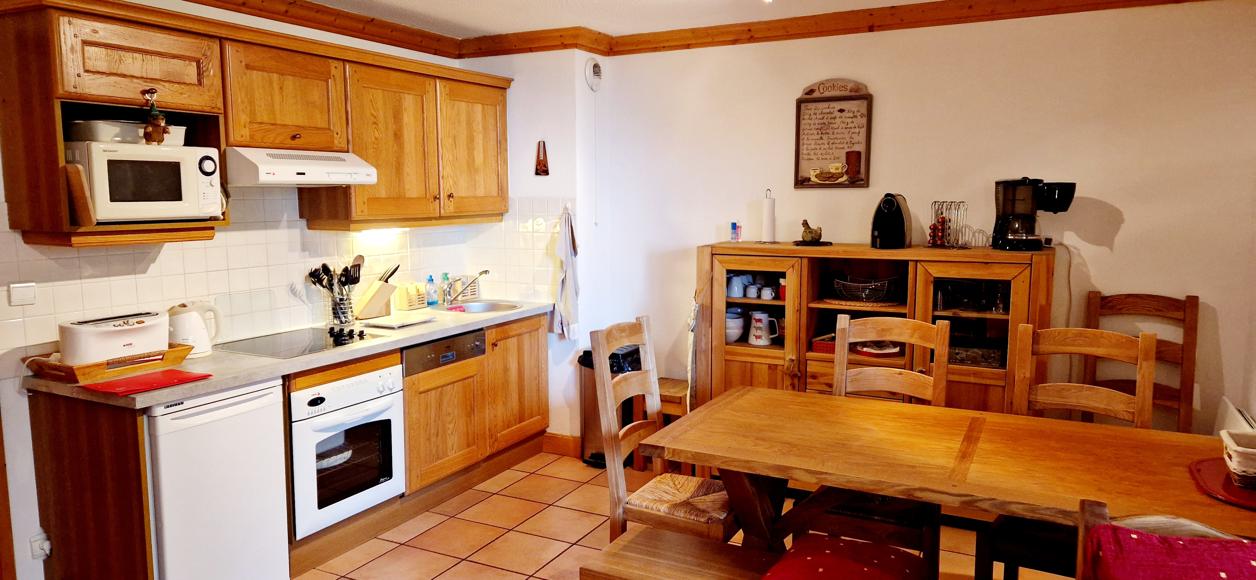 Un coin cuisine avec réfrigérateur, un four, 4 plaques de cuisson, une micro-onde, une hotte aspirante, un lave-vaisselle, une cafetière électrique, une cafetière nespresso. Cuisine très bien équipée avec beaucoup de rangements.