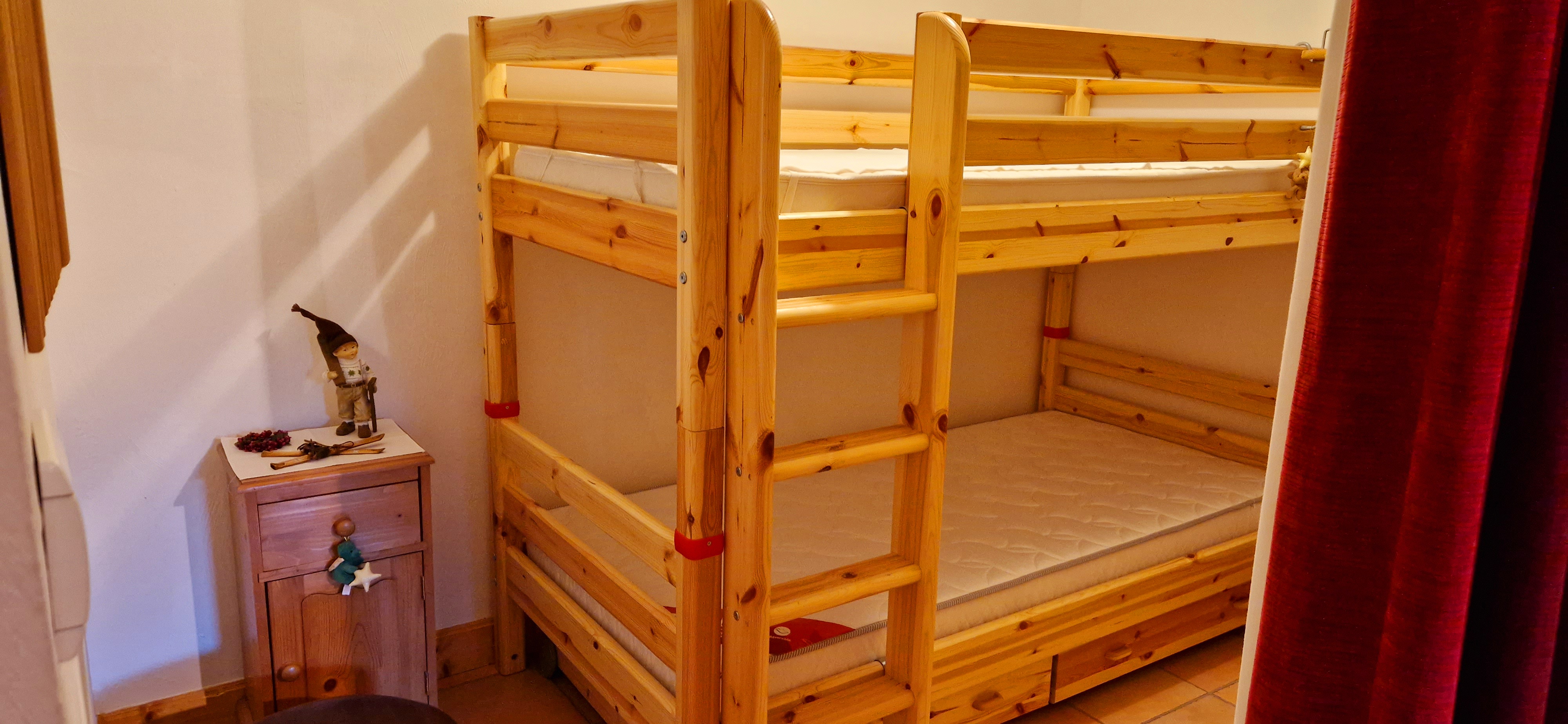 Un coin montagne spacieux avec deux lits 1 place superposés et placard de rangement