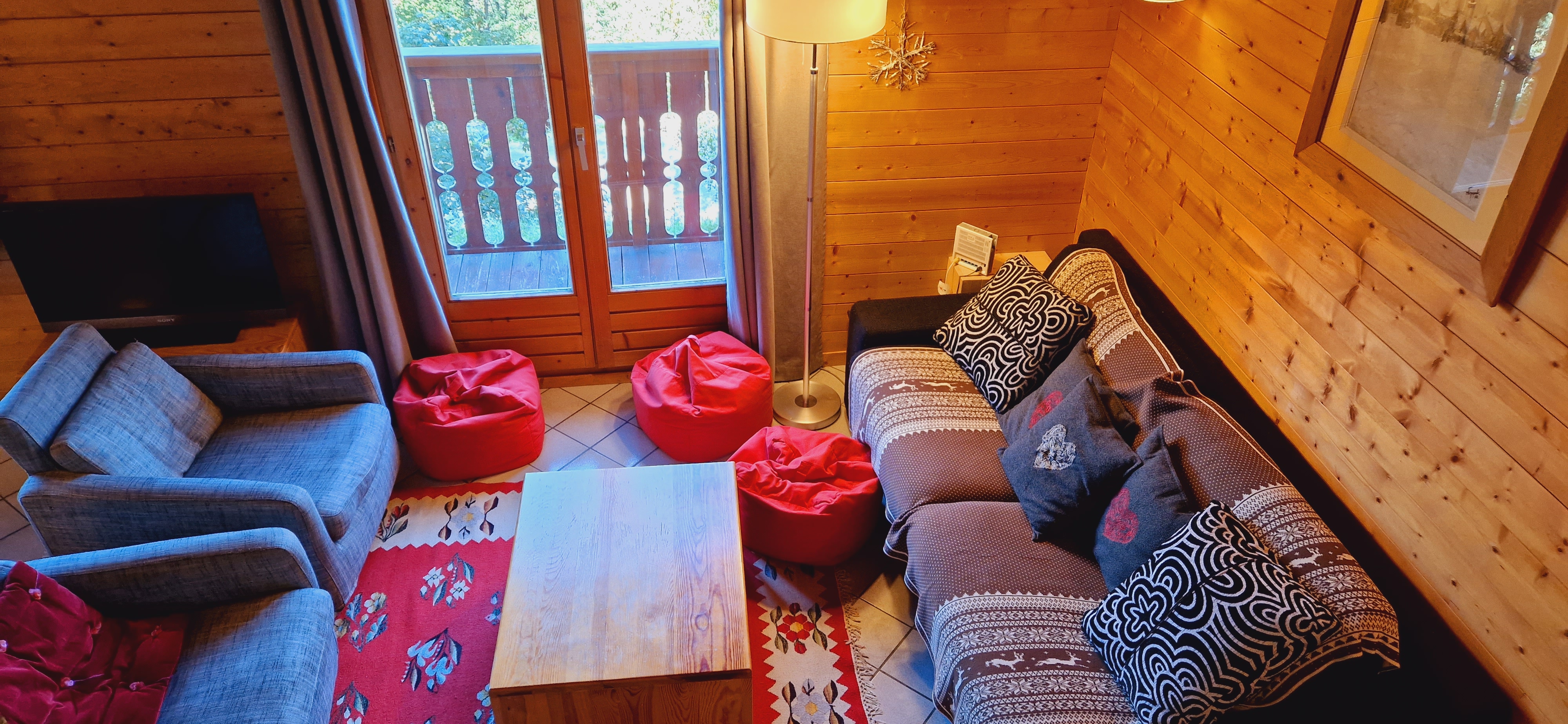 Chalet Individuel de 3 chambres + mezzanine, situé tout proche du cœur de la station. Composé de 2 étages, 110m², avec place de parking devant le chalet, il est exposé sud-ouest avec une magnifique vue sur la vallée et le mont Blanc.