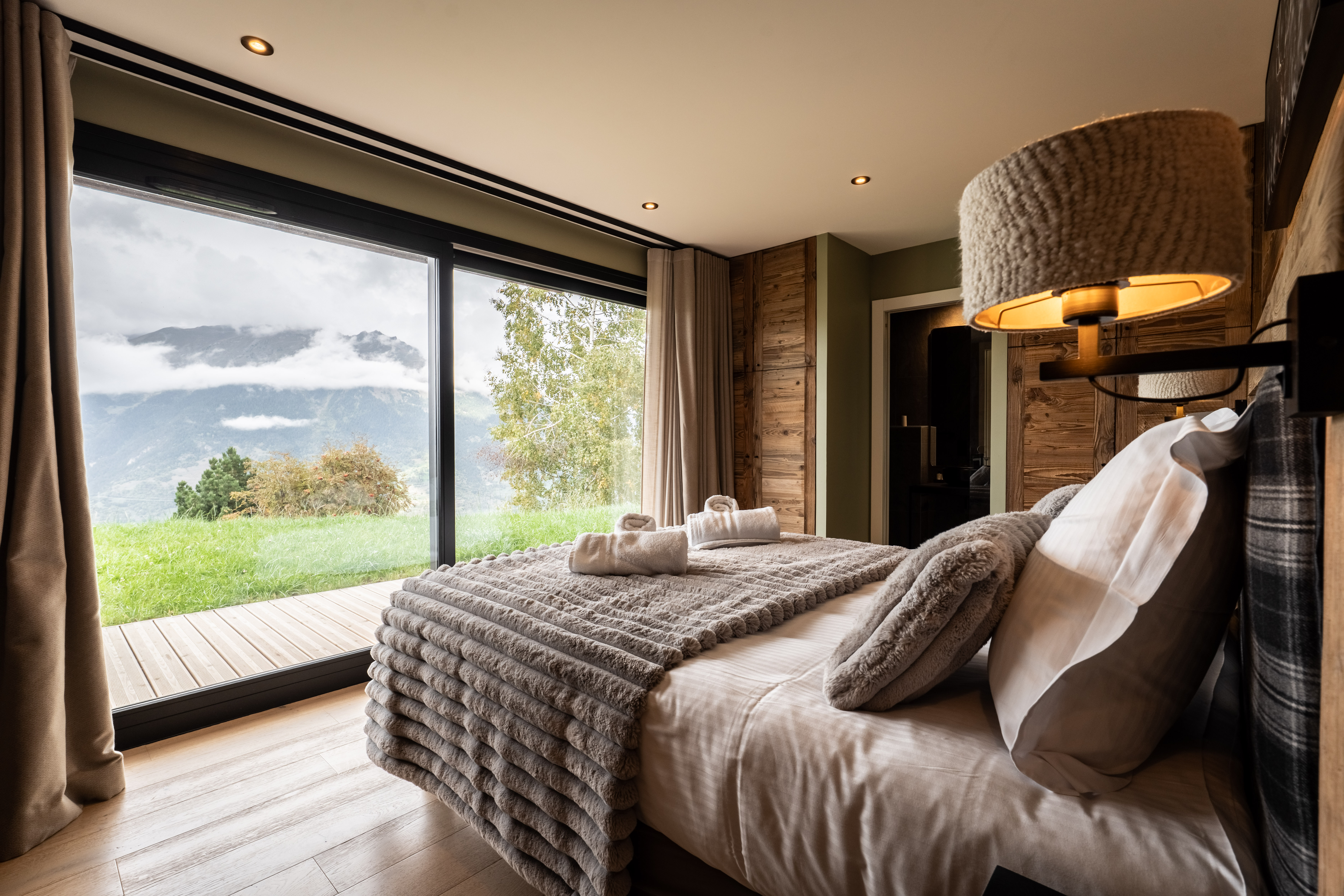 Une chambre 2, en suite avec un lit double en 160 cm et sa salle de douche/WC indépendante, donnant accès à une terrasse avec superbe vue sur la vallée sans aucun vis-à-vis.