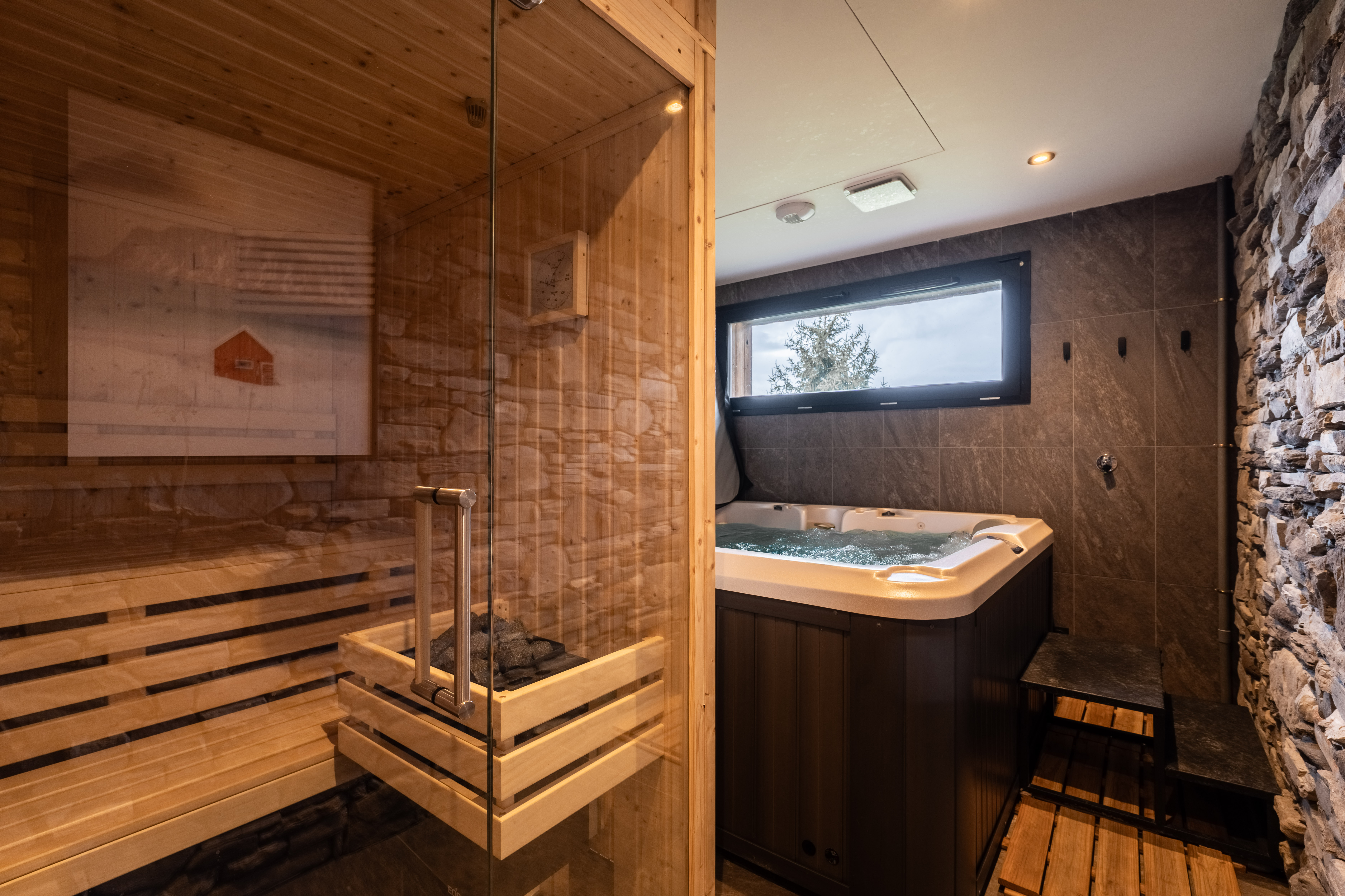 Un espace bien-être avec un large jacuzzi 4/5 places et un petit sauna 2/3 places