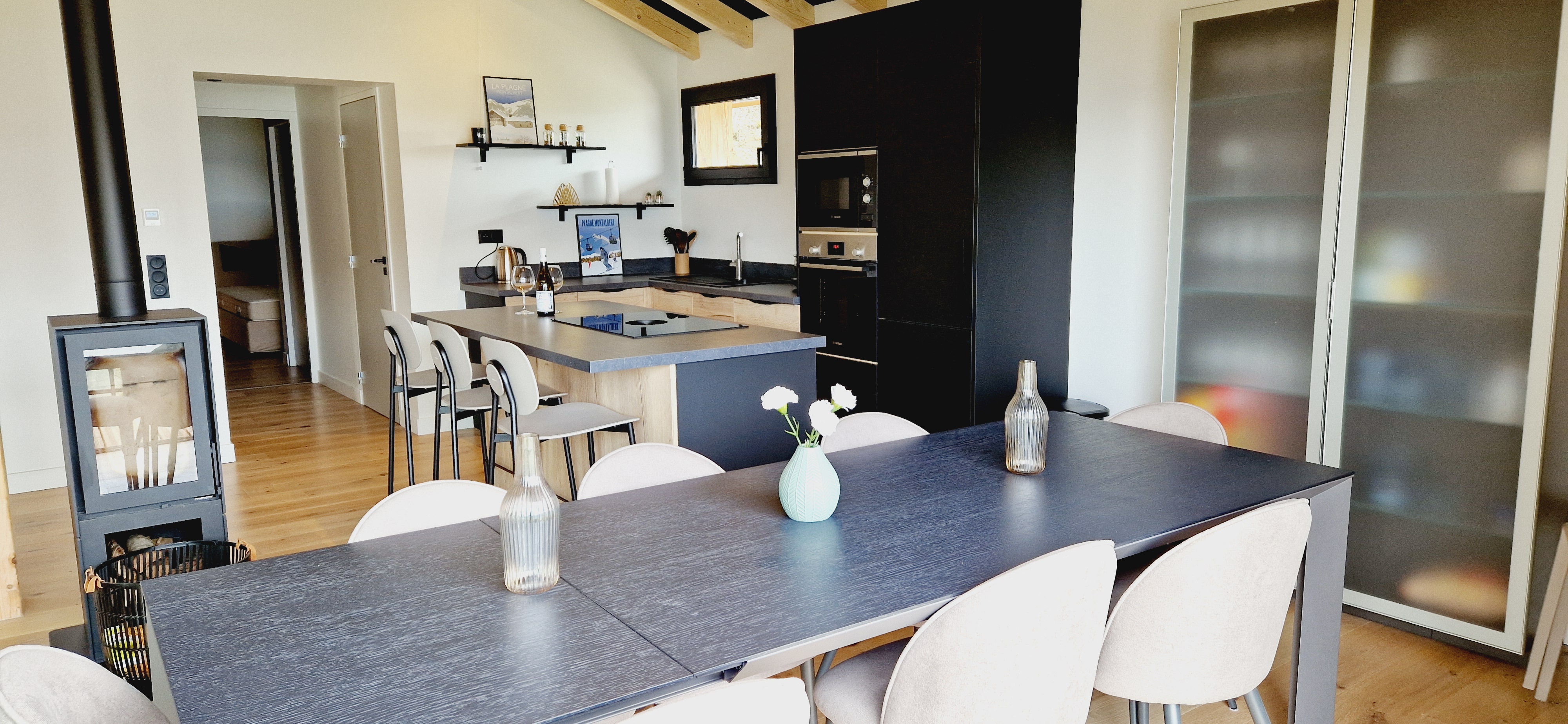 Cuisine ouverte, moderne et parfaitement équipée : four, réfrigérateur avec congélateur, lave-vaisselle, micro-ondes, plaques de cuisson, grille-pain, bouilloire, machine Nespresso, appareil à fondue, etc.