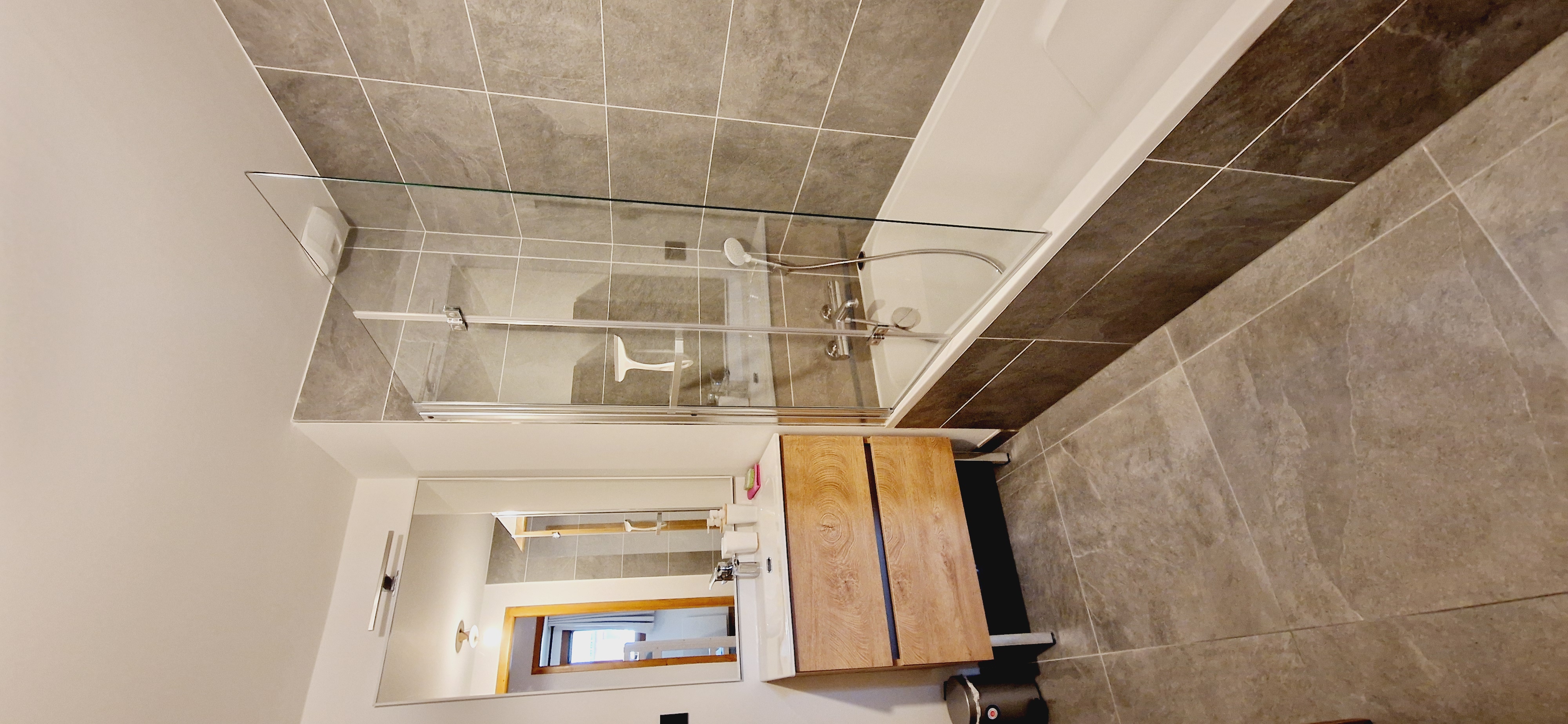 Une chambre en suite avec un lit double en 160cm, un placard de rangement et une salle de douche privative