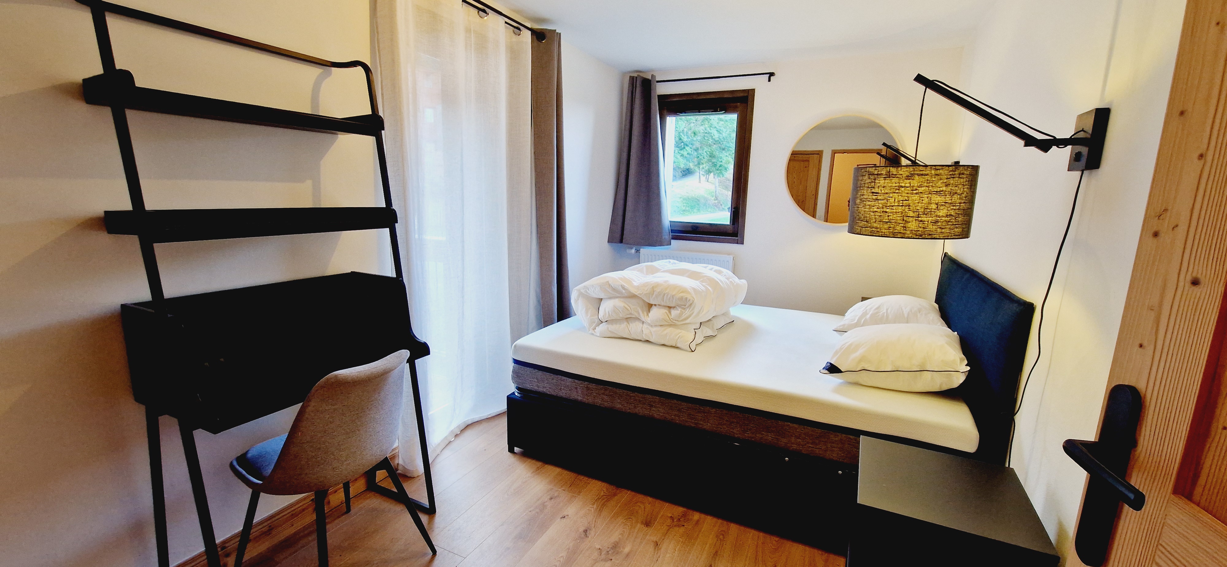 Une chambre avec un lit double en 140 avec sa salle de bain attenante.