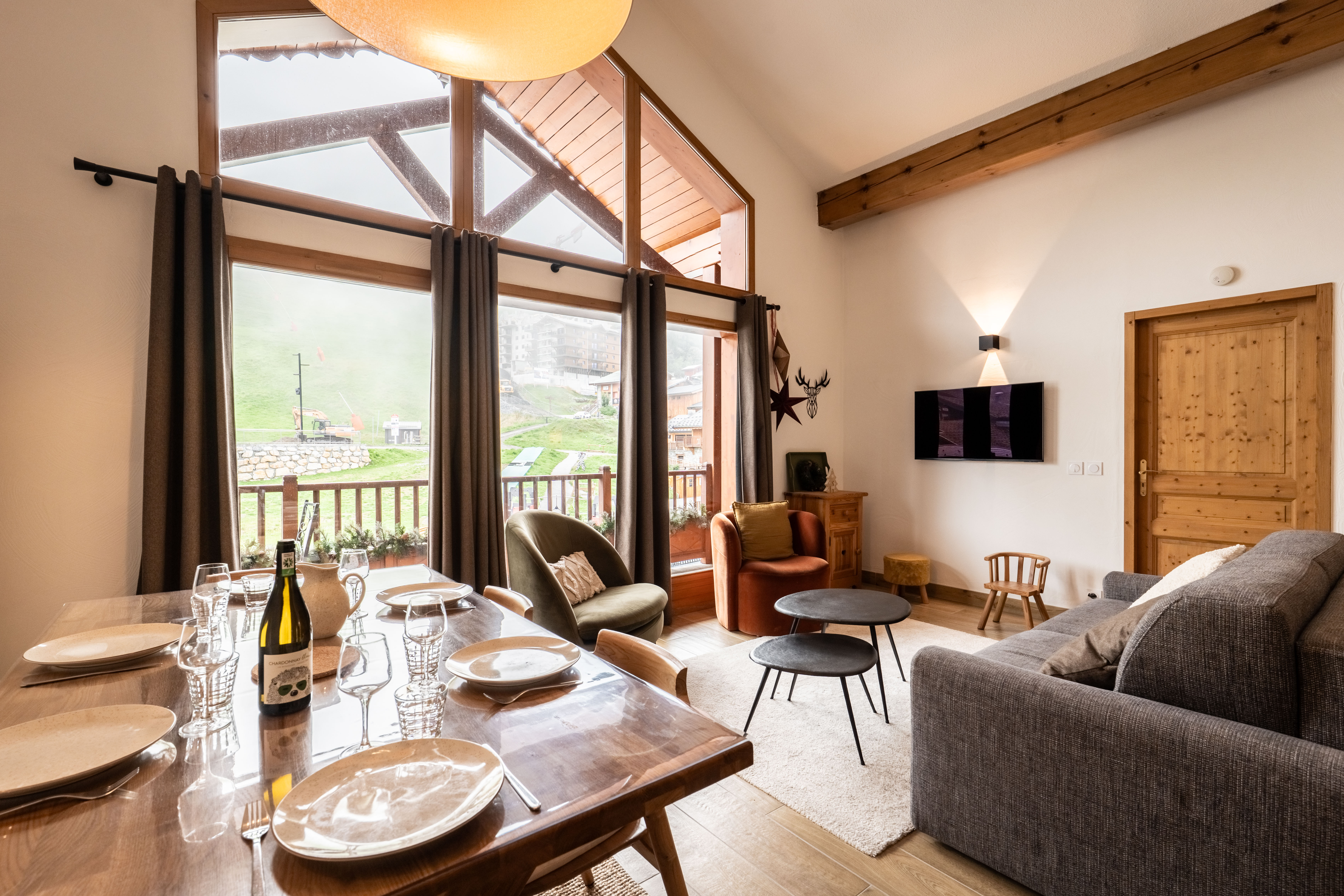 • Salon-séjour spacieux et lumineux : équipé d’un canapé convertible, d’une télévision, et d’une grande table à manger, parfait pour partager des moments conviviaux en famille ou entre amis. Accès direct au balcon offrant une vue dégagée sur les pistes et le front de neige.