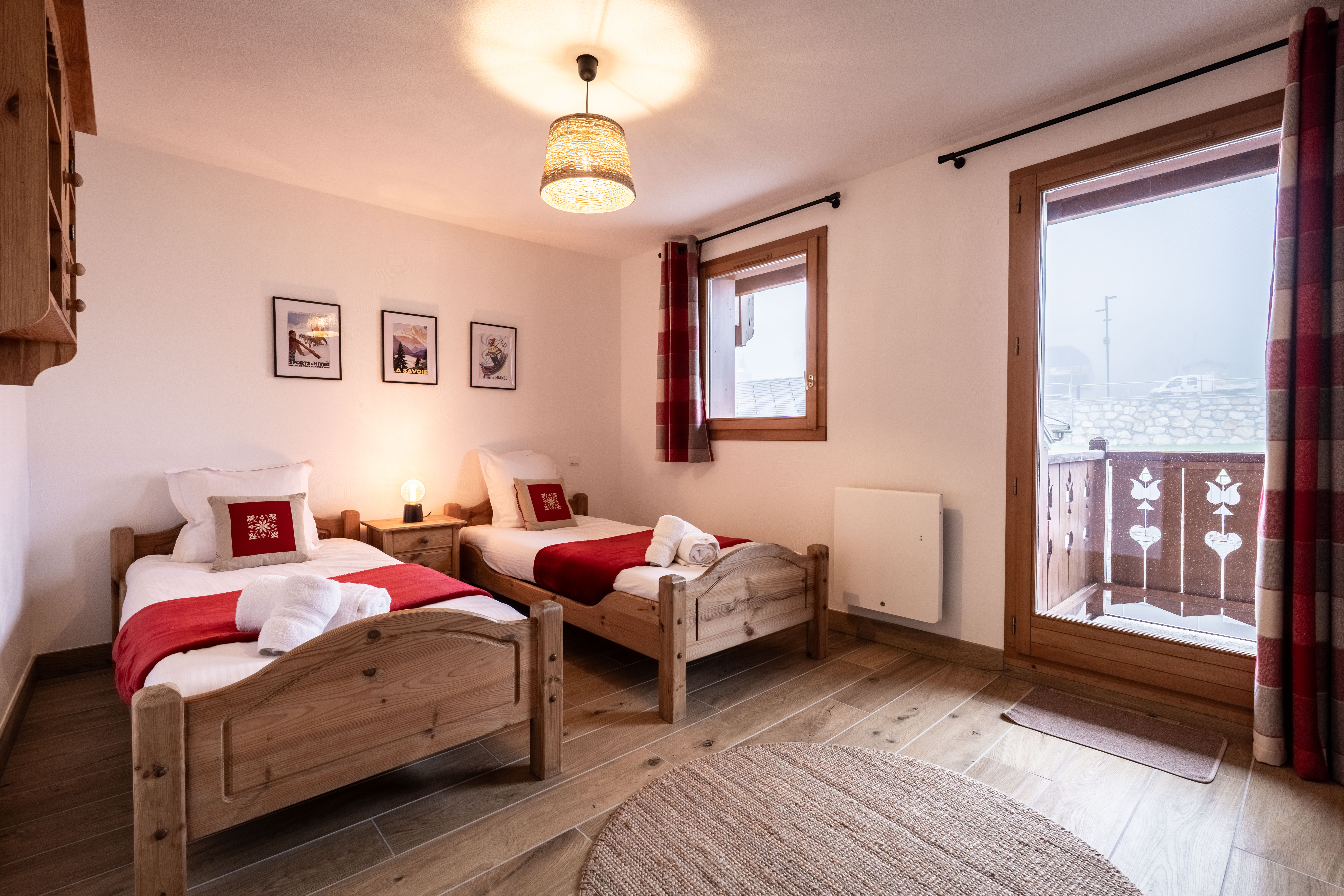 • Chambre 1 : 2 lits simples (90 cm) avec salle de bain privative, WC, et accès au balcon.