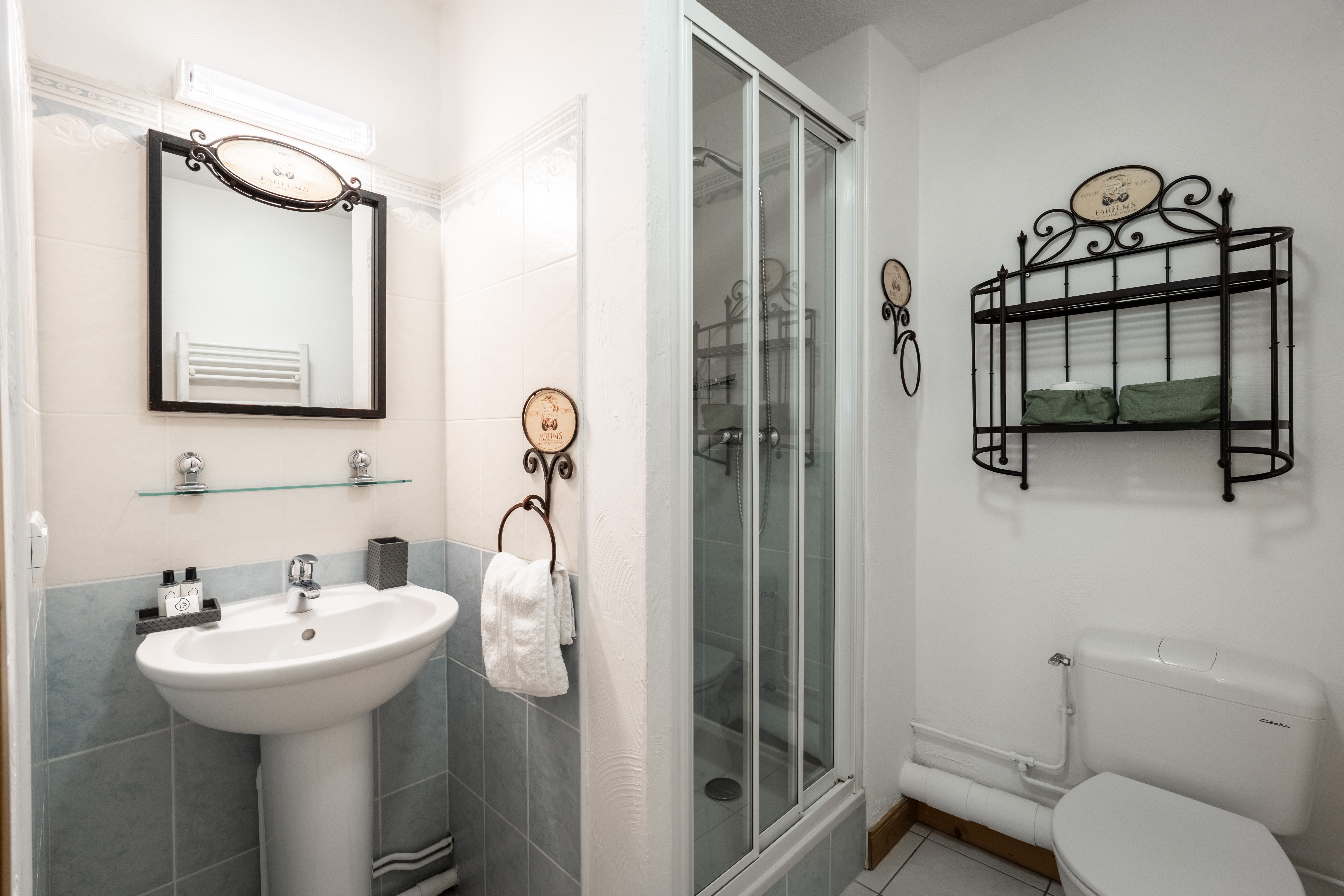 • Chambre 3 : 1 lit double (140 cm) avec salle de douche privative, WC, et accès au balcon.