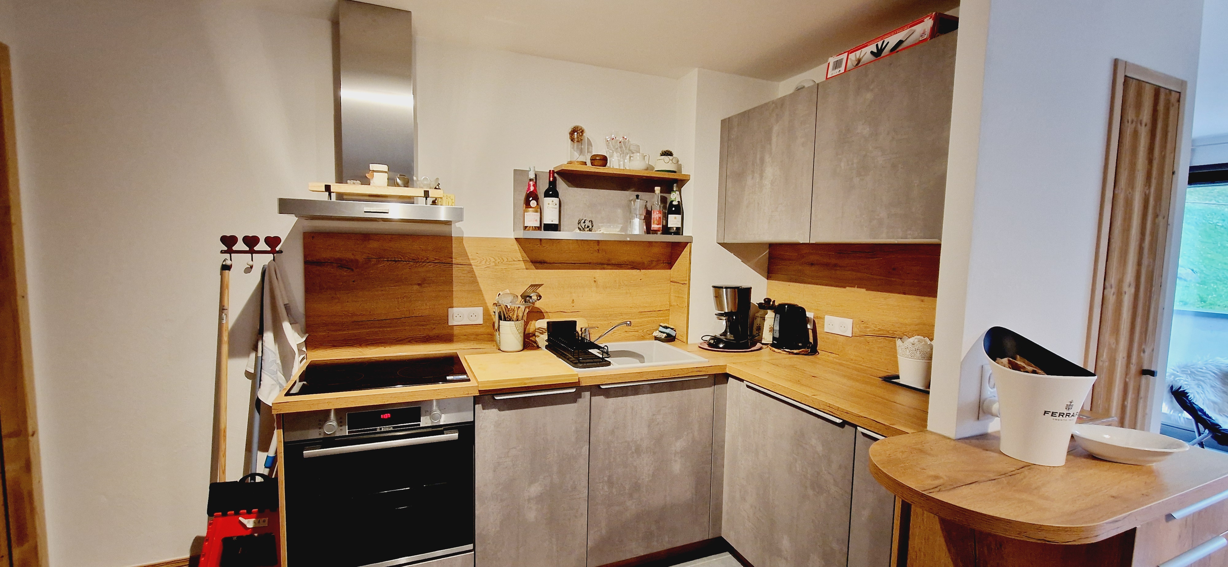 Une cuisine meublée et équipée avec tout le confort nécessaire: réfrigérateur, four, plaque de cuisson, micro-onde, bouilloire, cafetière électrique, grille-pain, lave-vaisselle, appareil à raclette.