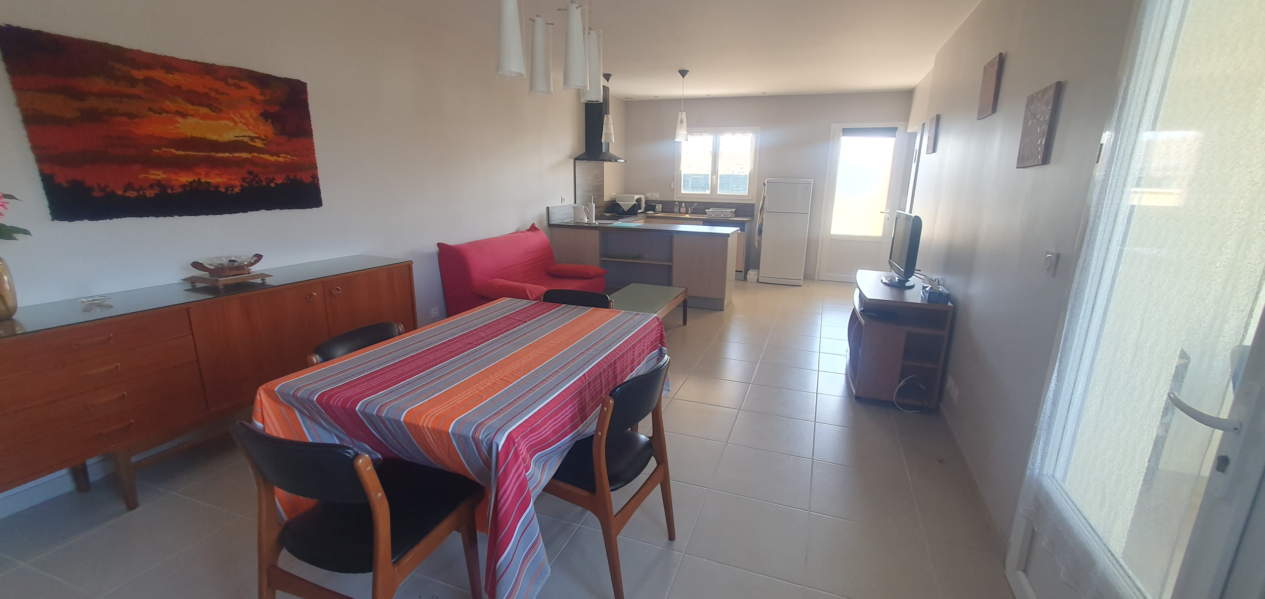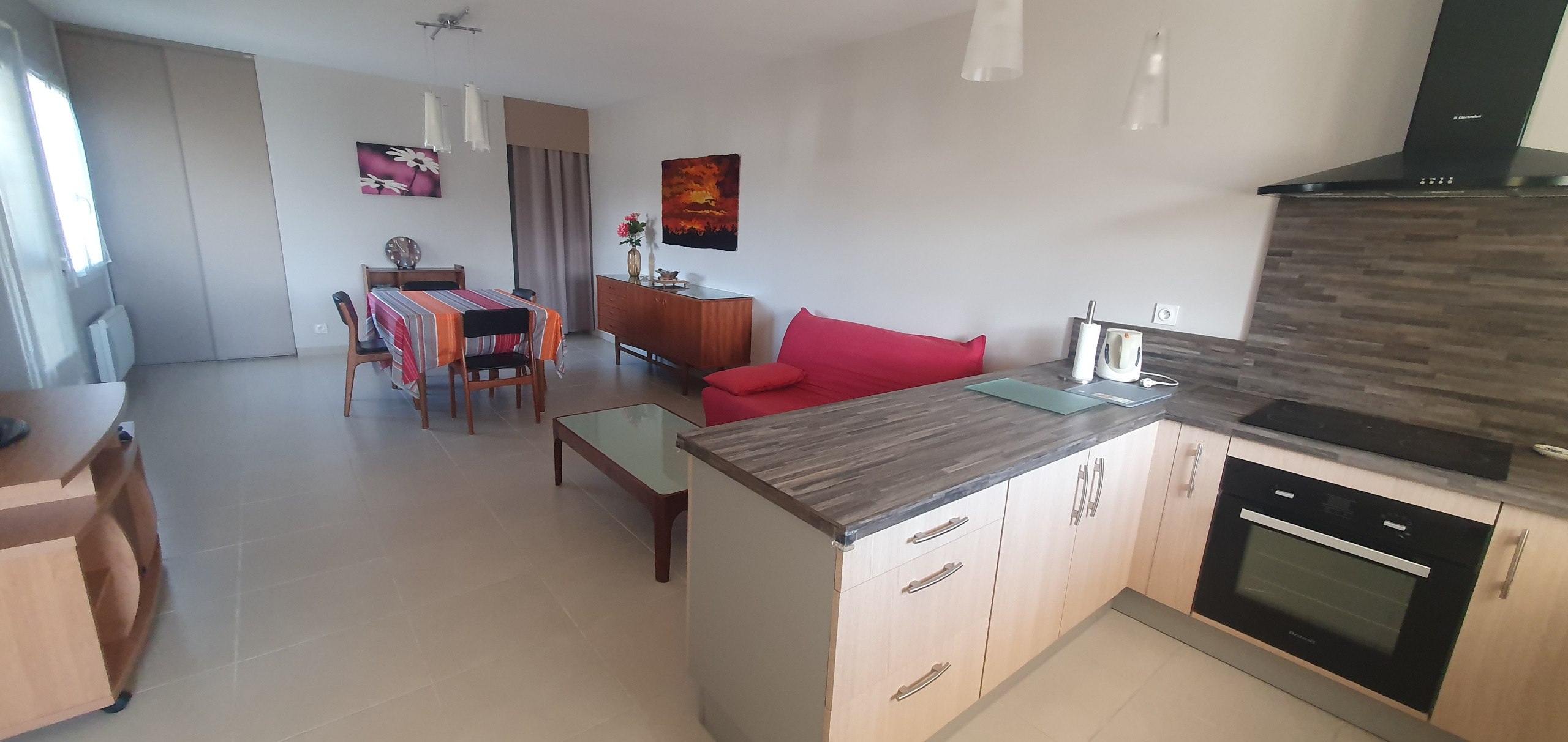 Salon spacieux et lumineux, salle à manger conviviale avec une cuisine ouverte entièrement équipée.