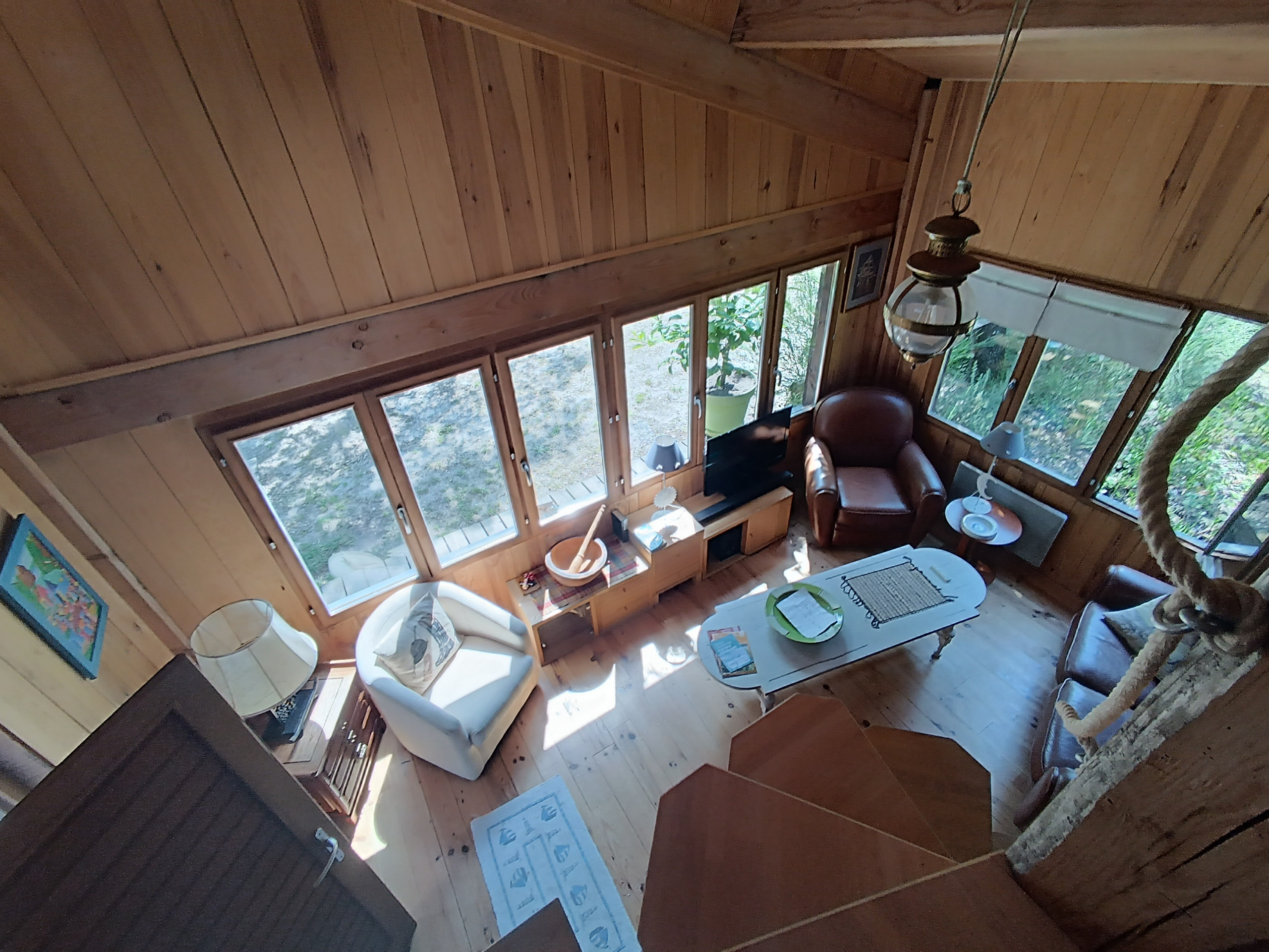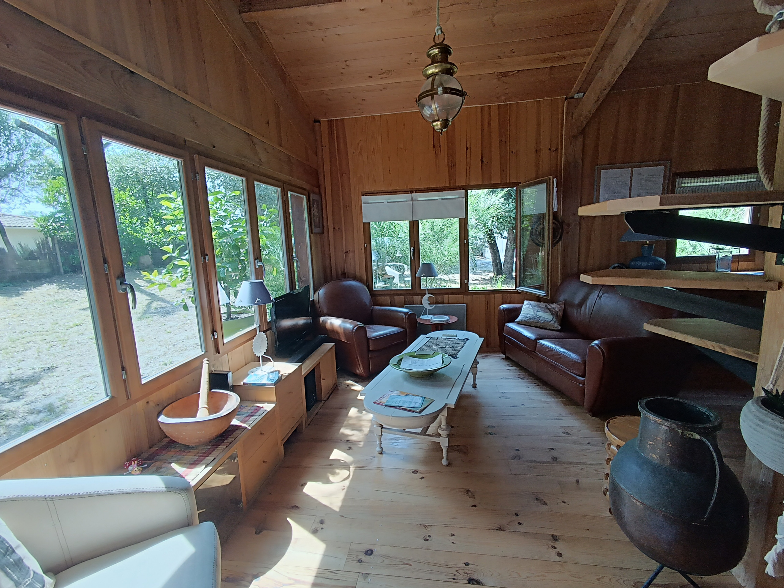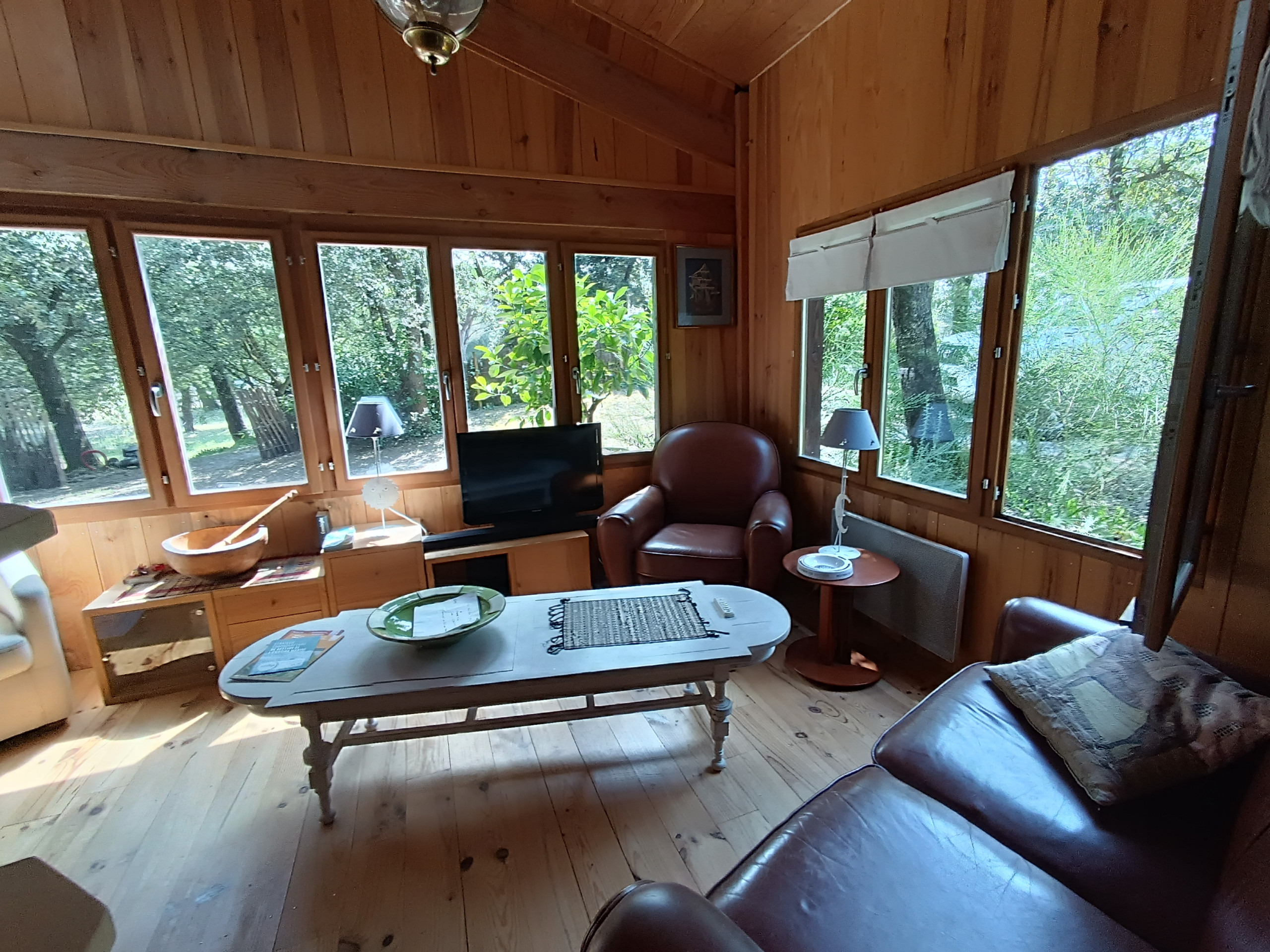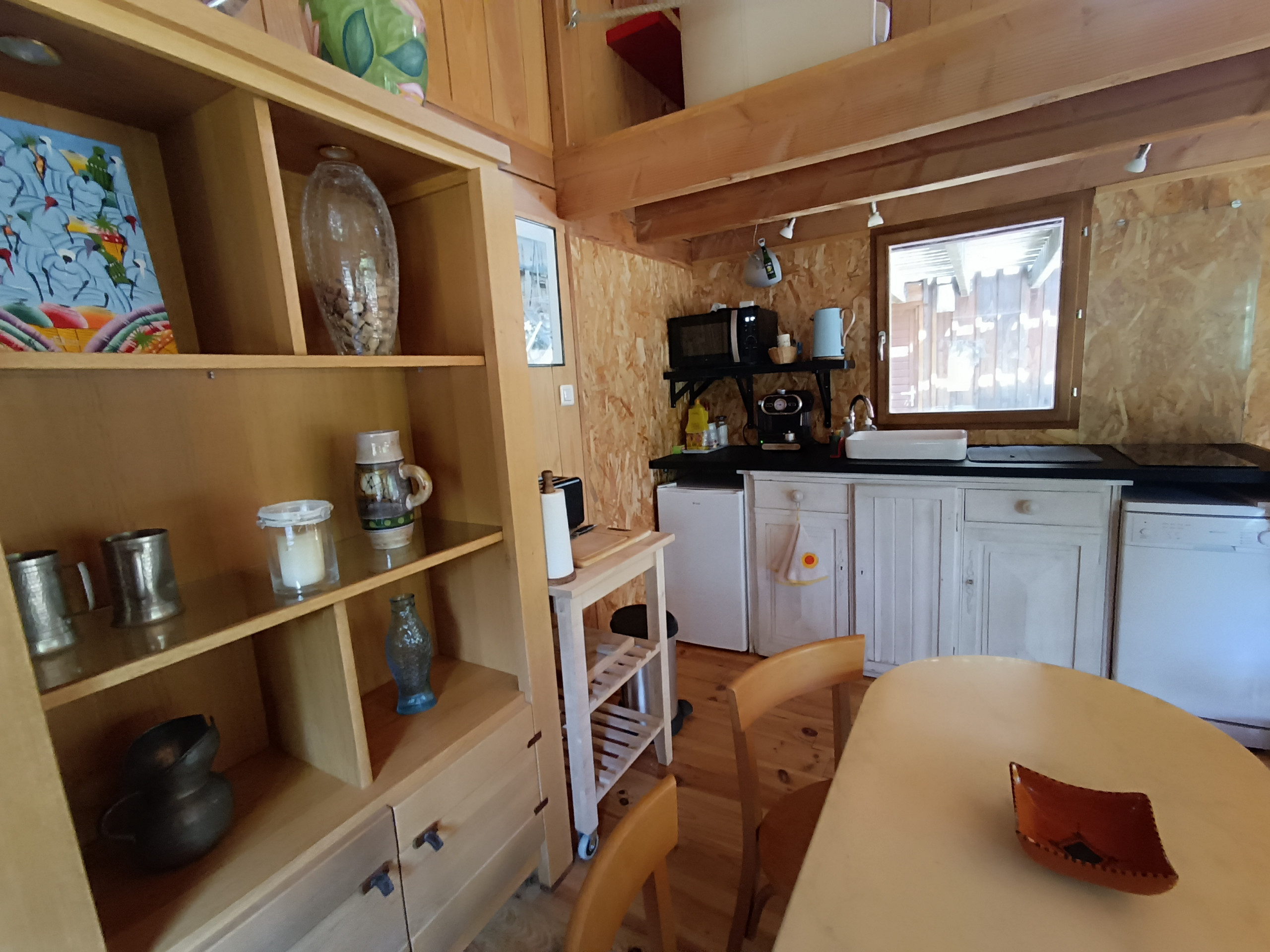 Chalet composé d'une cuisine équipée de plaques électriques, réfrigérateur, lave-vaisselle donnant sur pièce à vivre avec TV et WIFI