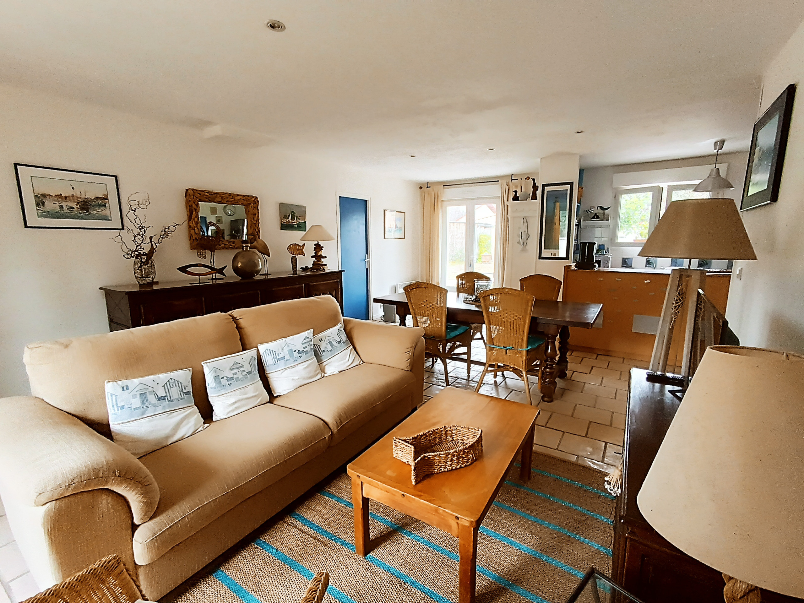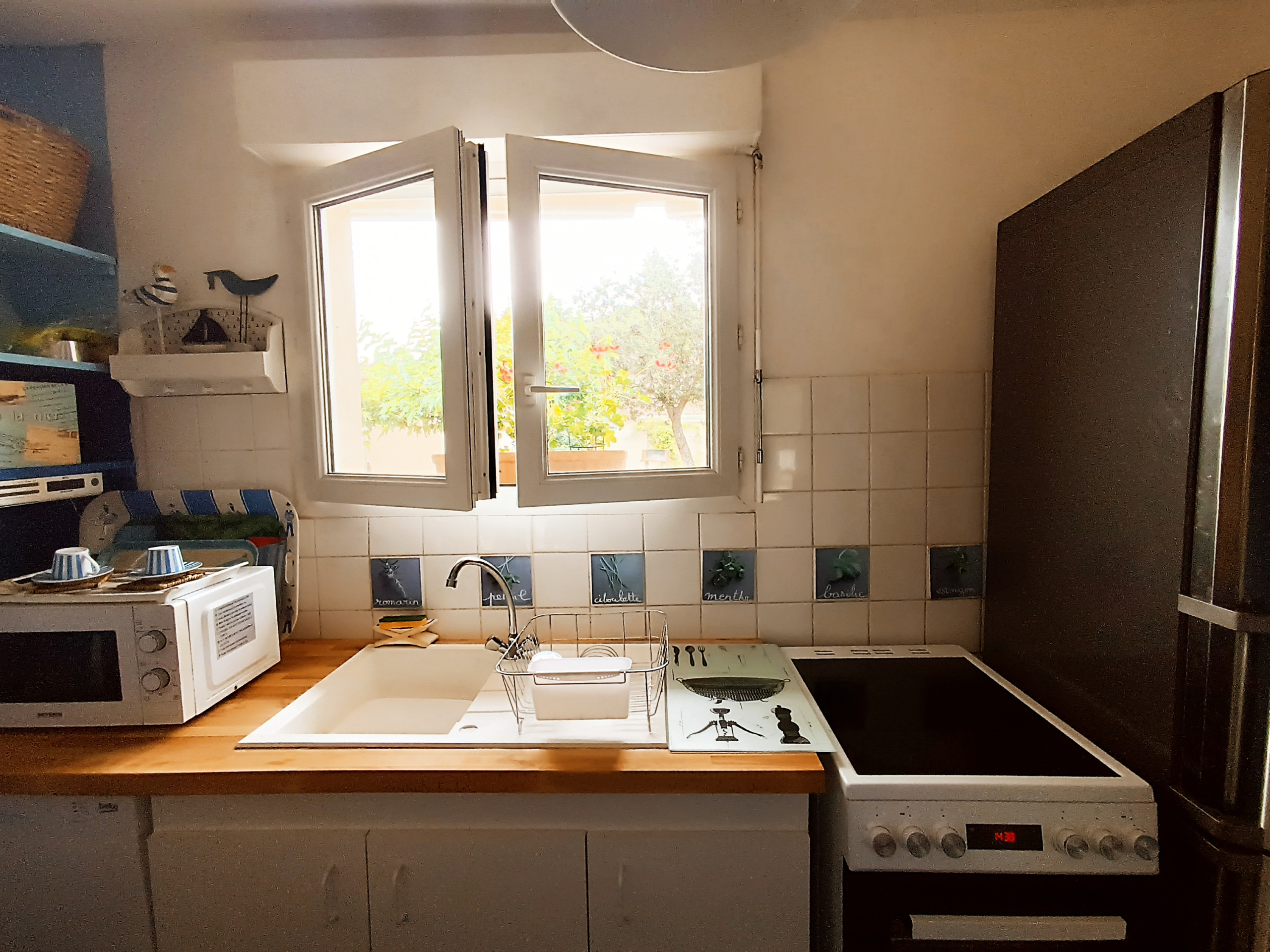 Jolie villa sur terrain arboré clos, composée d'un séjour avec TV, cuisine ouverte avec cuisinière vitrocéramique, micro-ondes, four, réfrigérateur/congélateur, lave vaisselle, trois chambres avec chacune 1 lit en 140, salle d'eau avec lave linge, terrasse avec salon de jardin, 2 transats, barbecue