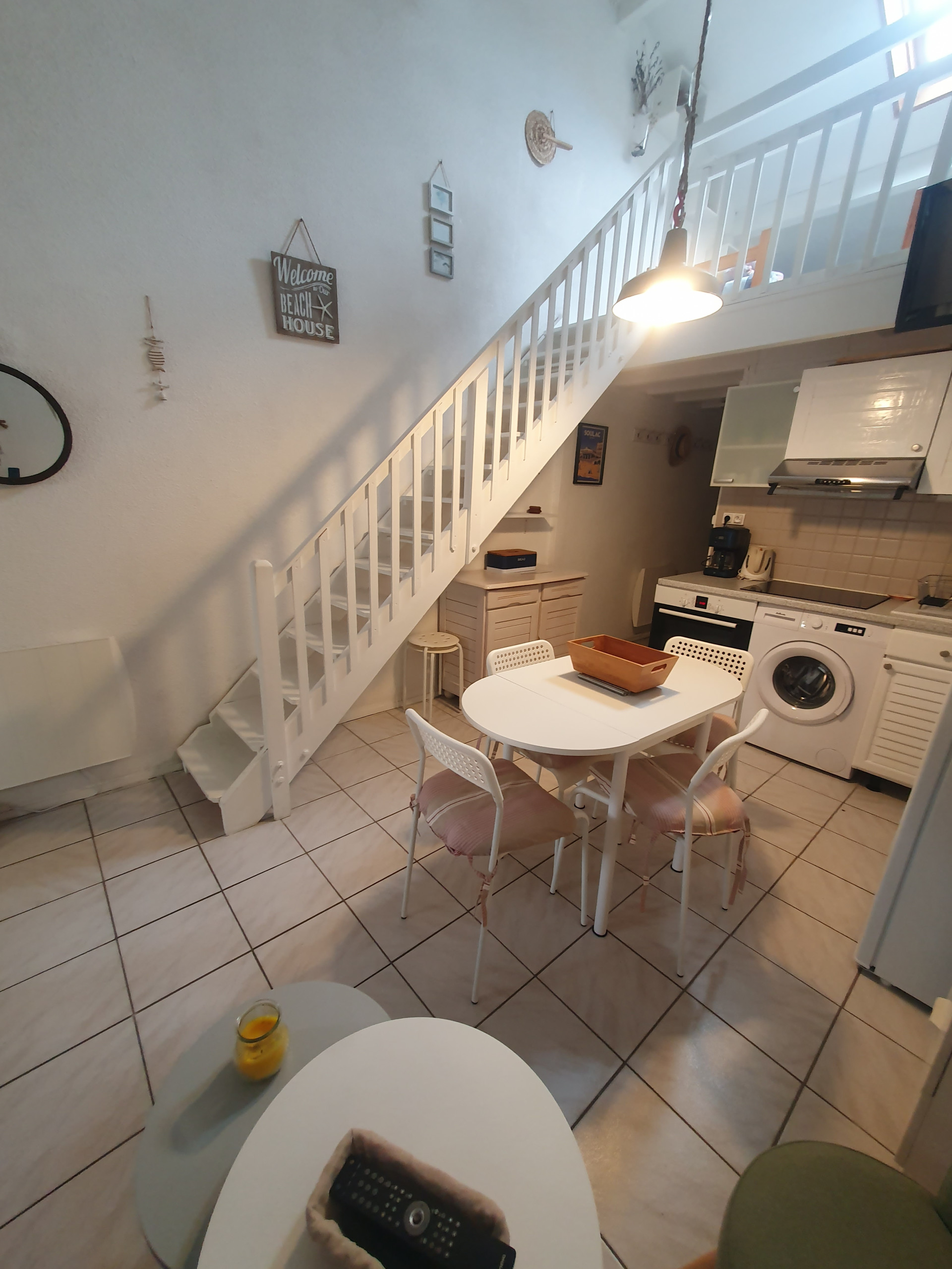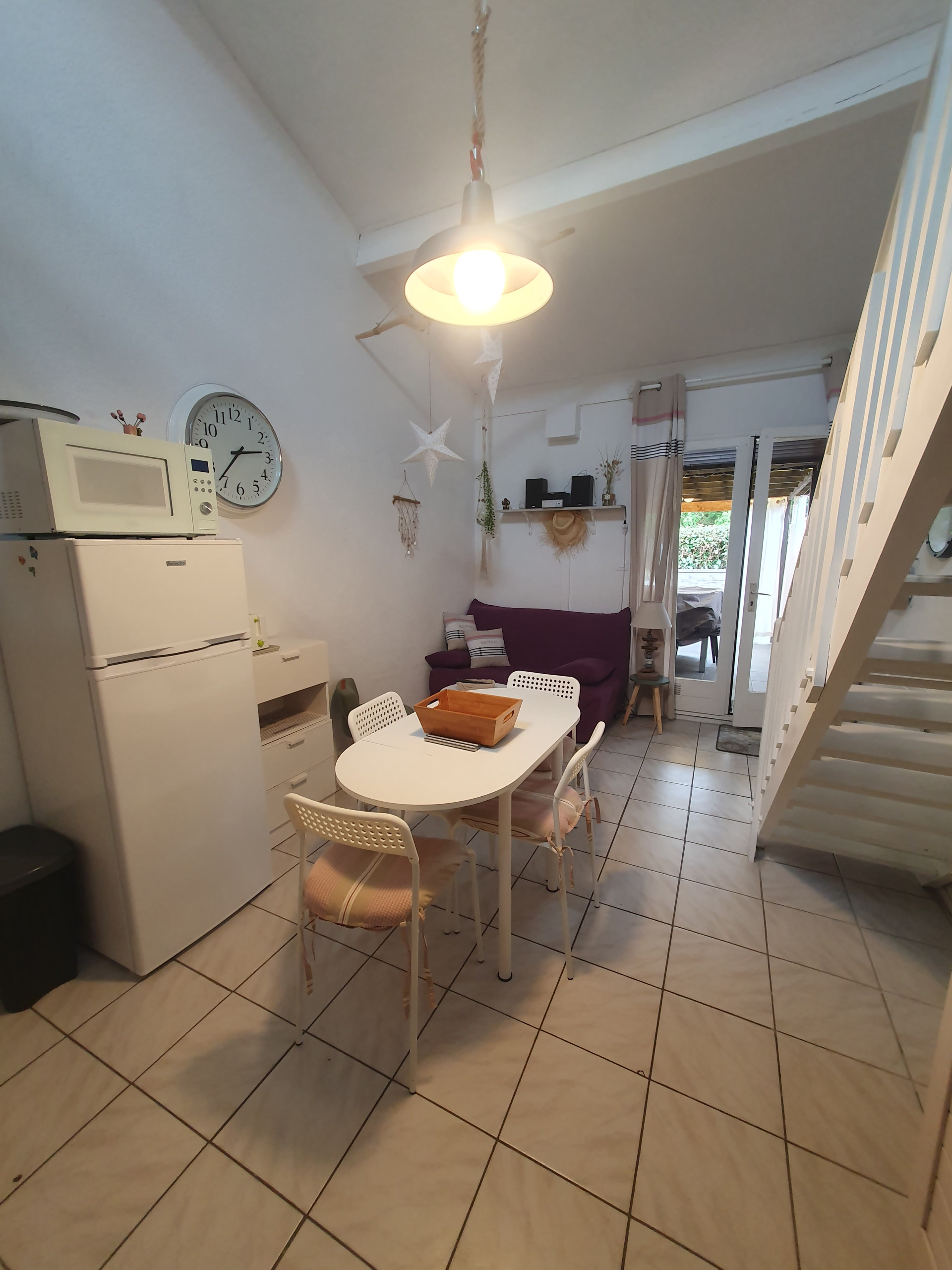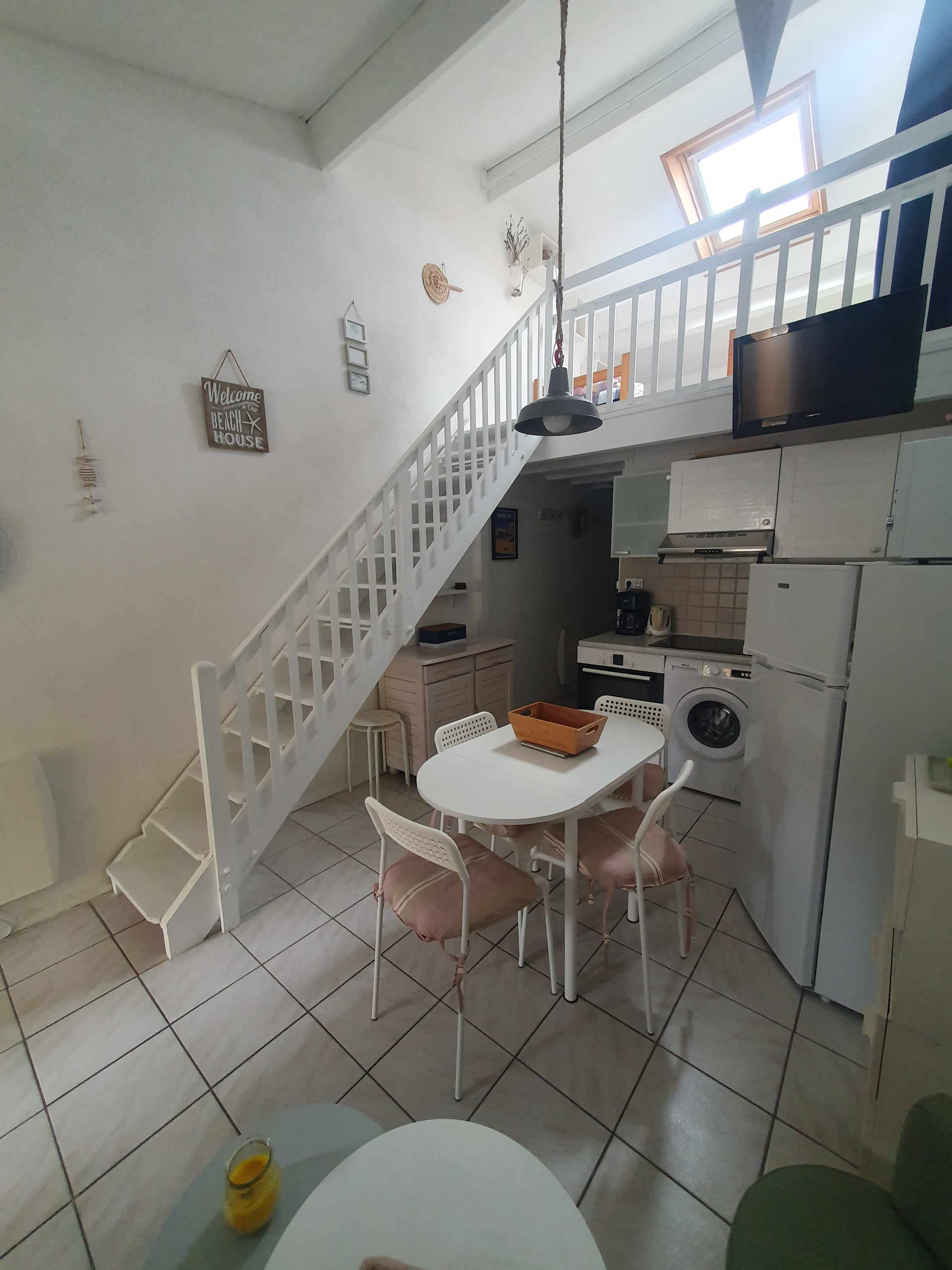 A proximité de la plage et des pistes cyclables, maison mitoyenne composée d'une cuisine équipée d'un réfrigérateur-congélateur, micro-ondes, plaque induction, donnant sur pièce à vivre avec canapé convertible en 140 et TV, lave-linge, salle de bain,wc