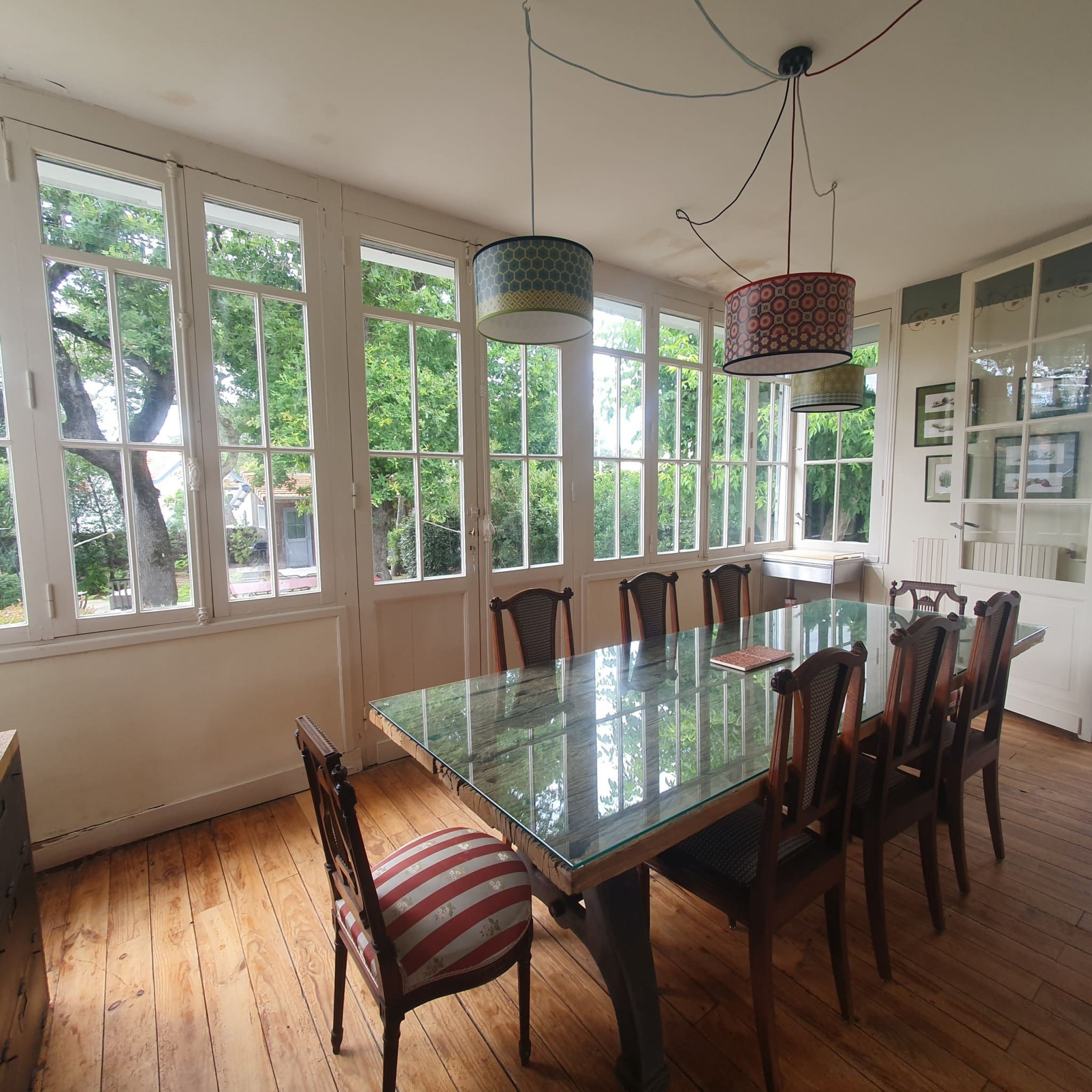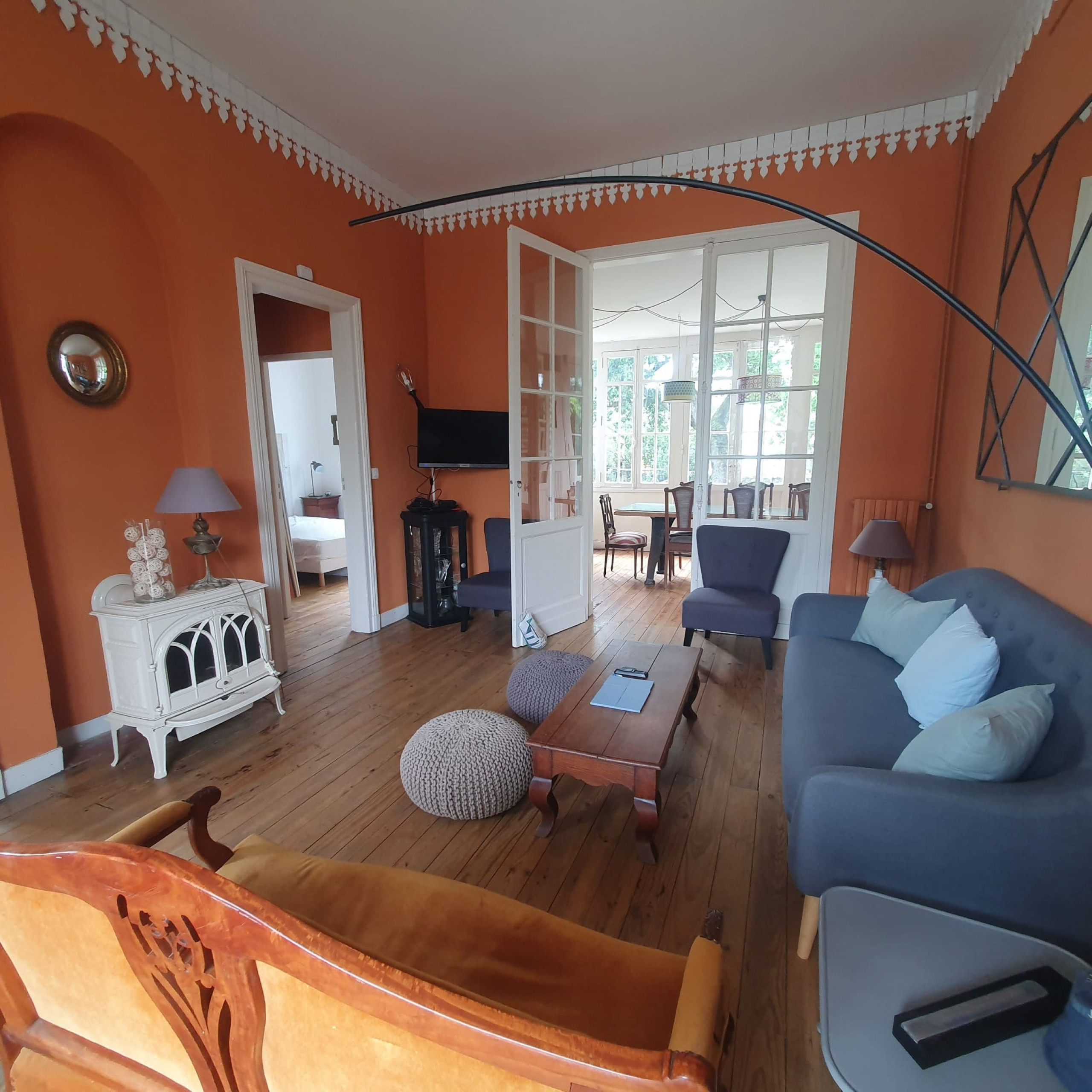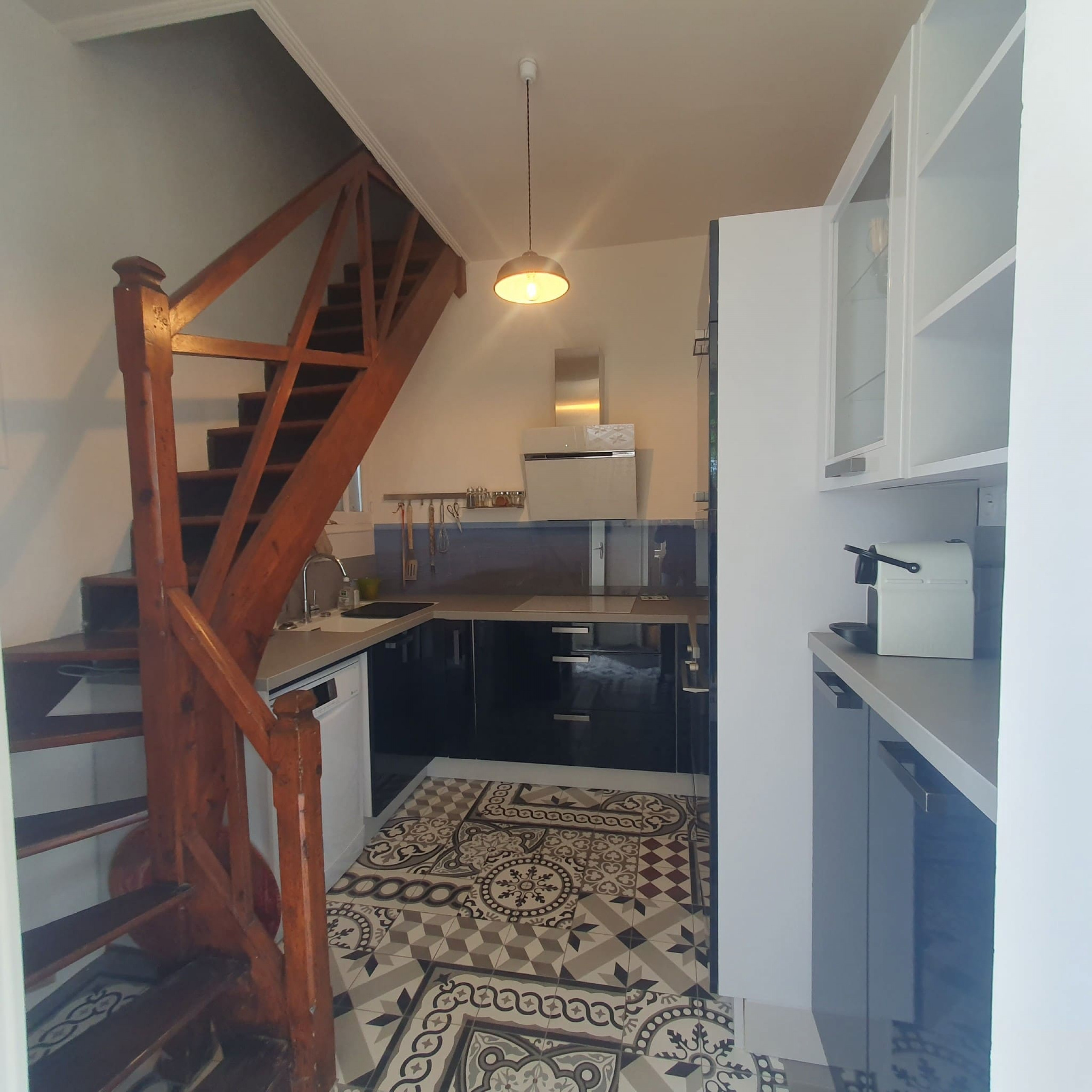 A l'étage, vous trouverez une petite chambre confortable avec un lit en 90 cm, idéale pour les enfants ou les invités. Au rez-de-chaussée, la maison dispose d'une cuisine entièrement équipée où vous pourrez préparer de délicieux repas. La salle à manger, dotée d'une magnifique verrière donnant sur le jardin, offre un espace convivial pour partager des repas en famille. Le grand salon vous invite à la détente avec son atmosphère chaleureuse. Une salle de bain avec WC est également disponible au rez-de-chaussée.