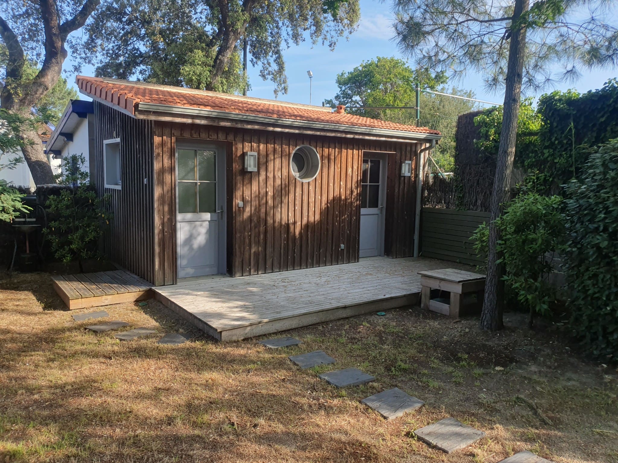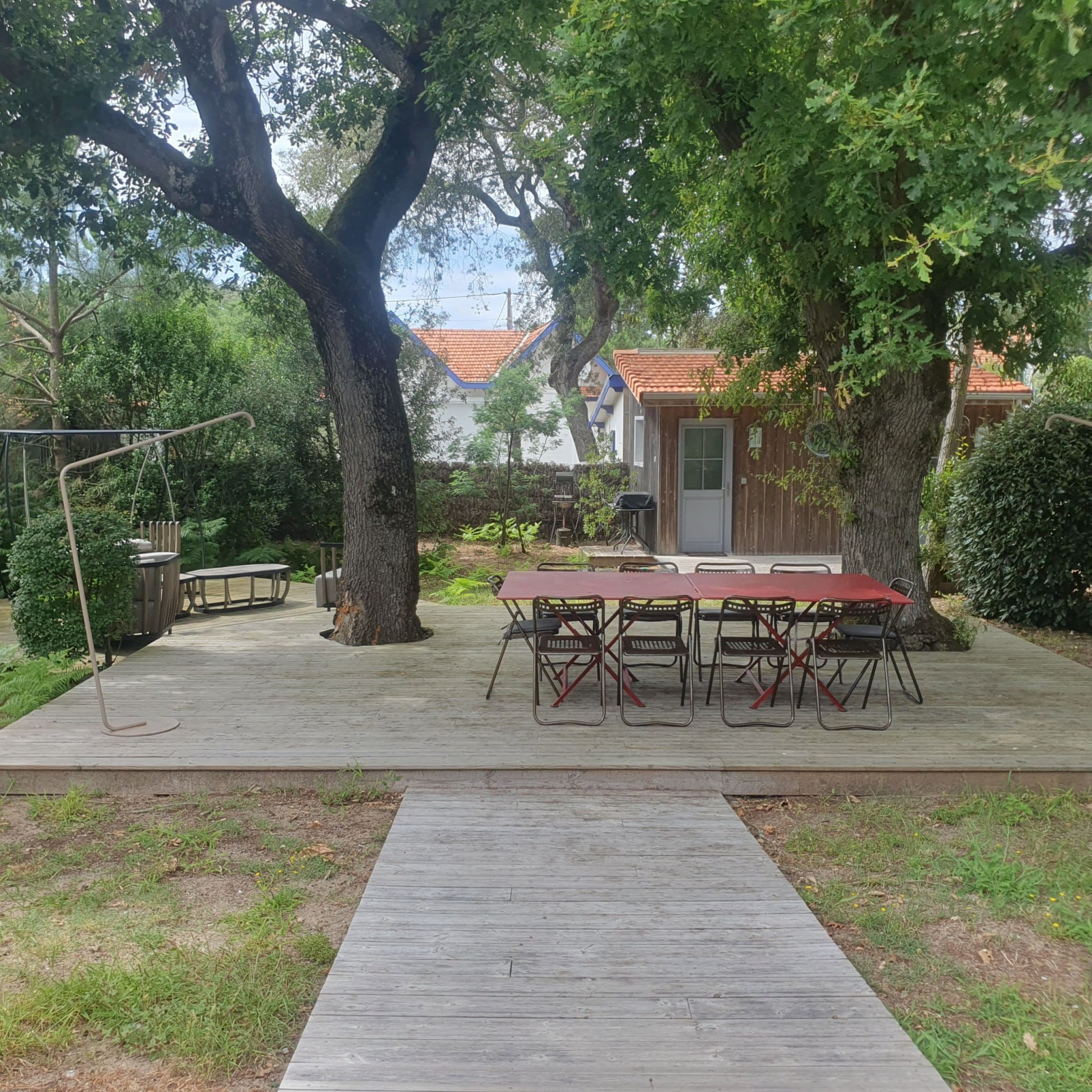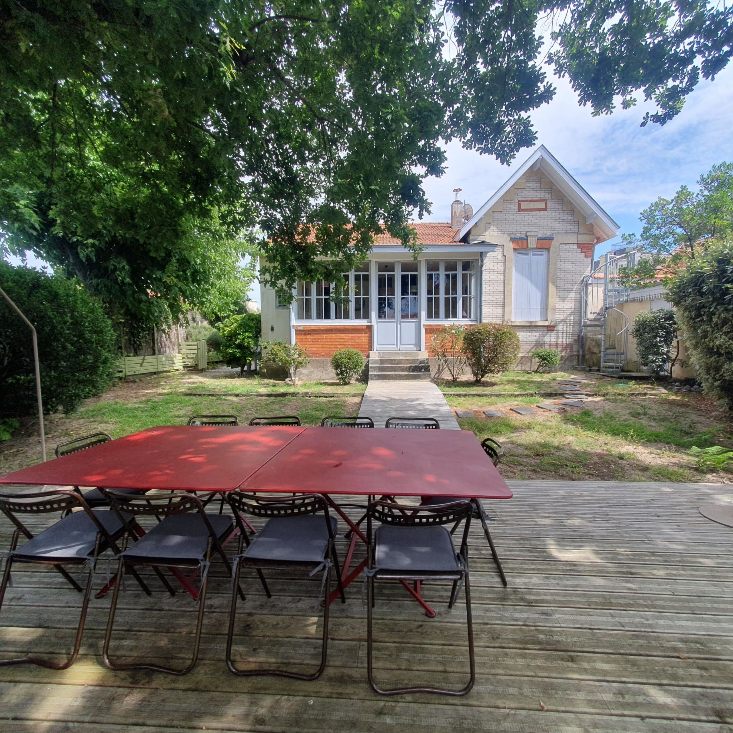 Le Grand jardin ombragé de 600m² grâce à 2 magnifiques chênes, au calme, ou l'agencement (terrasse en bois style Ferret) et le mobilier confort, invitent au farniente.