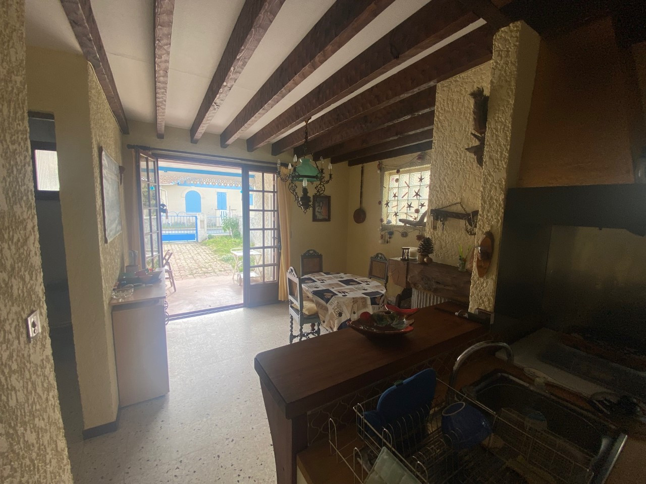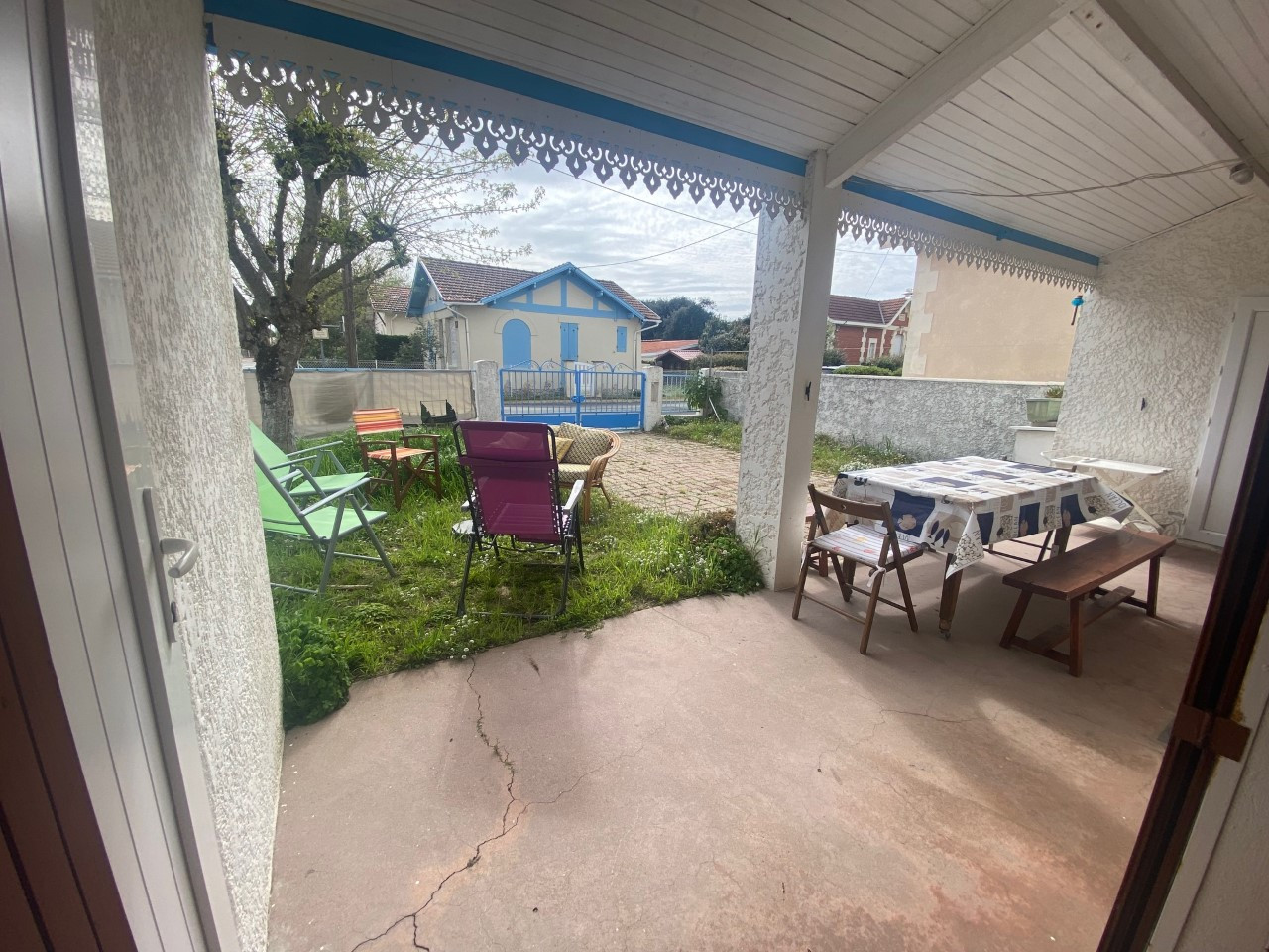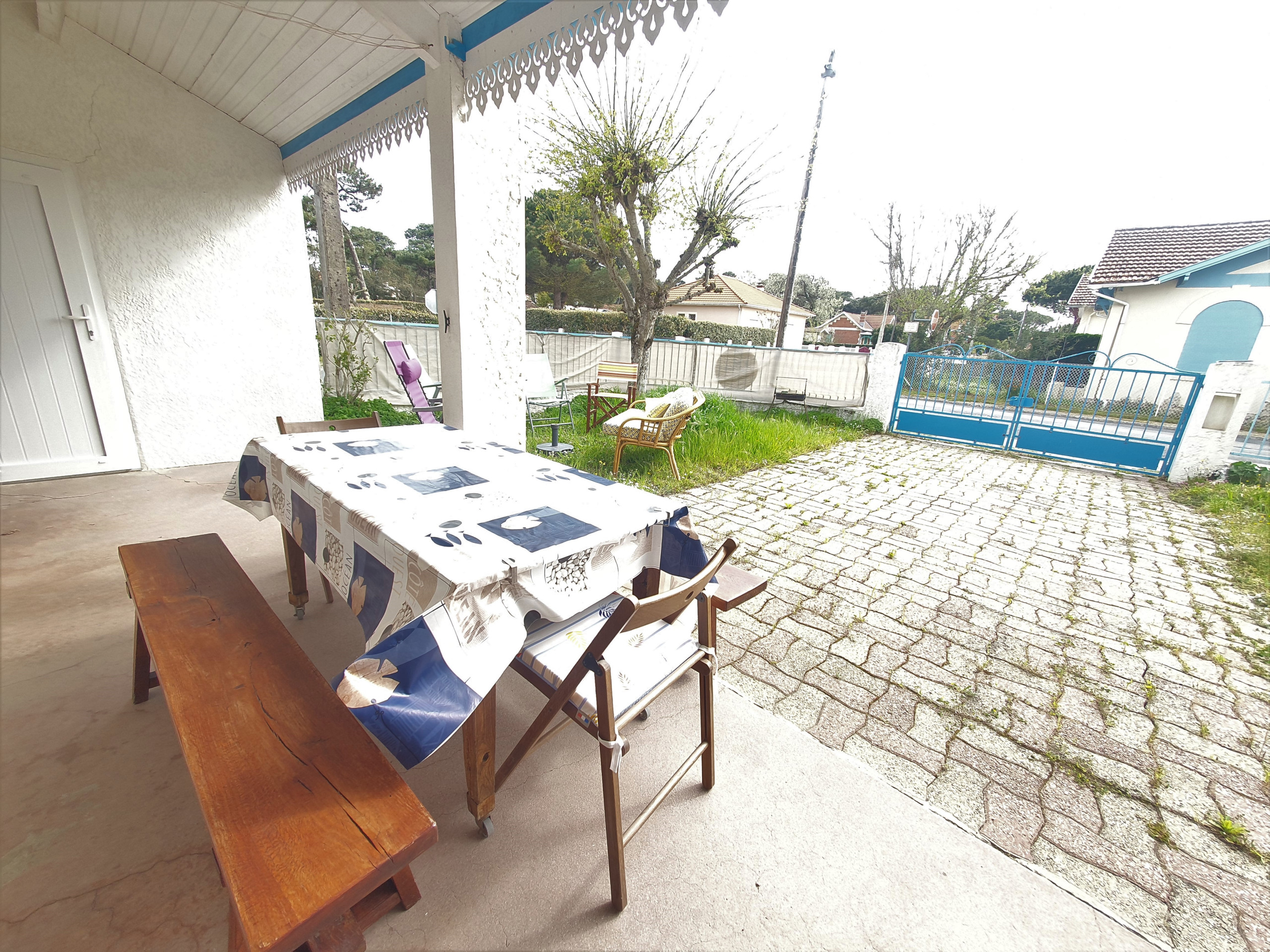 Terrasse abritée avec salon de jardin, parasol, petit barbecue, plancha, possibilité de rentrer la voiture