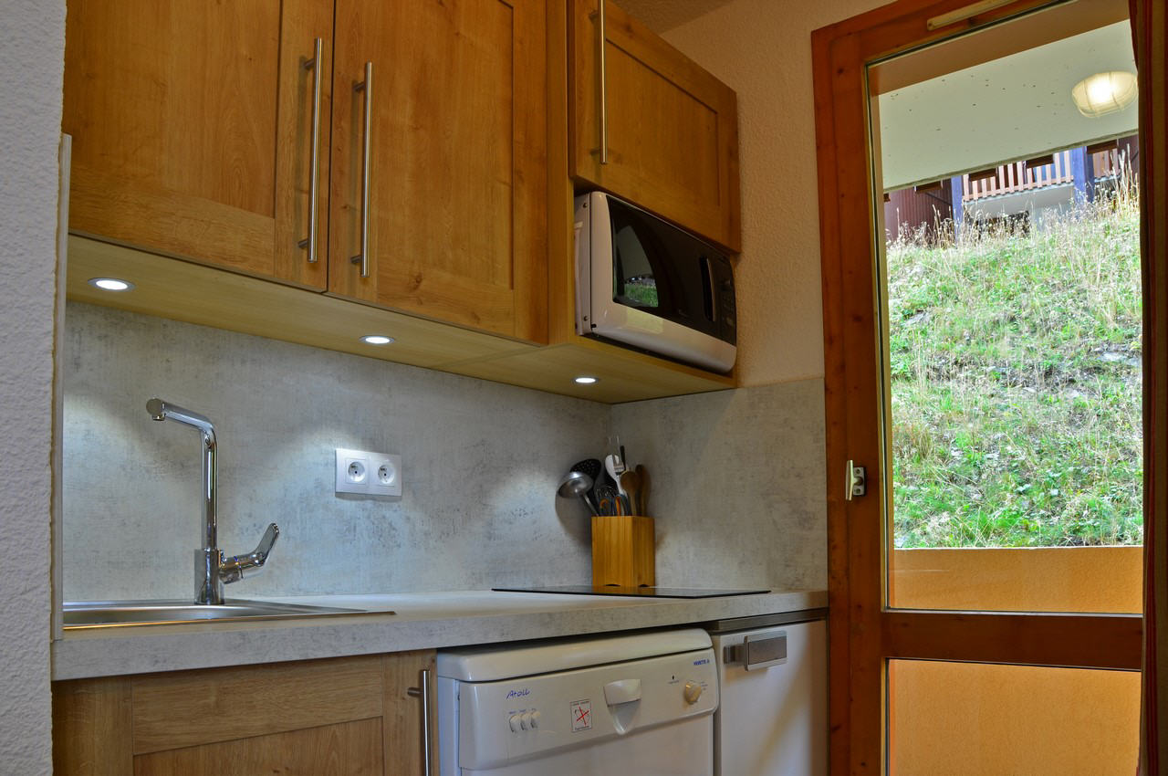 Coin cuisine : 2 plaques vitrocéramiques, réfrigérateur, lave-vaisselle, four combiné micro-ondes.
