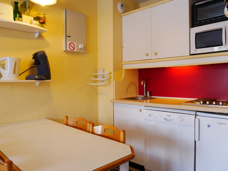 Coin cuisine ouvert sur séjour : 4 plaques électriques, réfrigérateur, lave-vaisselle, four micro-ondes, cafetière SENSEO, appareil à raclette, appareil à fondue, grille pain, bouilloire.