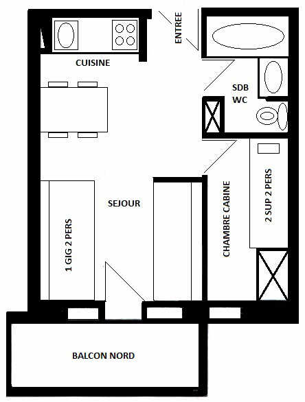 Studio cabine pour 4 personnes d'environ 22 m², en très bon état, exposé nord avec balcon/terrasse, côté vallée en rez de chaussée.