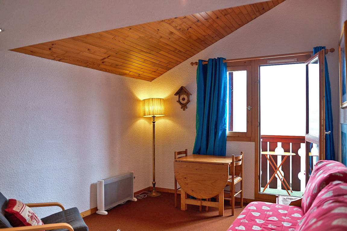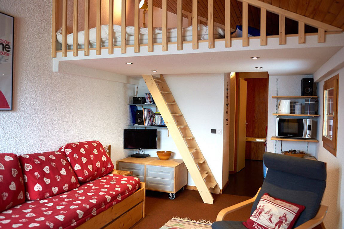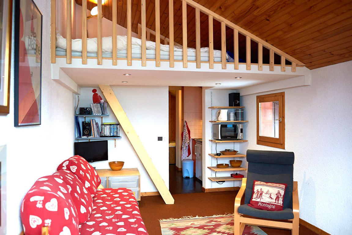 Studio + mezzanine (hauteur inférieur à 1m80) équipé pour 2 personnes d'environ 22 m², état correct, exposé nord vue vallée et Mont Blanc avec balcon.