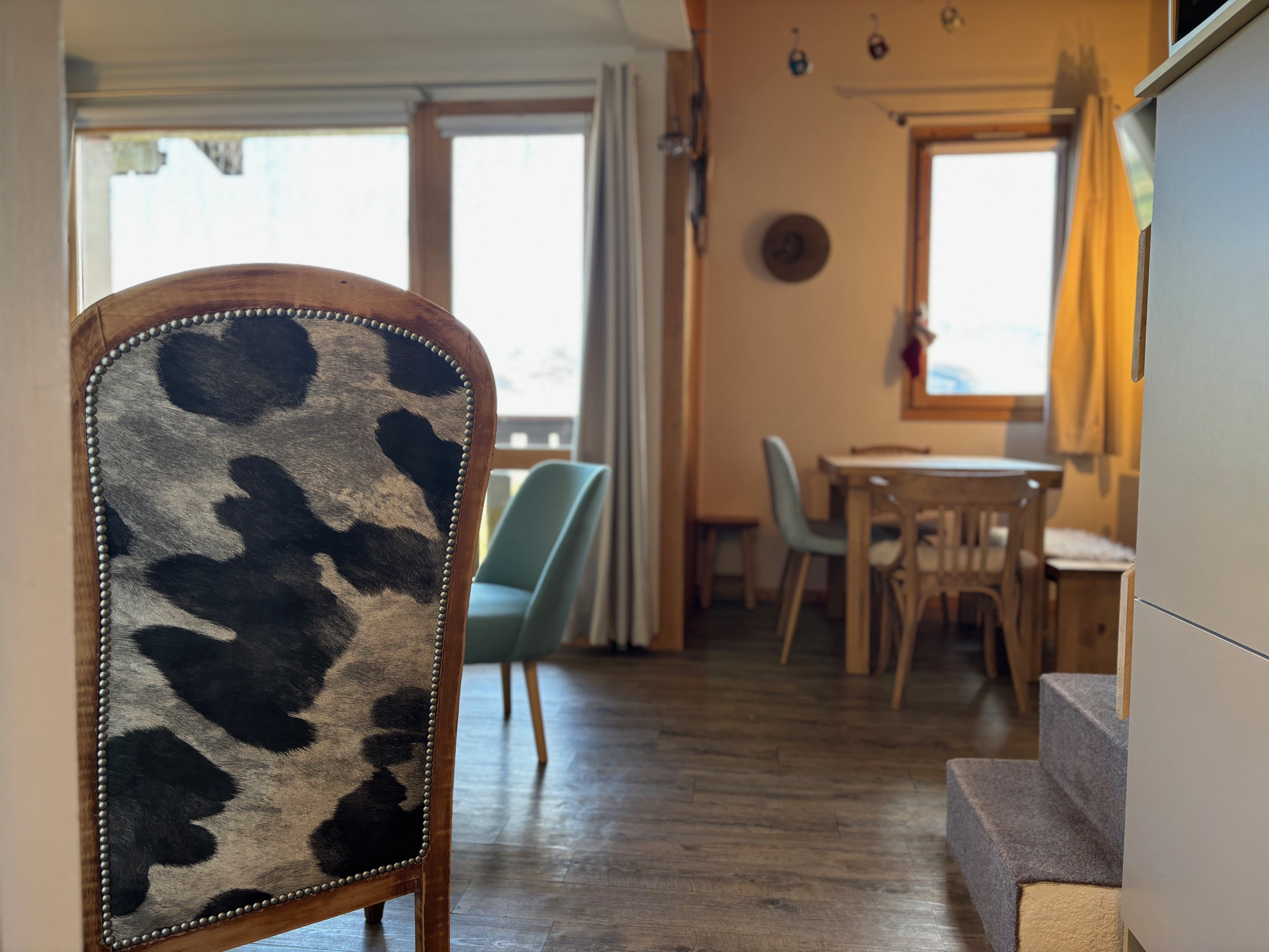 Séjour : canapé, télévision écran plat, coin repas. balcon avec vue vallée et Mont Blanc.