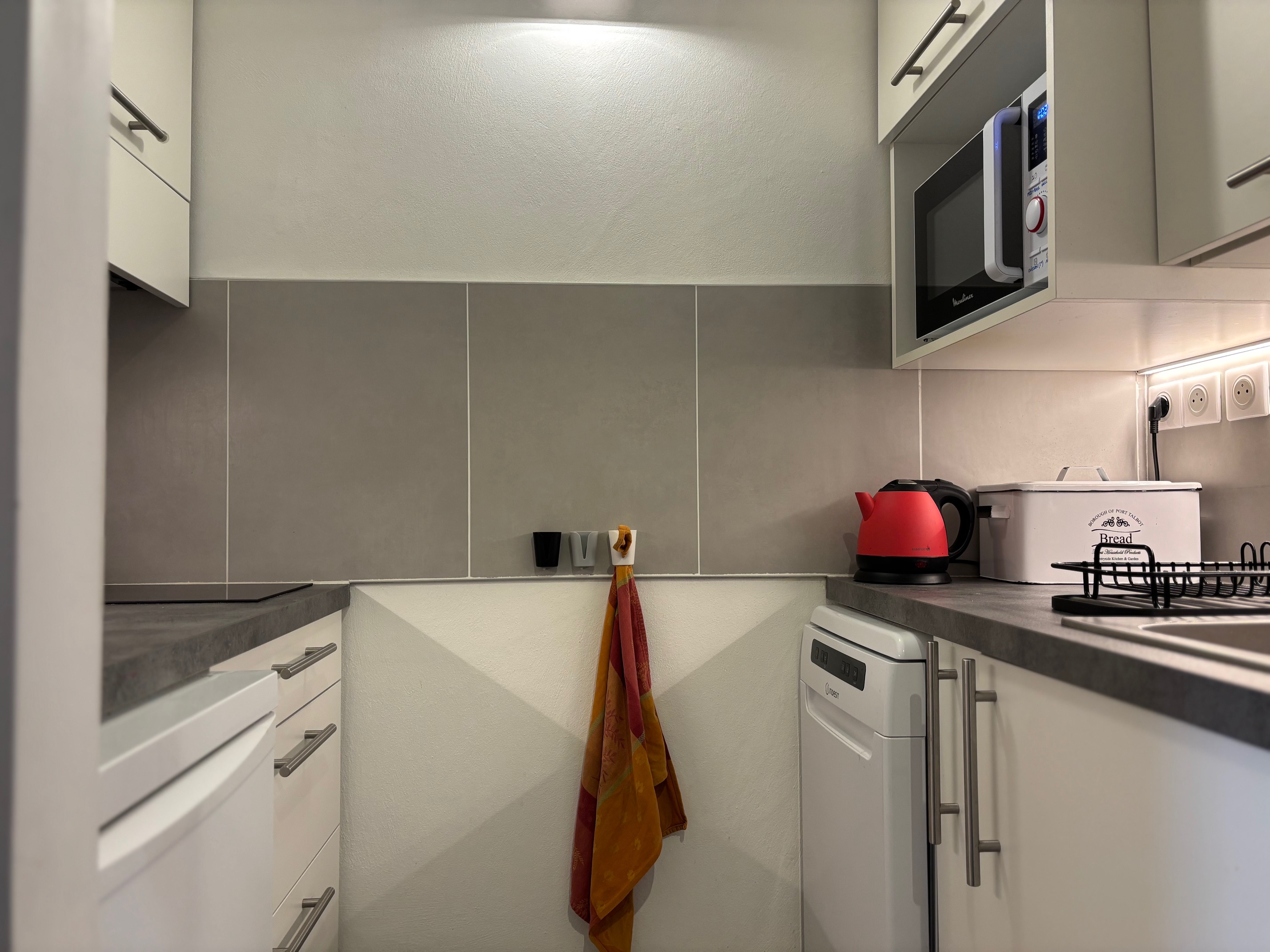 Coin cuisine : 2 plaques à induction, hotte, réfrigérateur, lave-vaisselle, micro-ondes, cafetière NESPRESSO, bouilloire et grille pain.