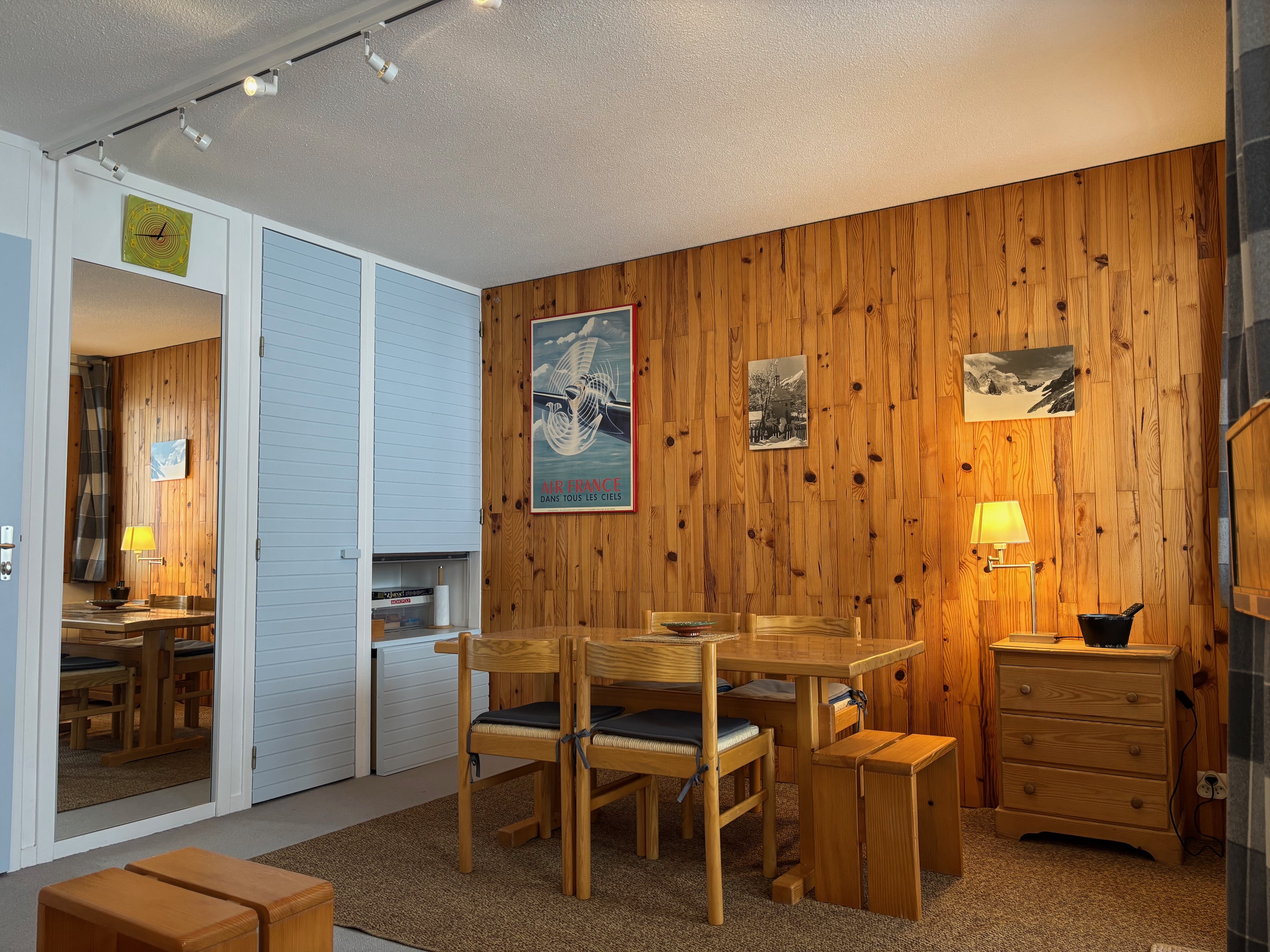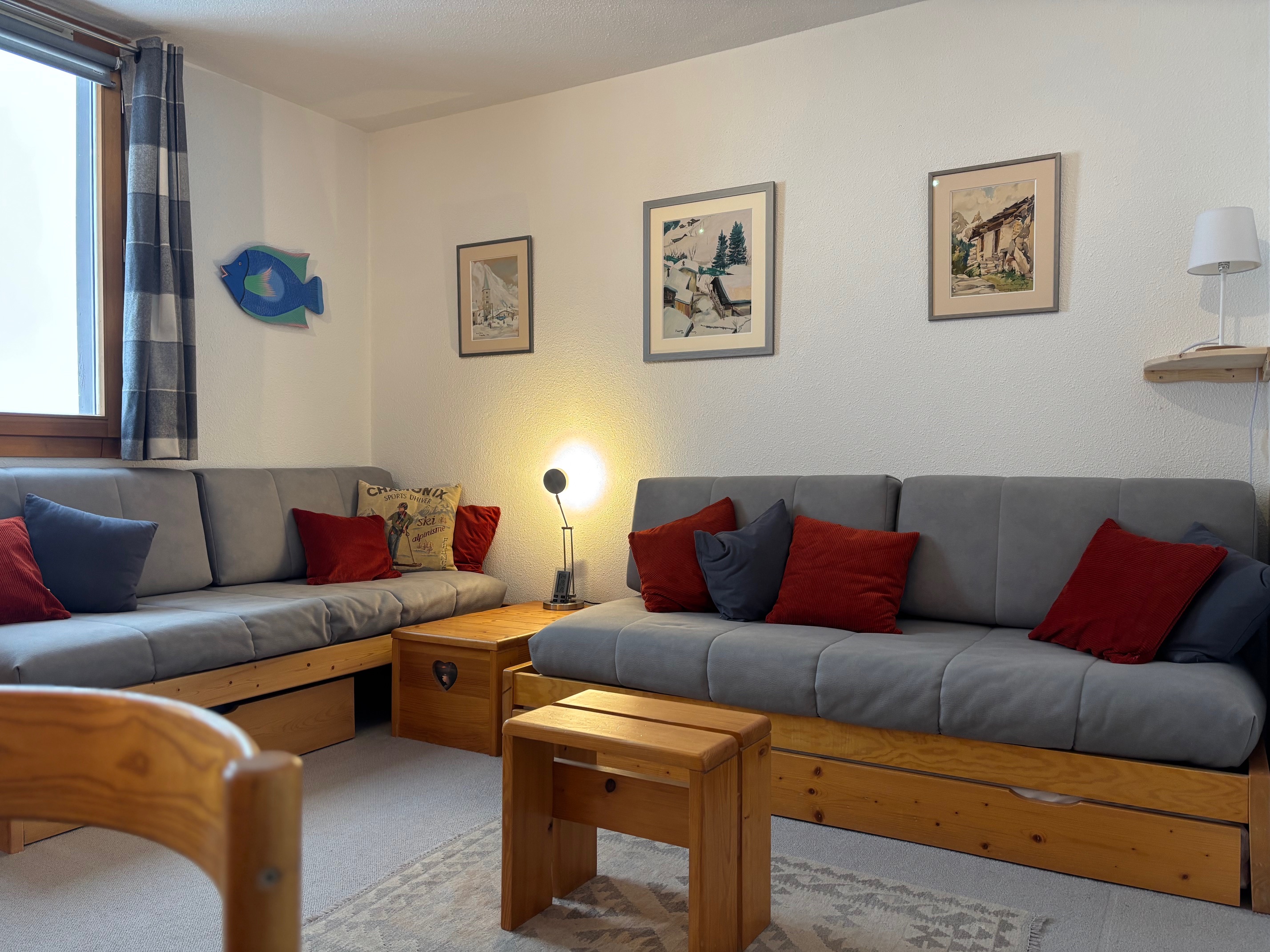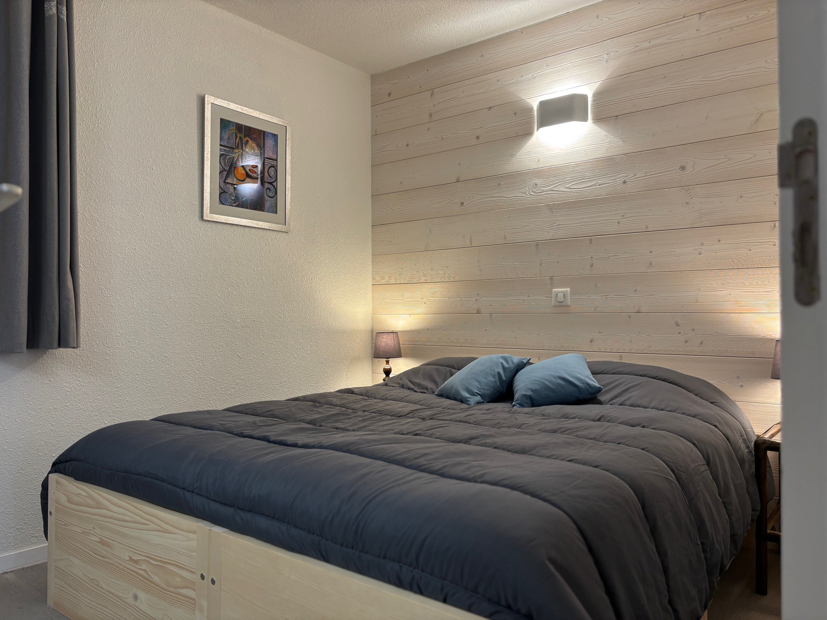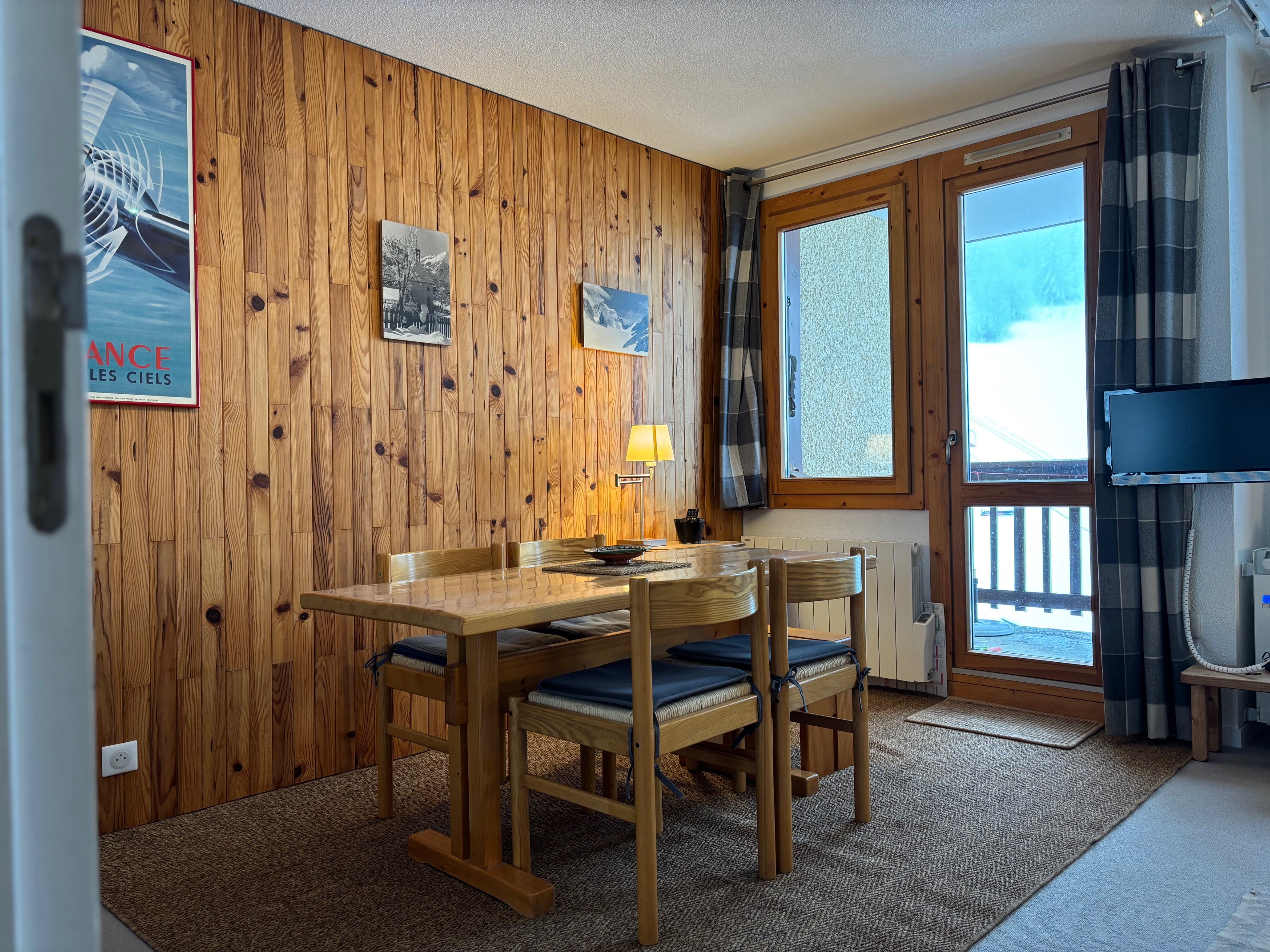 Appartement 2 pièces + séjour divisible équipé pour 5 personnes d'environ 35 m², entièrement rénové, exposé sud/ouest avec balcon/terrasse, côté village et pistes, au premier étage.